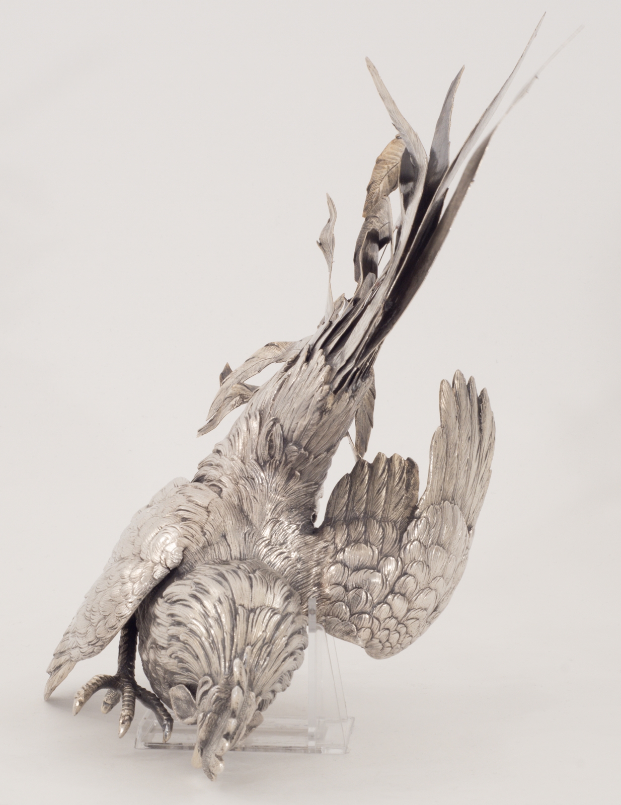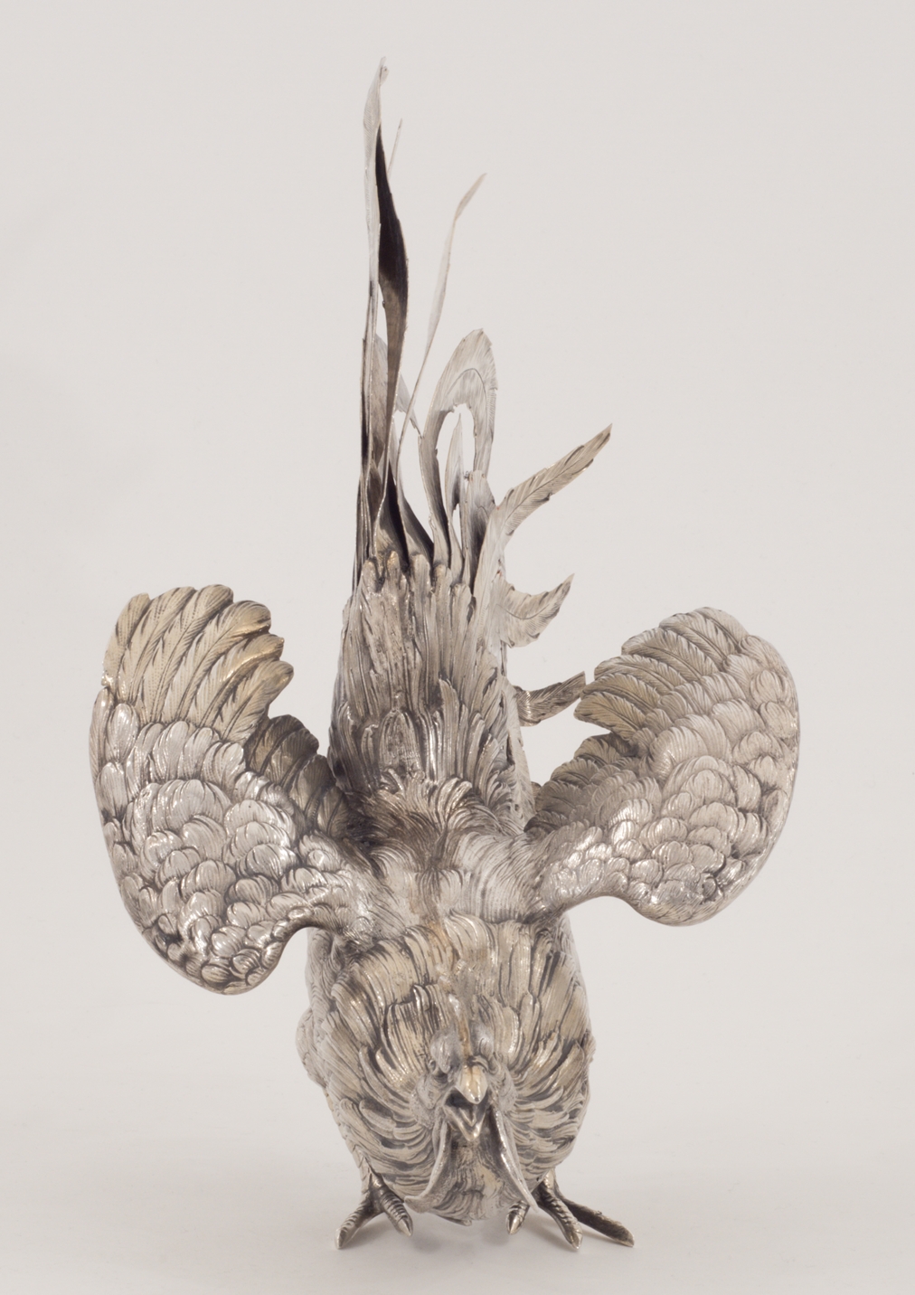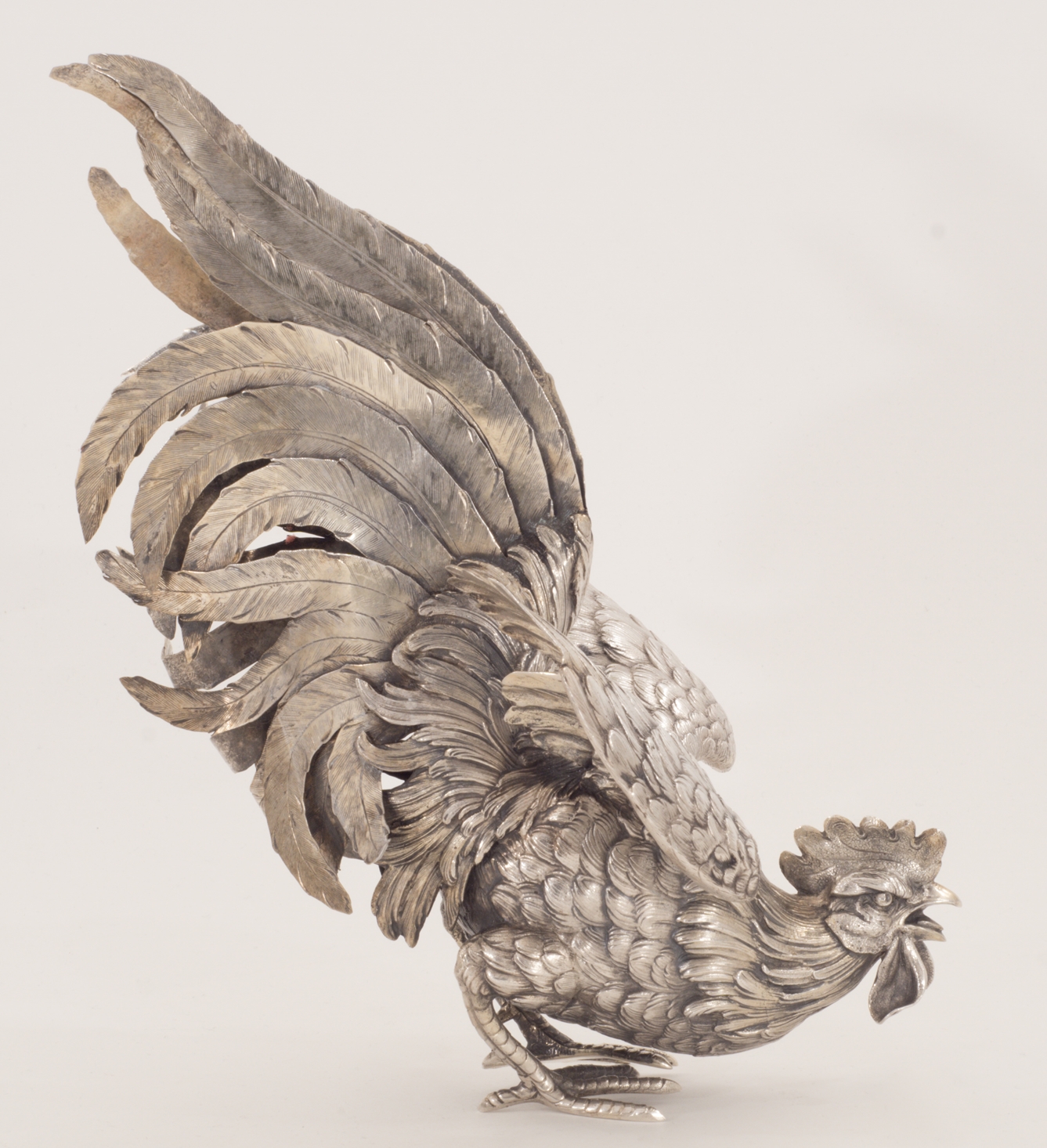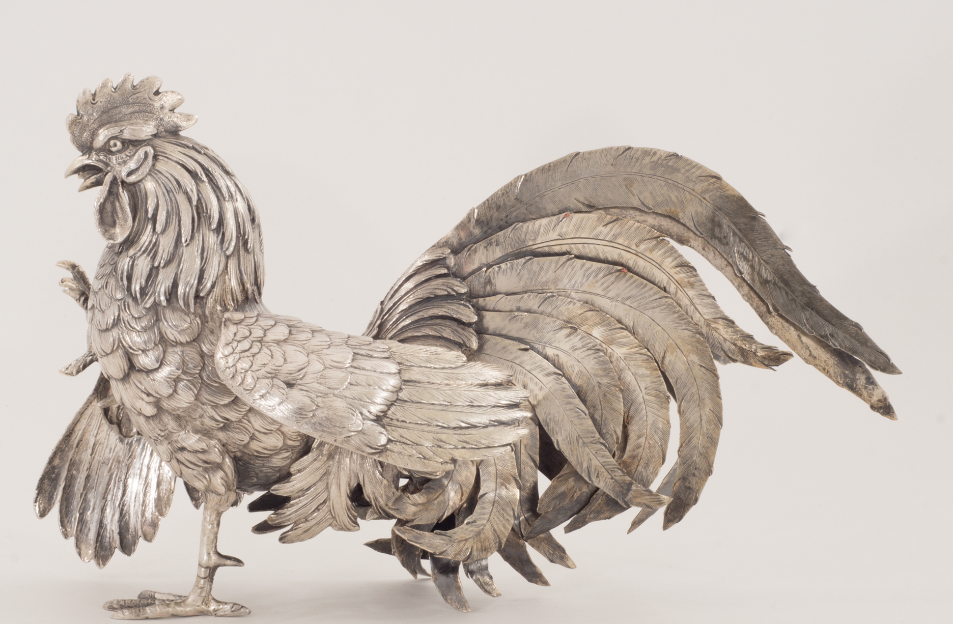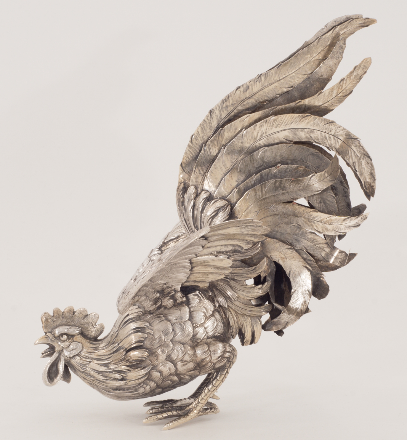 Zwei Kampfhähne in 800er Silber in Kampfpose – aufwendig gearbeitet.