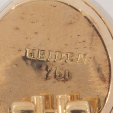 Ausgefasst mit zwei Sternrubin Cabochons von zusammen ca. 4 ct. und 32 Brillanten zusammen ca. 0,6 ct. Meistermarke: Theodor Heiden, München