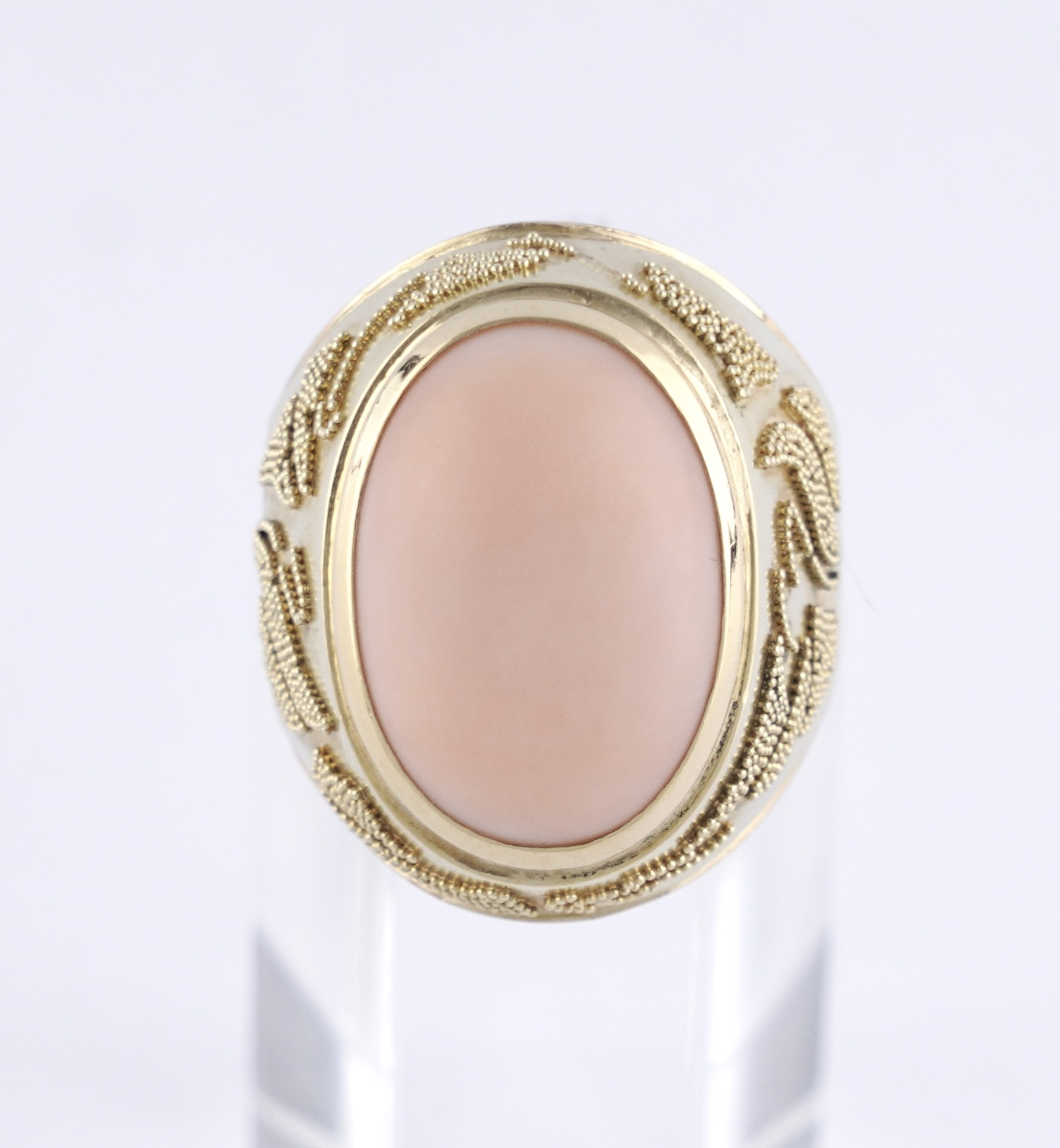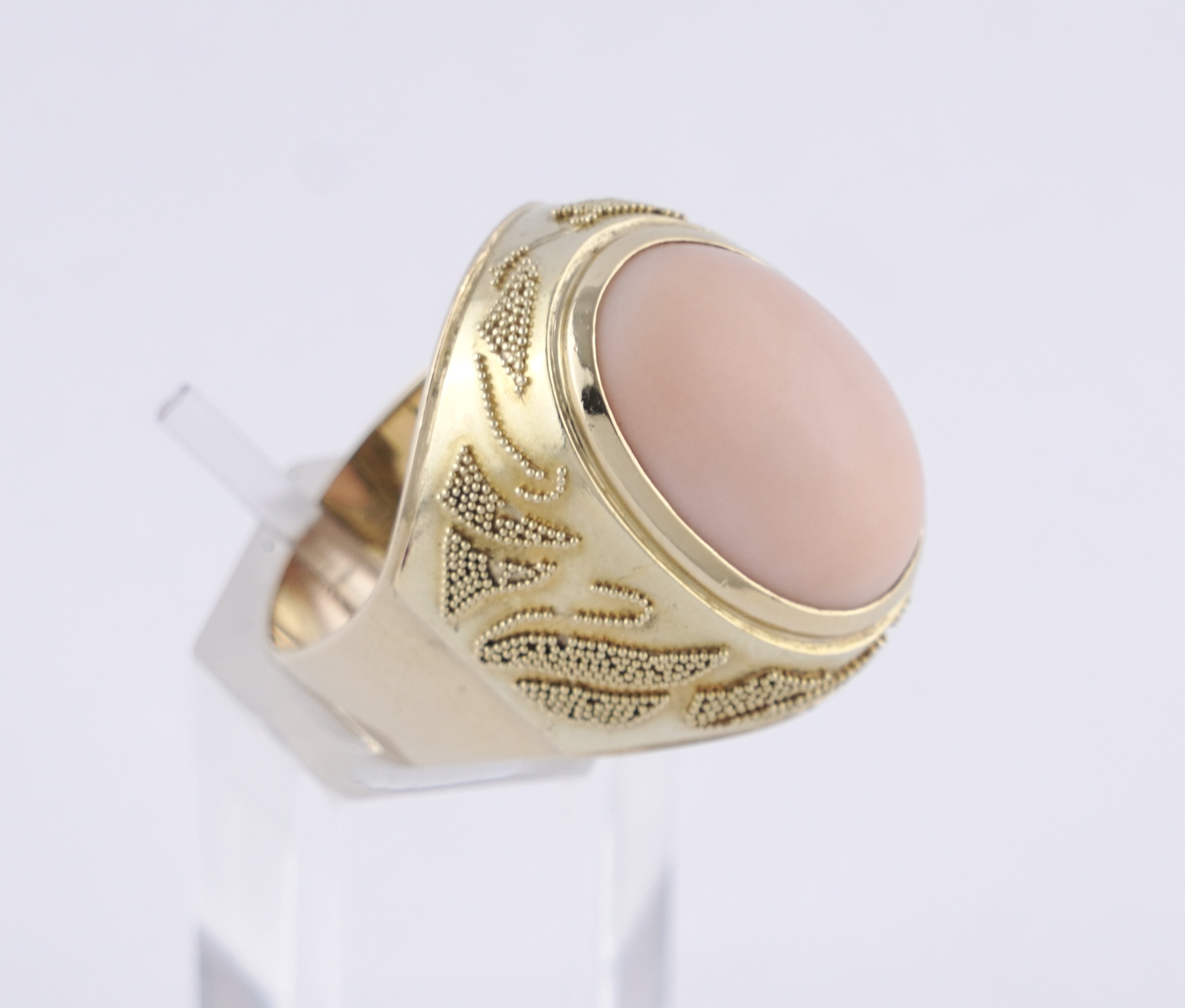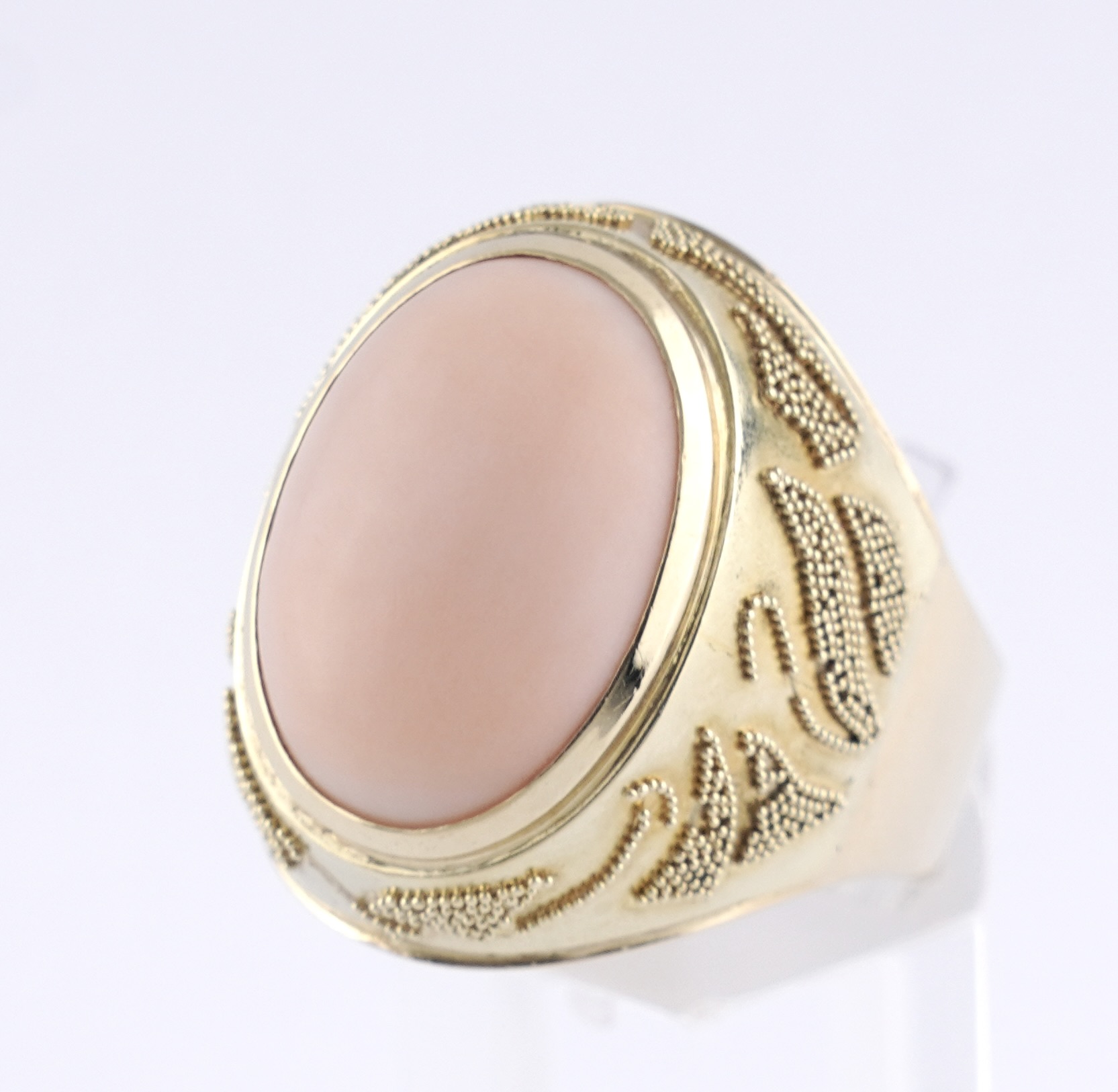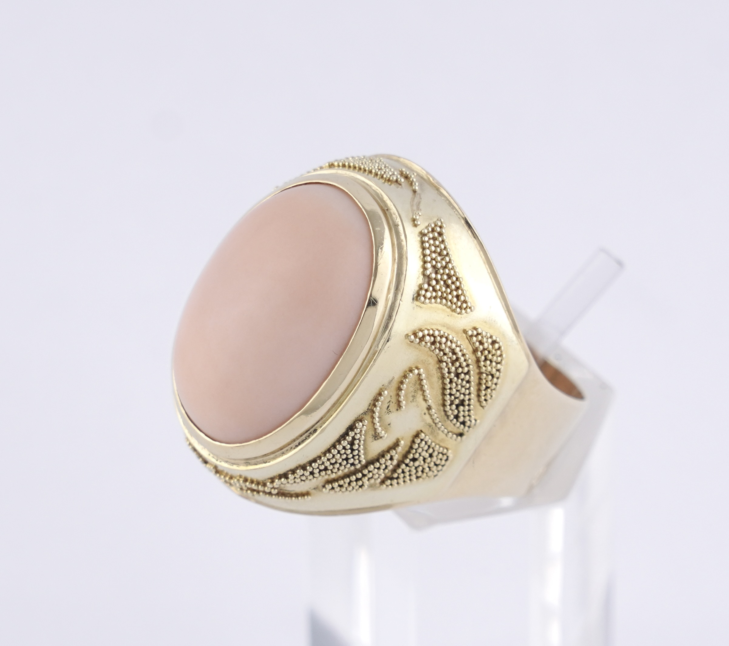 Ein Cocktailring in 14 Karat Gelbgold mit Engelshautkoralle