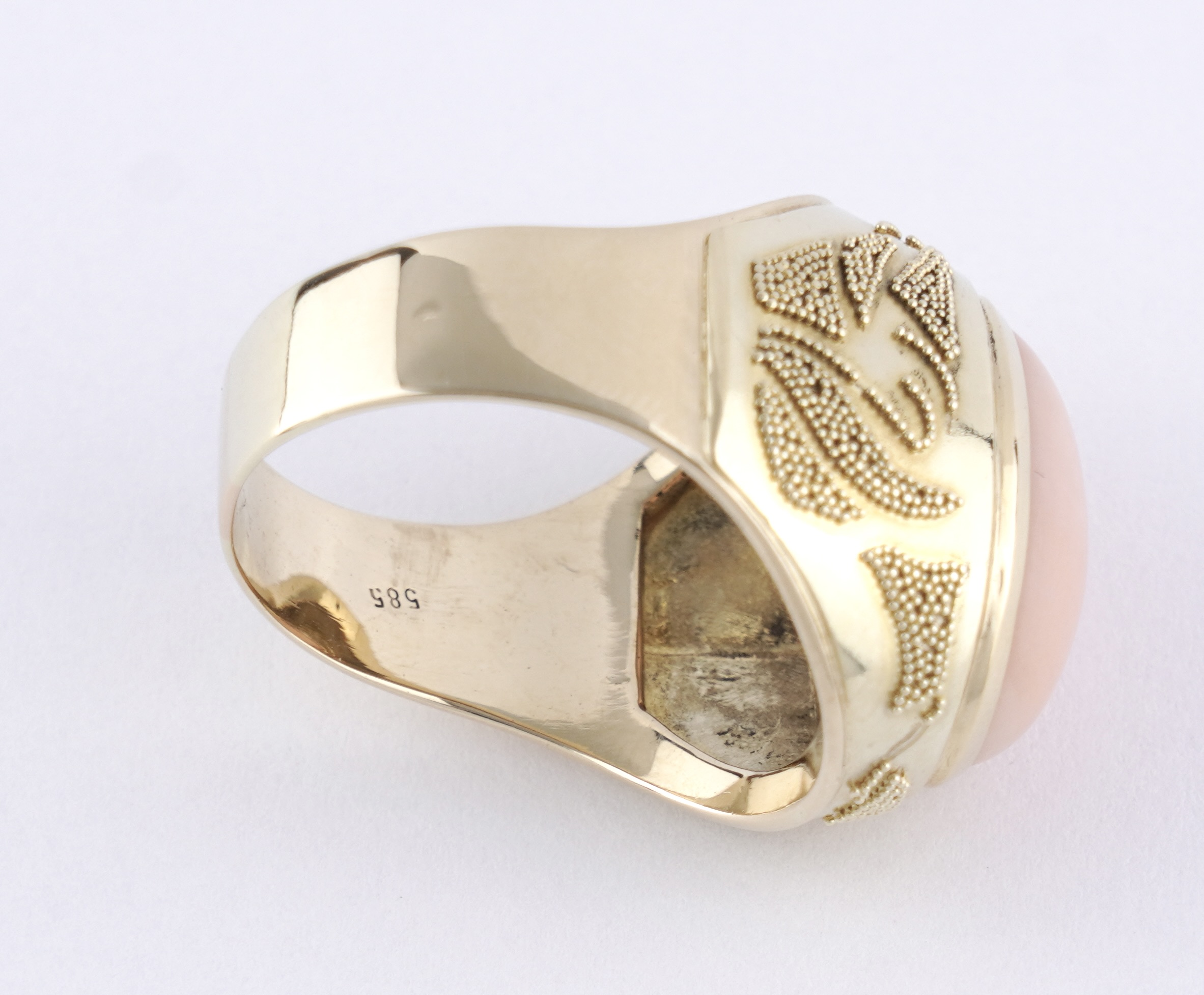Ein Cocktailring gearbeitet in 14 Karat (585/1000) Gelbgold mit Engelshautkoralle und feiner Granulierung.