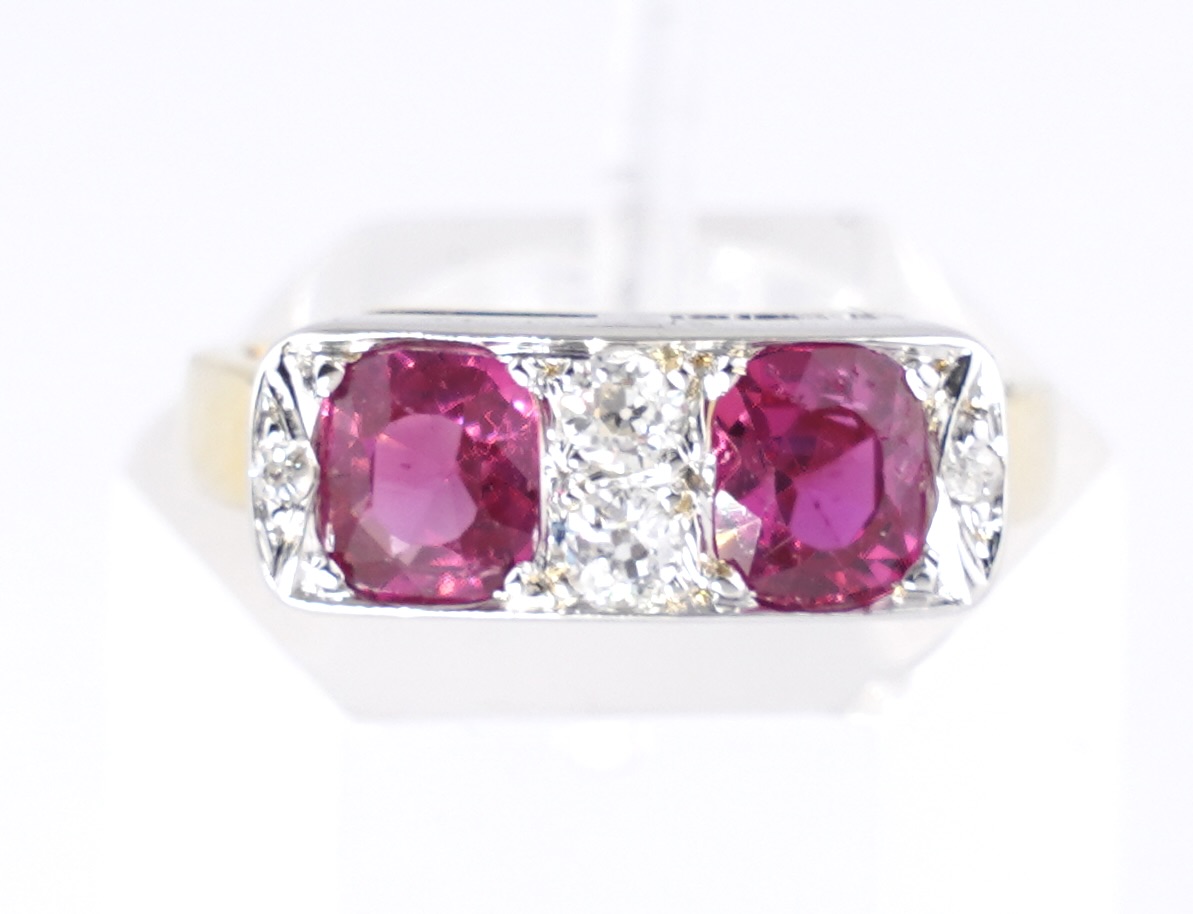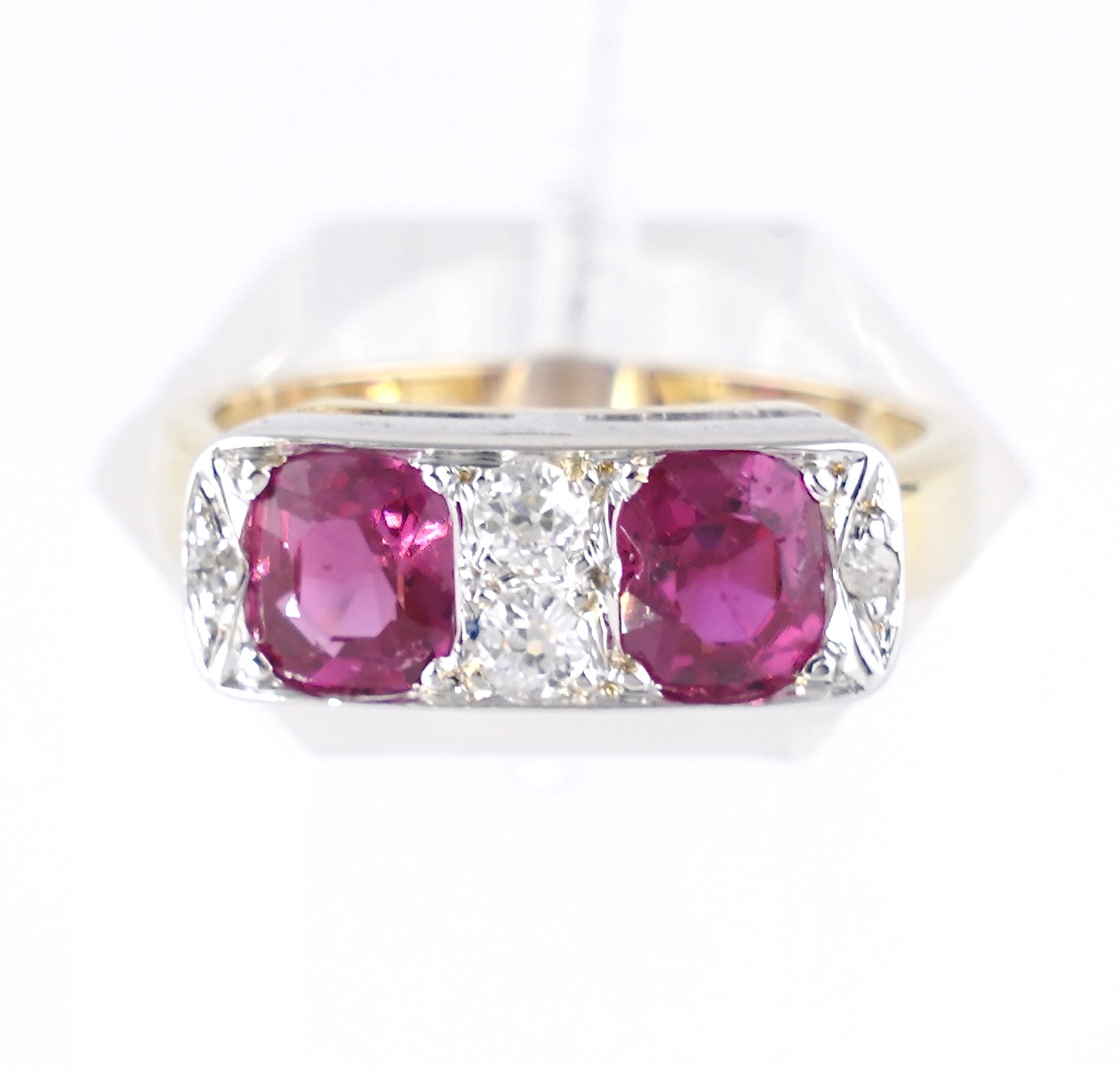 Ein Rubinring in 14 Karat (585/1000) Gelb- und Weißgold mit 2 ovalen Rubinen von zusammen ca.1,4 ct. und 4 kleinen Altschliff-Diamanten von zusammen ca. 0,2 ct.