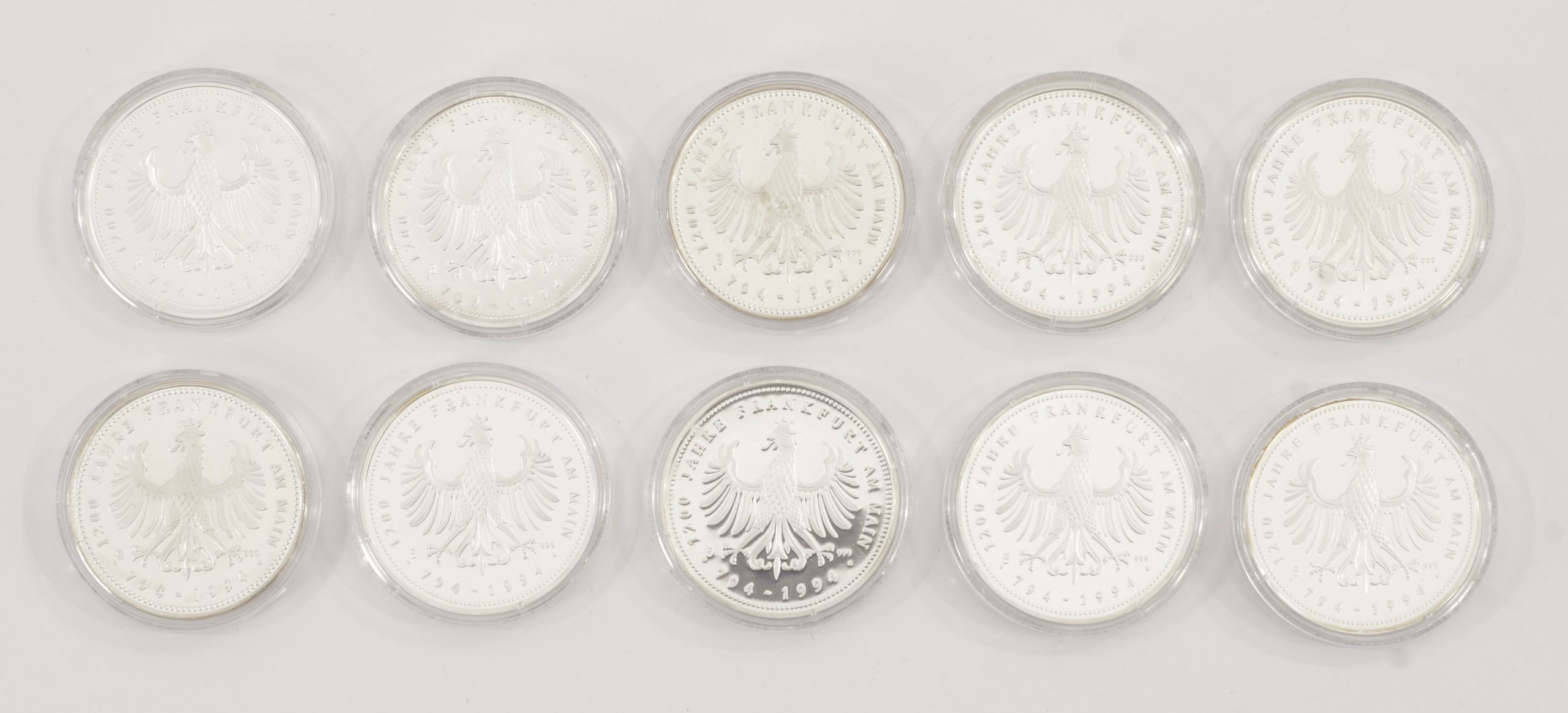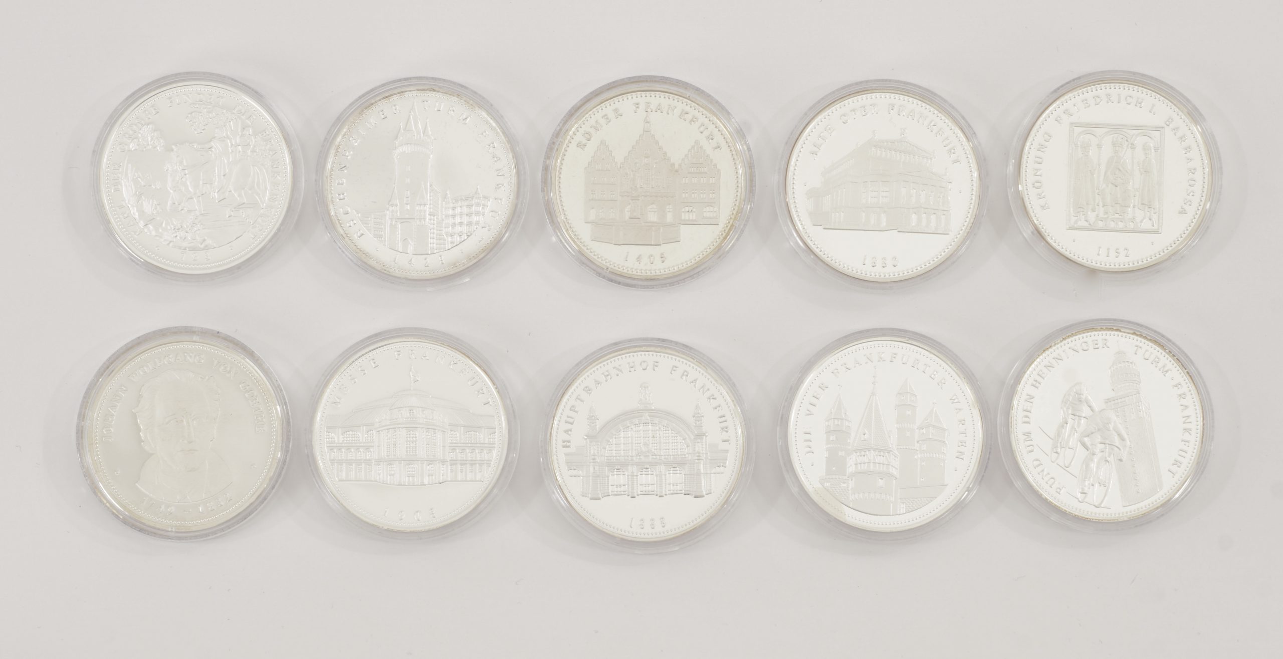 Ein Satz von 10 Silbermedaillen in 999/1000 Silber – ausgegeben anlässlich des 1200 jährigen Jubiläum der Stadt Frankfurt am Main – 1994.