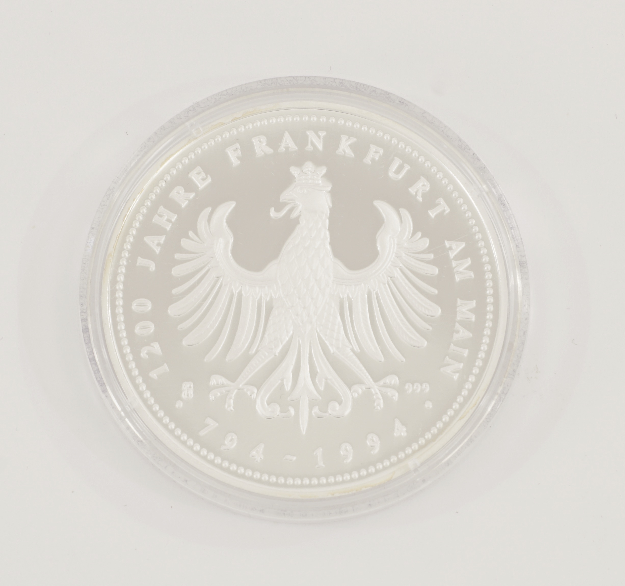 Revers ein, dem Frankfurter Thaler nachempfundener, Frankfurter Adler und die Umschrift „1200 Jahre Frankfurt am Main 794 – 1994“.