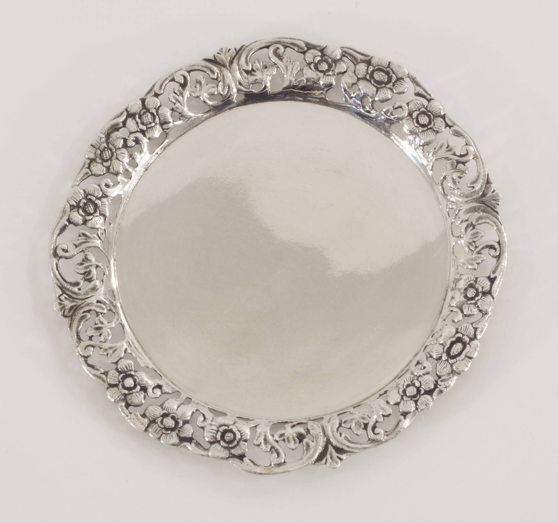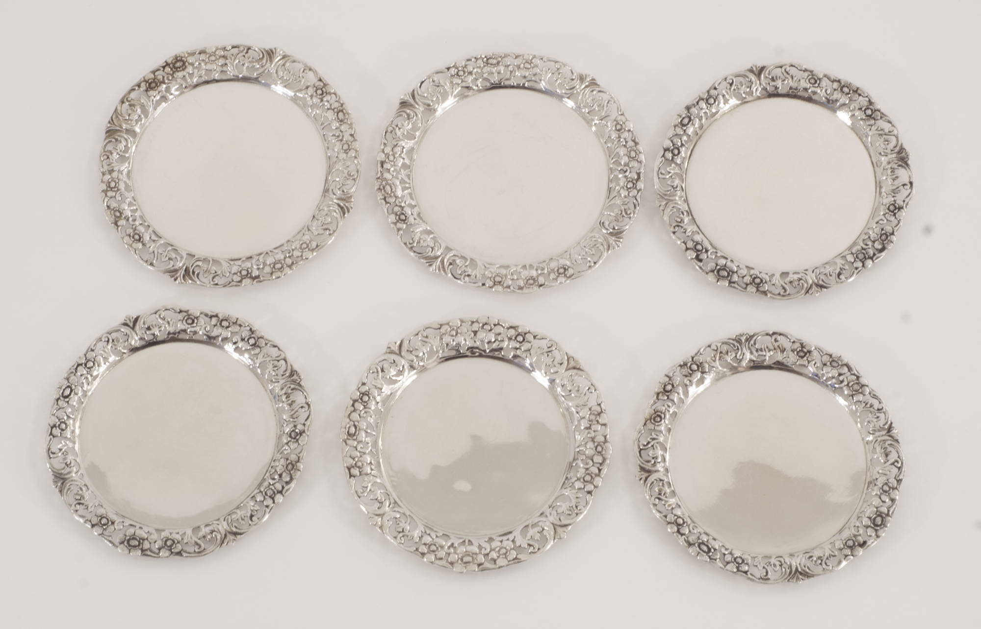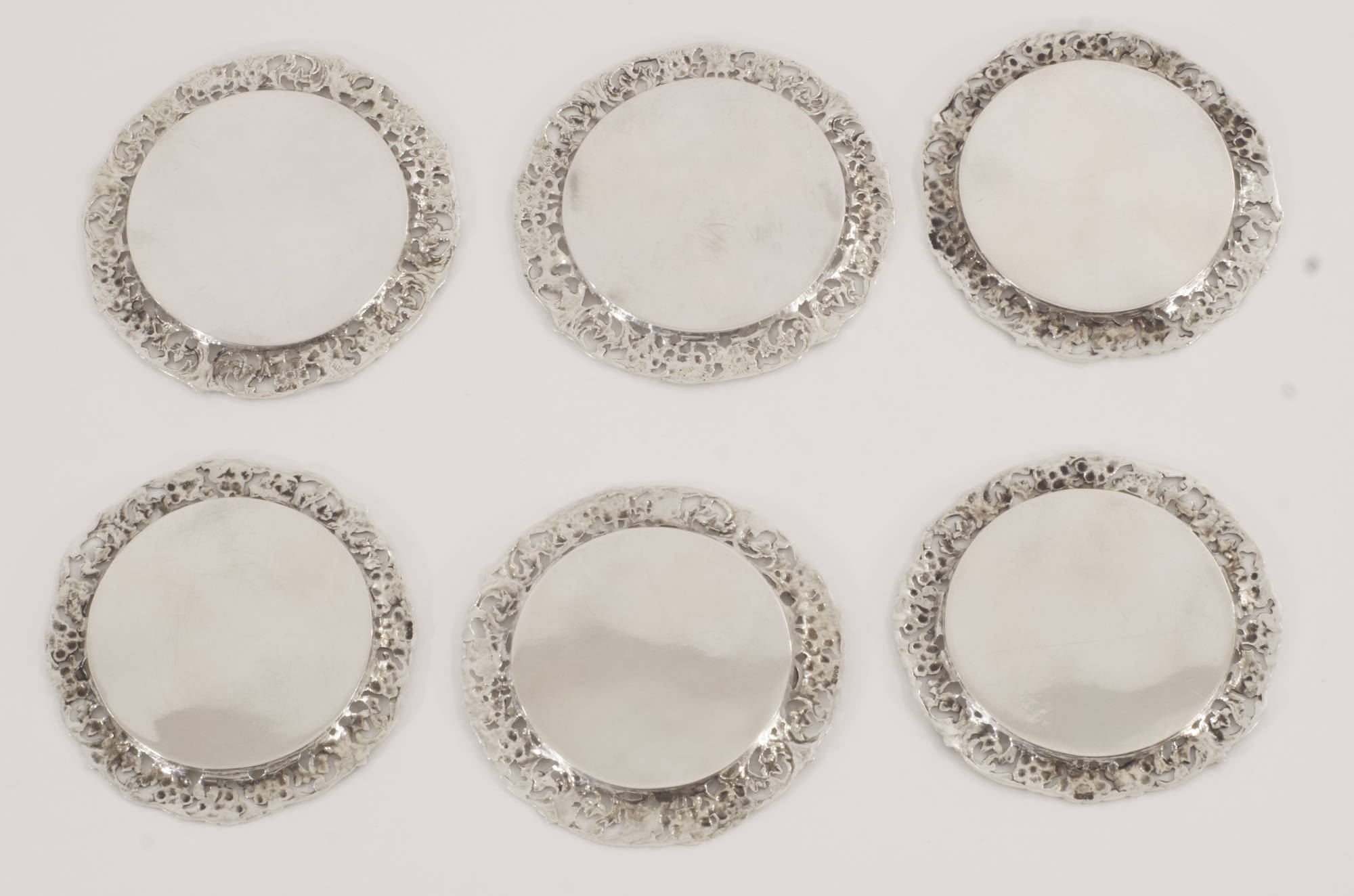 Ein Satz von 6 Glasuntersetzern in 800er (4 Untersetzer) und 835er (2 Untersetzer) Silber. Der Rand ist umlaufend durchbrochen gearbeitet mit floralem Dekor.