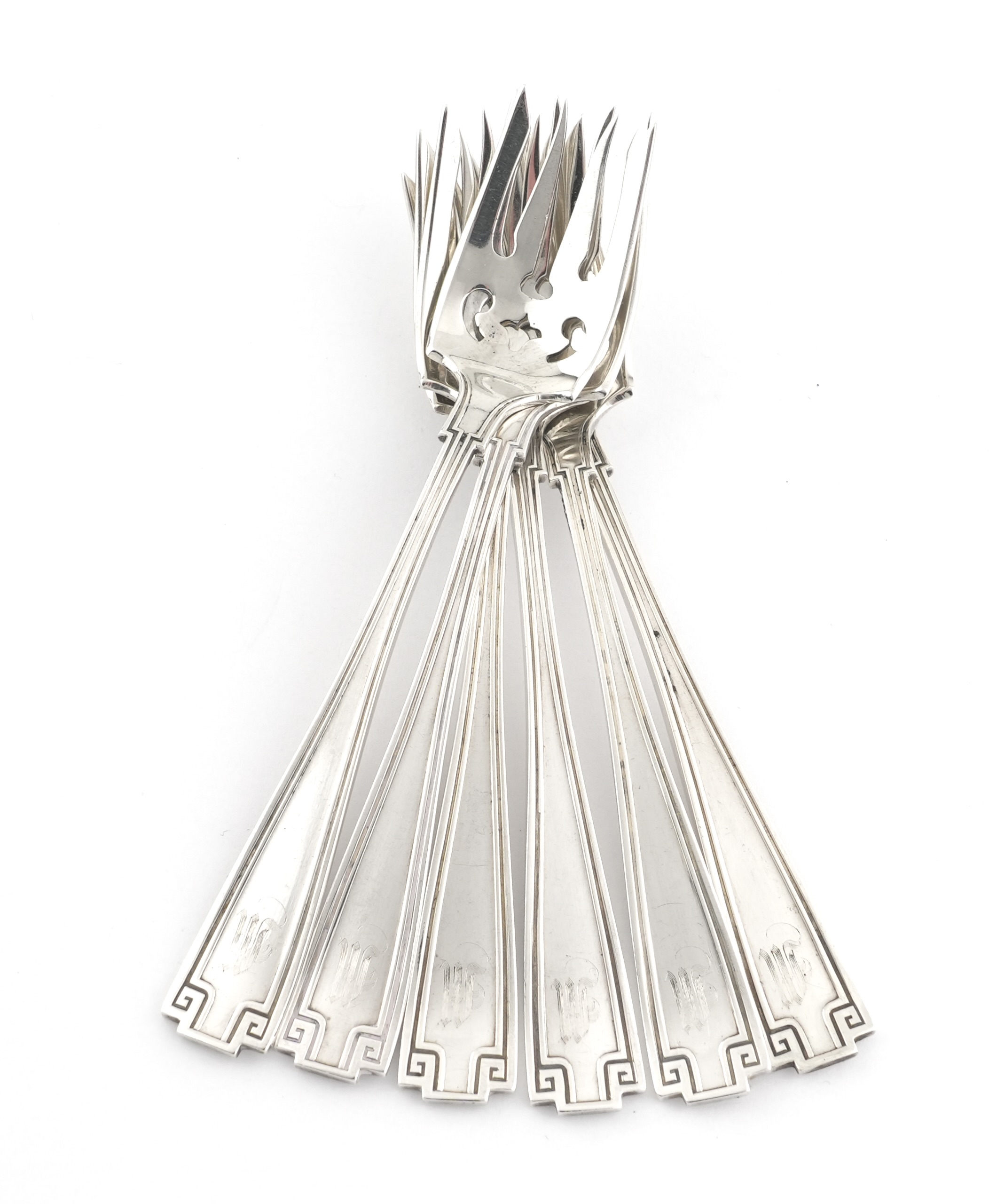 Ein Satz von 6 seltenen Petit Four Gabeln gearbeitet in 925 Sterlingsilber – Modell „Etruscan“ – Gorham USA.