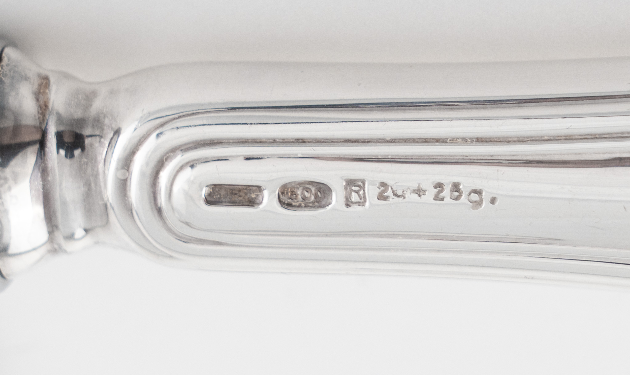 Ein Satz von 7 Bestecken für eine Person, gearbeitet in 800/1000 Silber im Dekor Rundfaden.