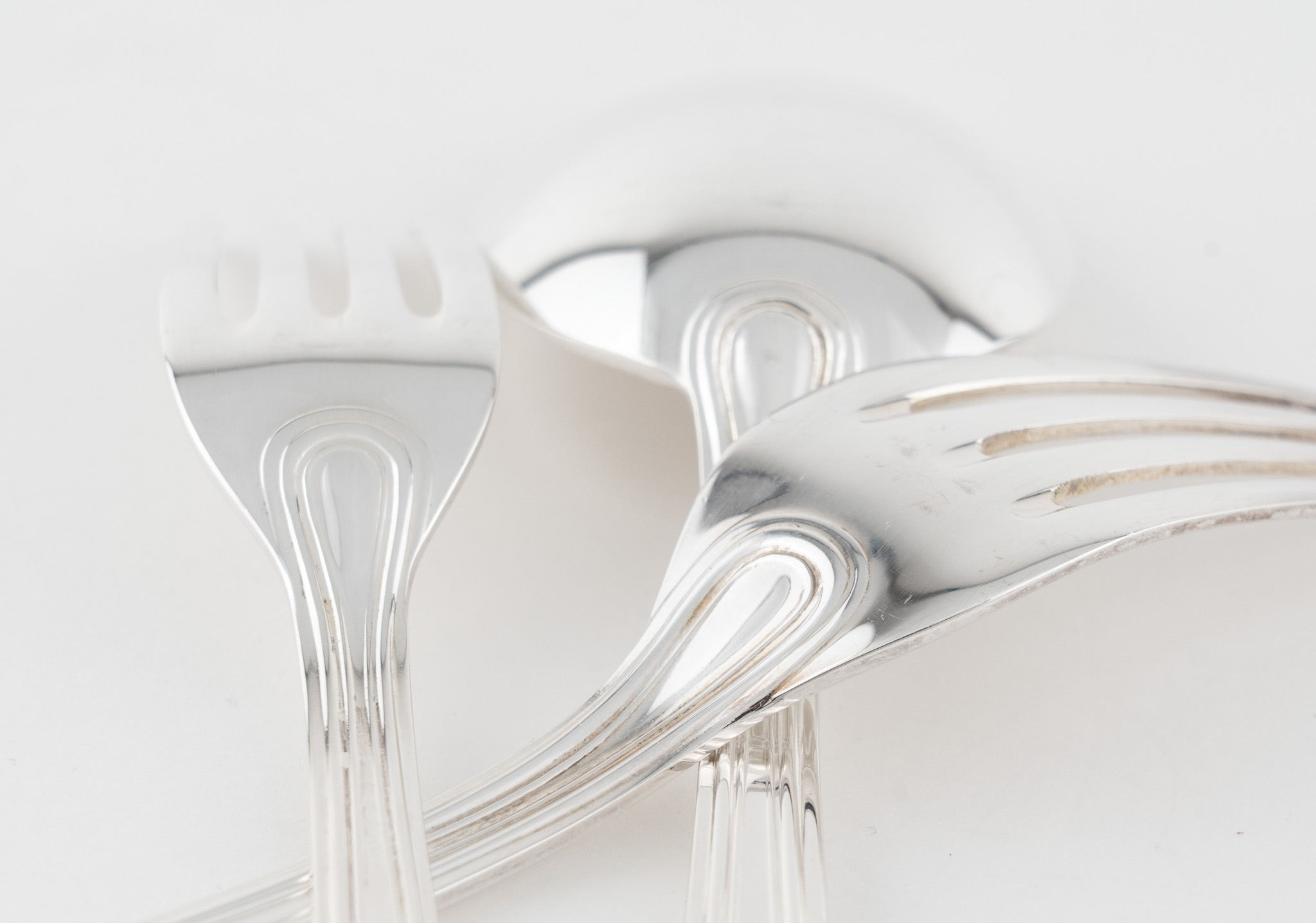 Der Satz bestehend aus einer Menügabel, Menümesser, Menülöffel, Vorspeiselöffel, Vorspeisegabel, Kuchengabel und Mokkalöffel.