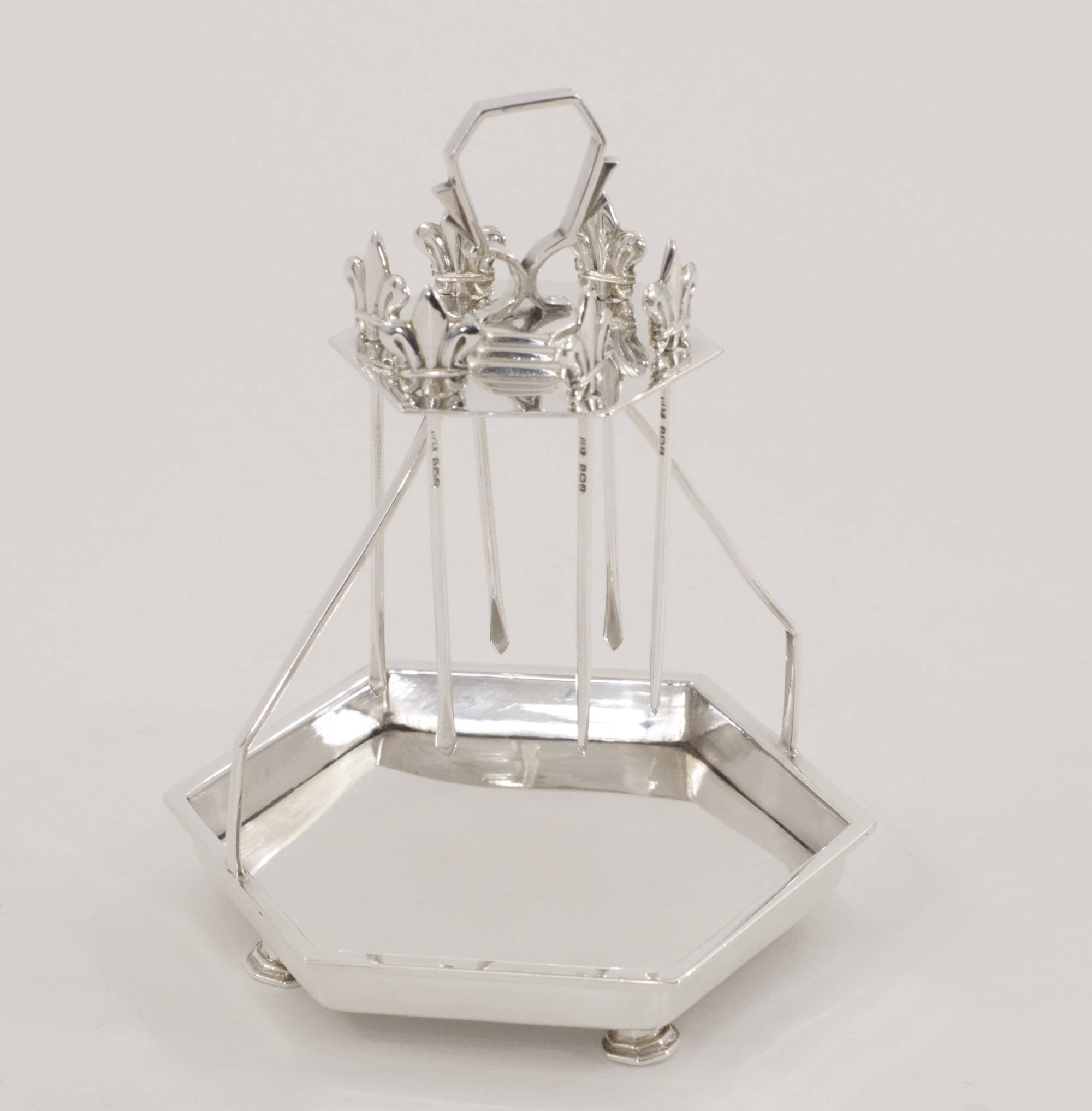 Ein Set bestehend aus 6 Käse- oder Olivenpiekser und einem Stand im Stil des Arts and Crafts/ Art Deco. Pieksergriff gearbeitet in Form einer Lilie.