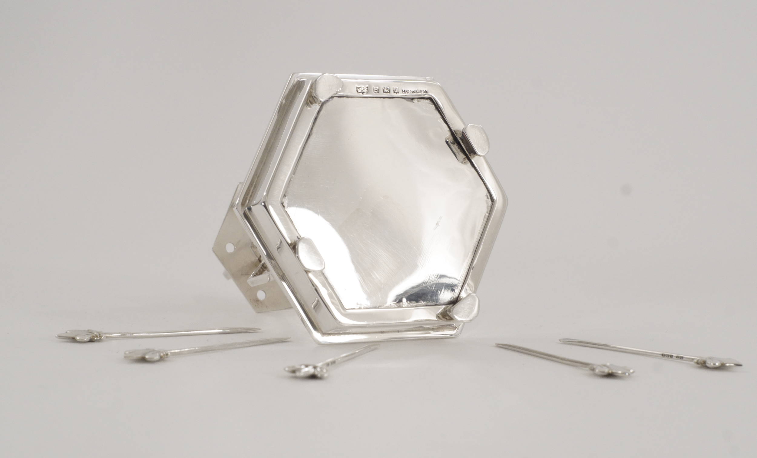 Ein Set mit 6 Käse- oder Olivenpiekser und Stand - gearbeitet in 925 Silber