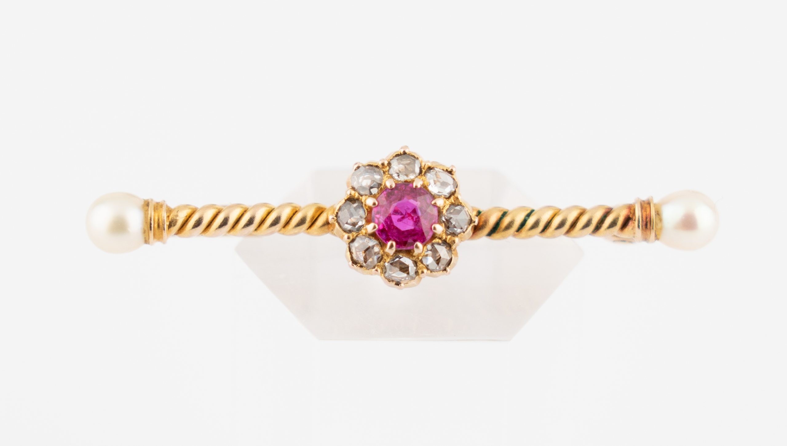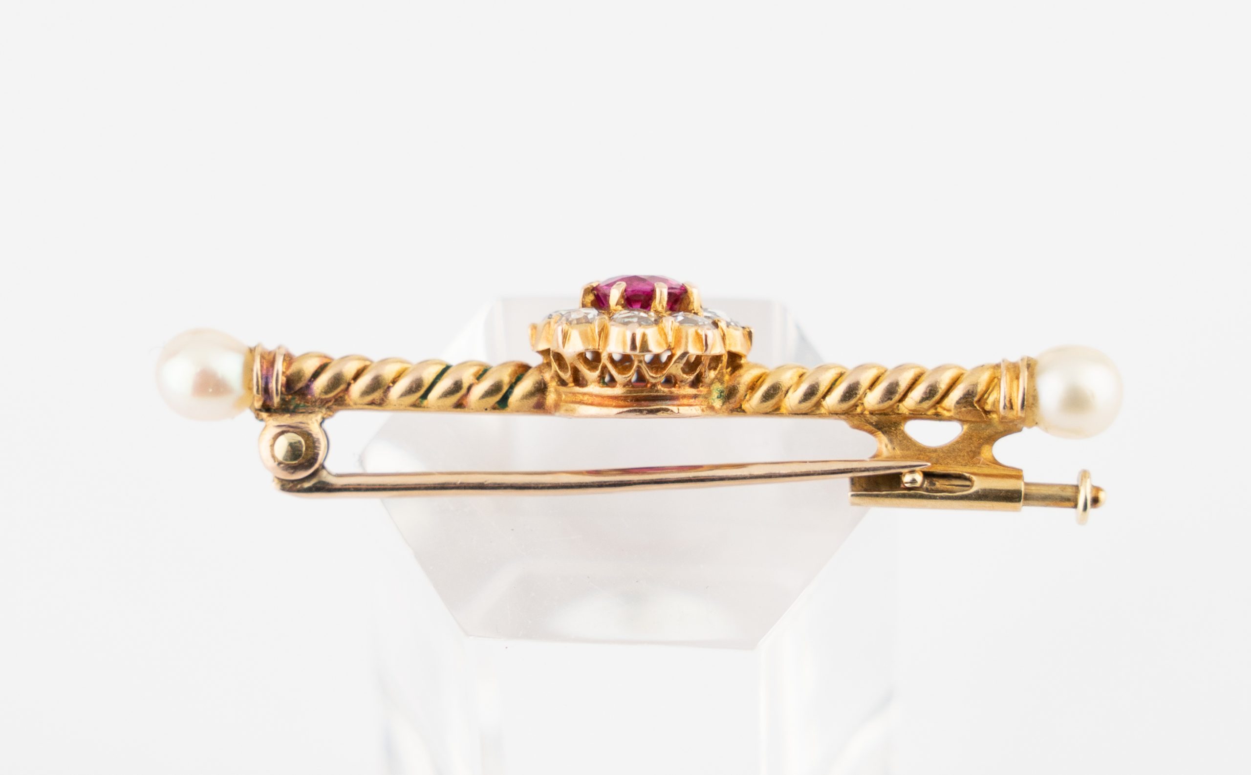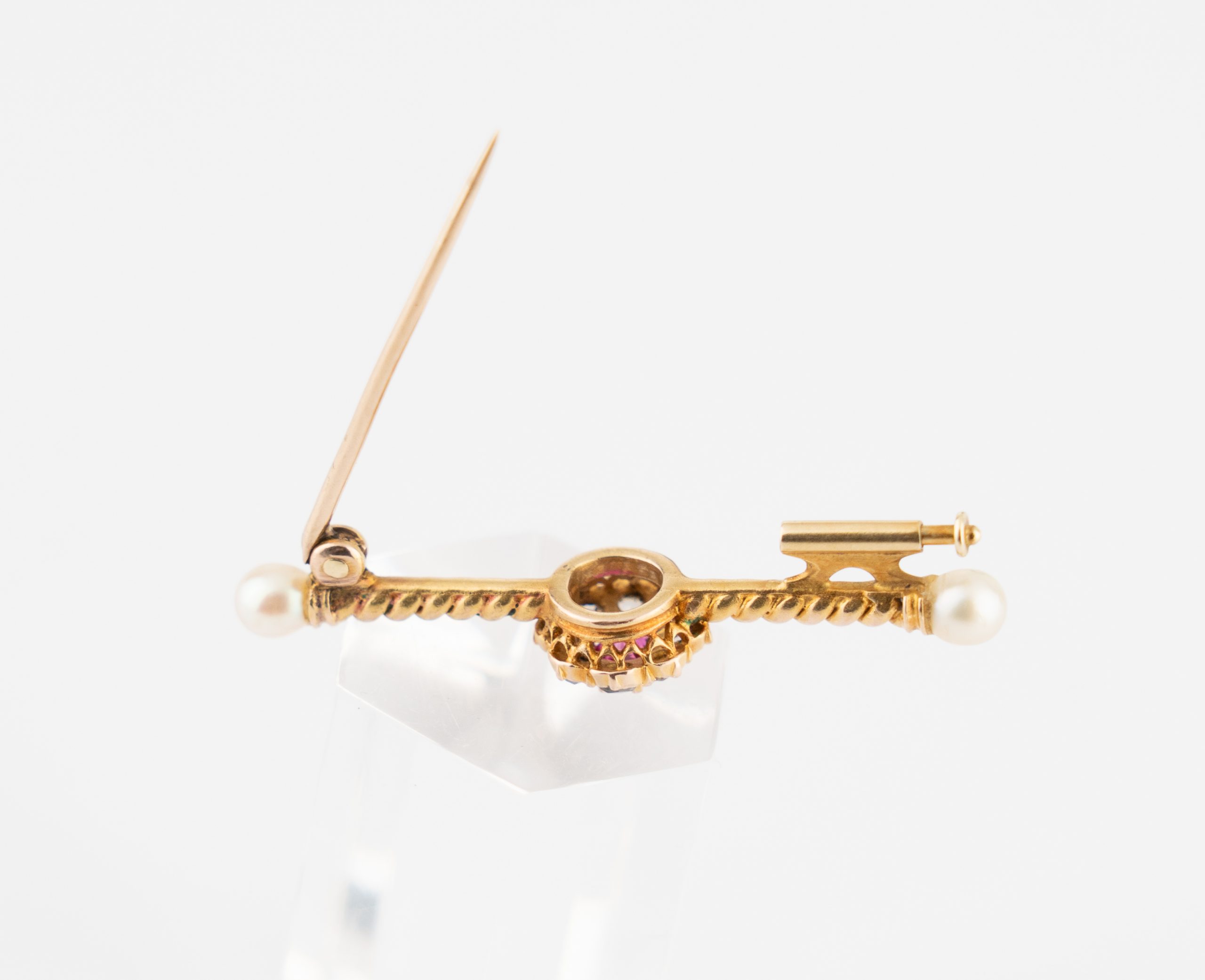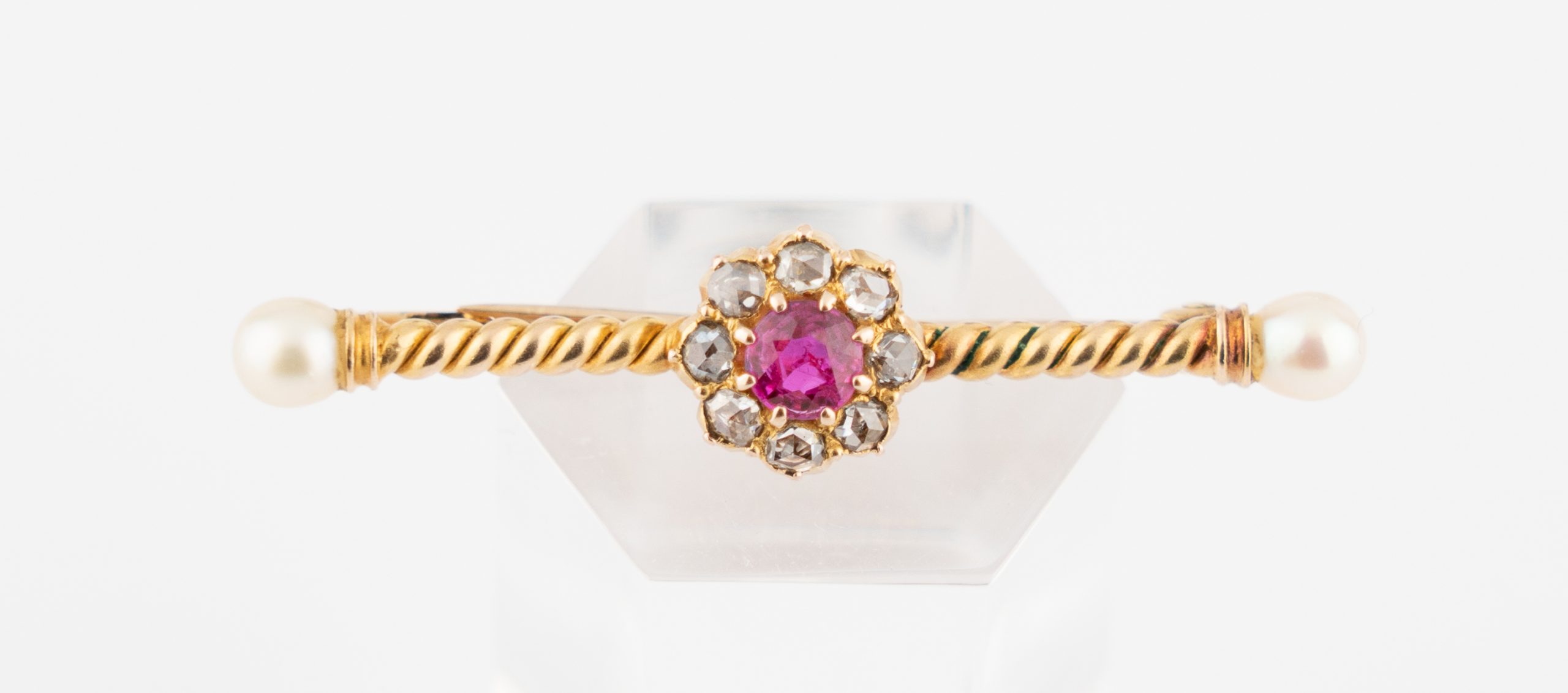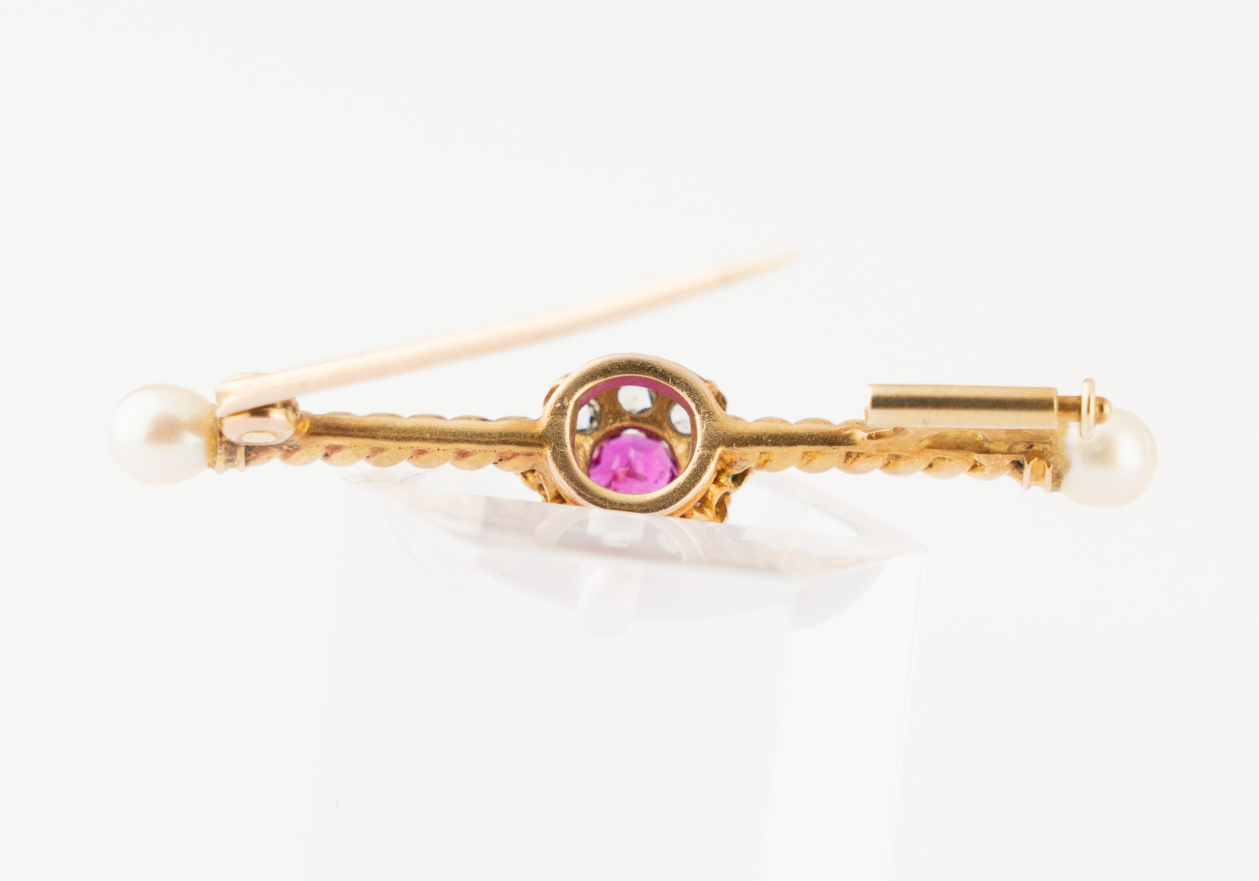 Eine aparte Stabnadel gearbeitet in 14 Karat (585/1000) Gelbgold mit einem Rubin von ca. 0,3 ct. und 8 Diamanten im Rosenschliff (Amsterdamer Rose) sowie 2 Perlen.