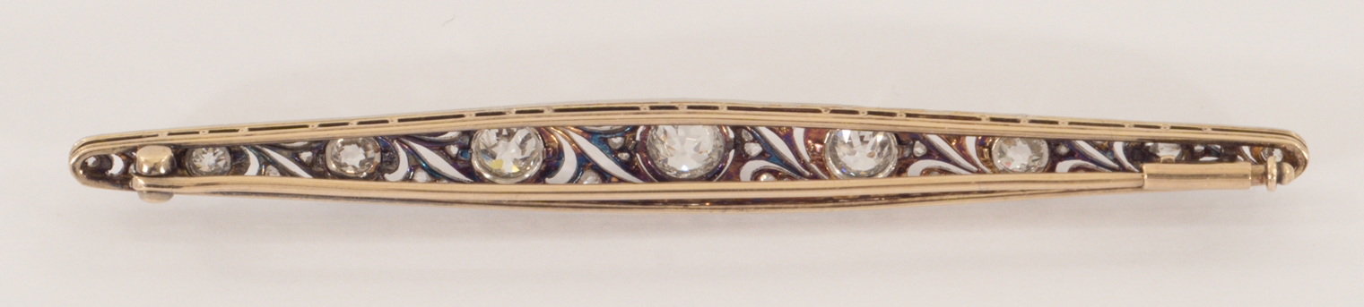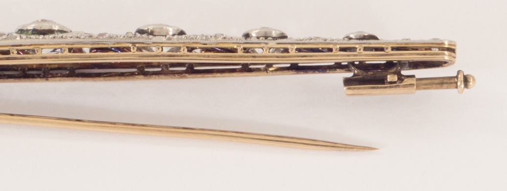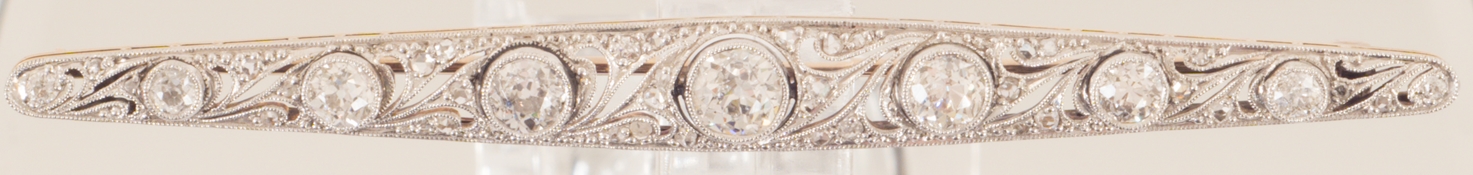 Eine Art Deco Stabnadel - Platin auf 18 Karat Gelbgold mit acht Altschliff- und Rosendiamanten von zus. ca. 1,6 ct.