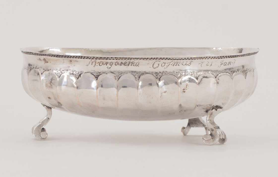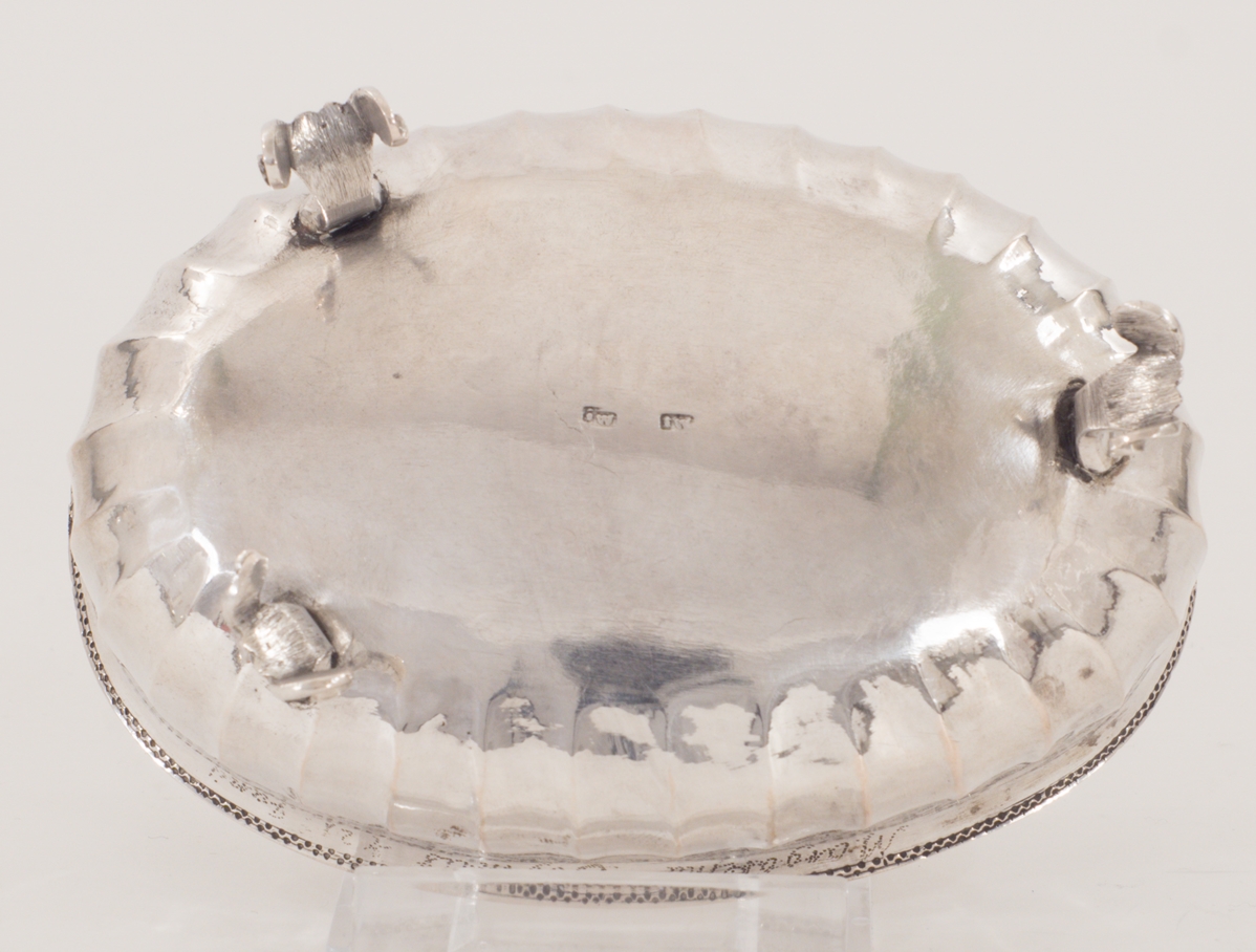 Eine aparte kleine Zuckerschale mit barockem Dekor auf drei geschwungenen Füßen, der Korpus umlaufend mit Kannelierung.