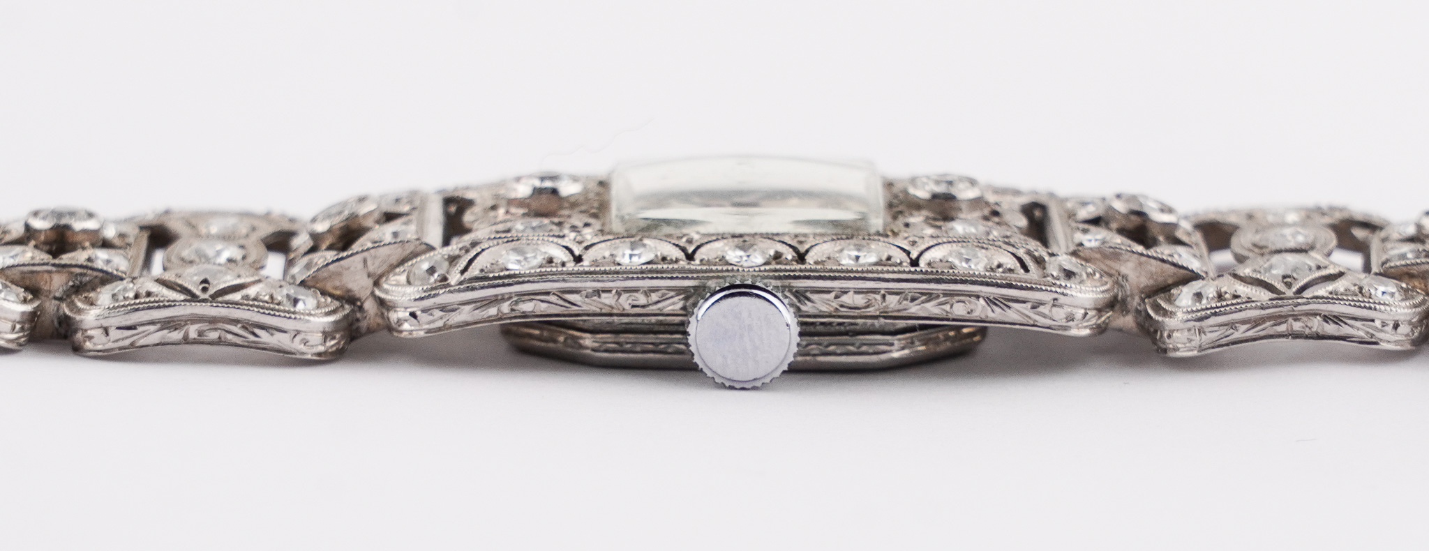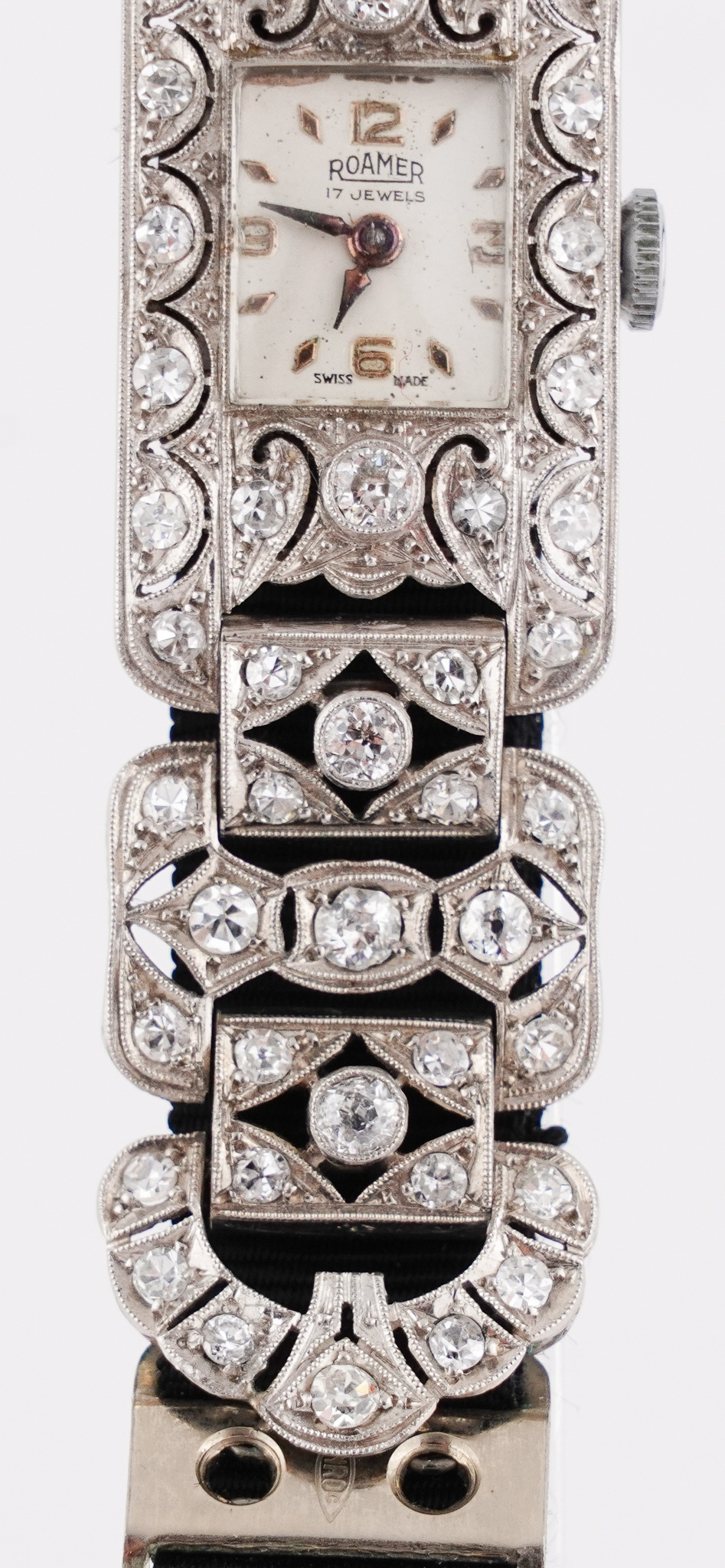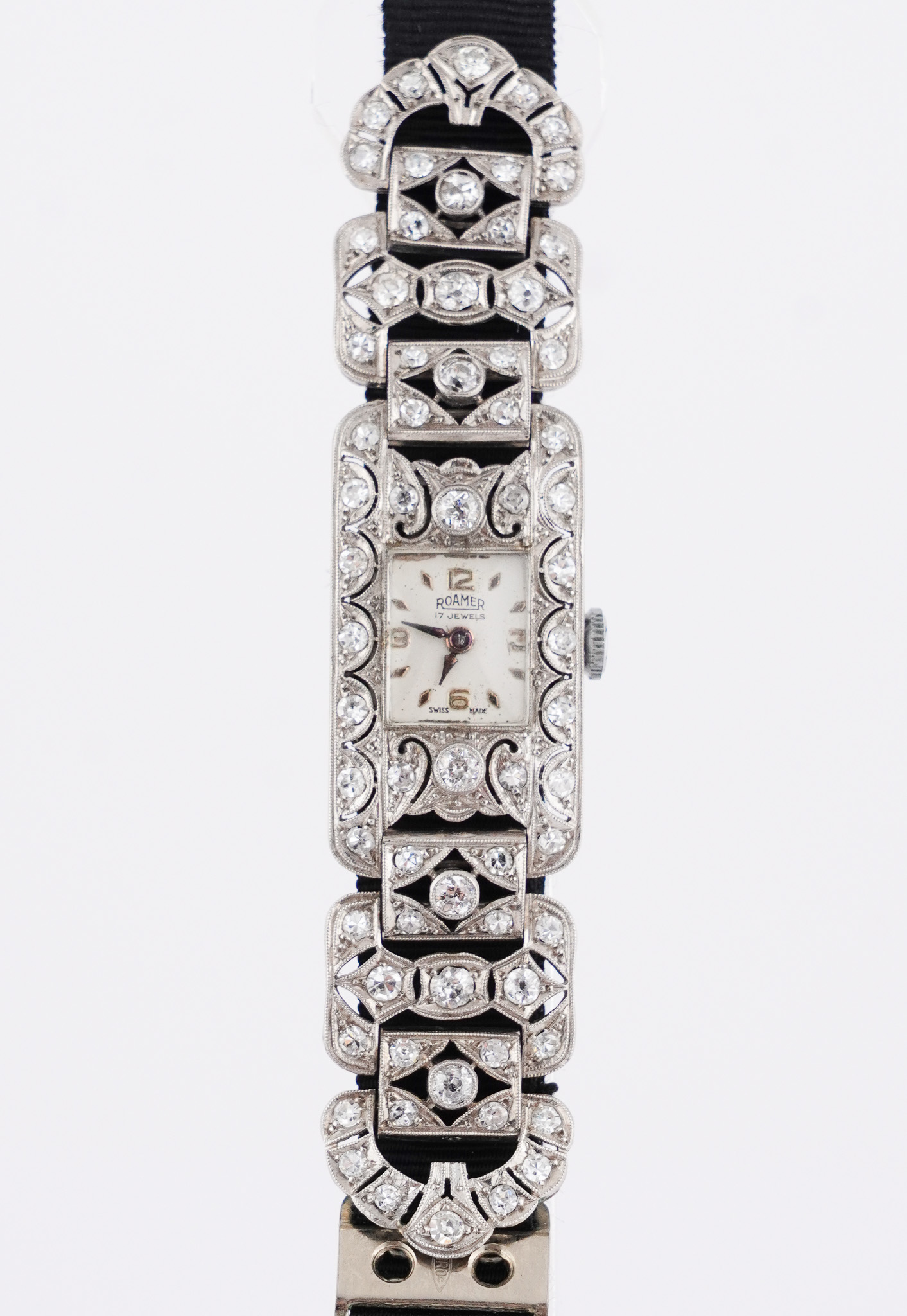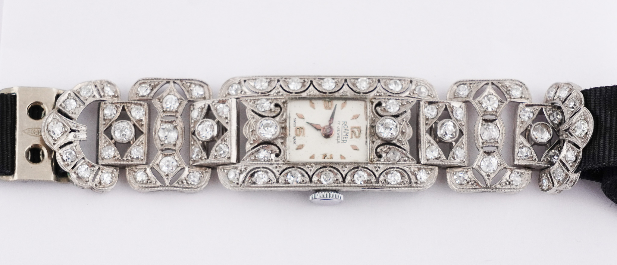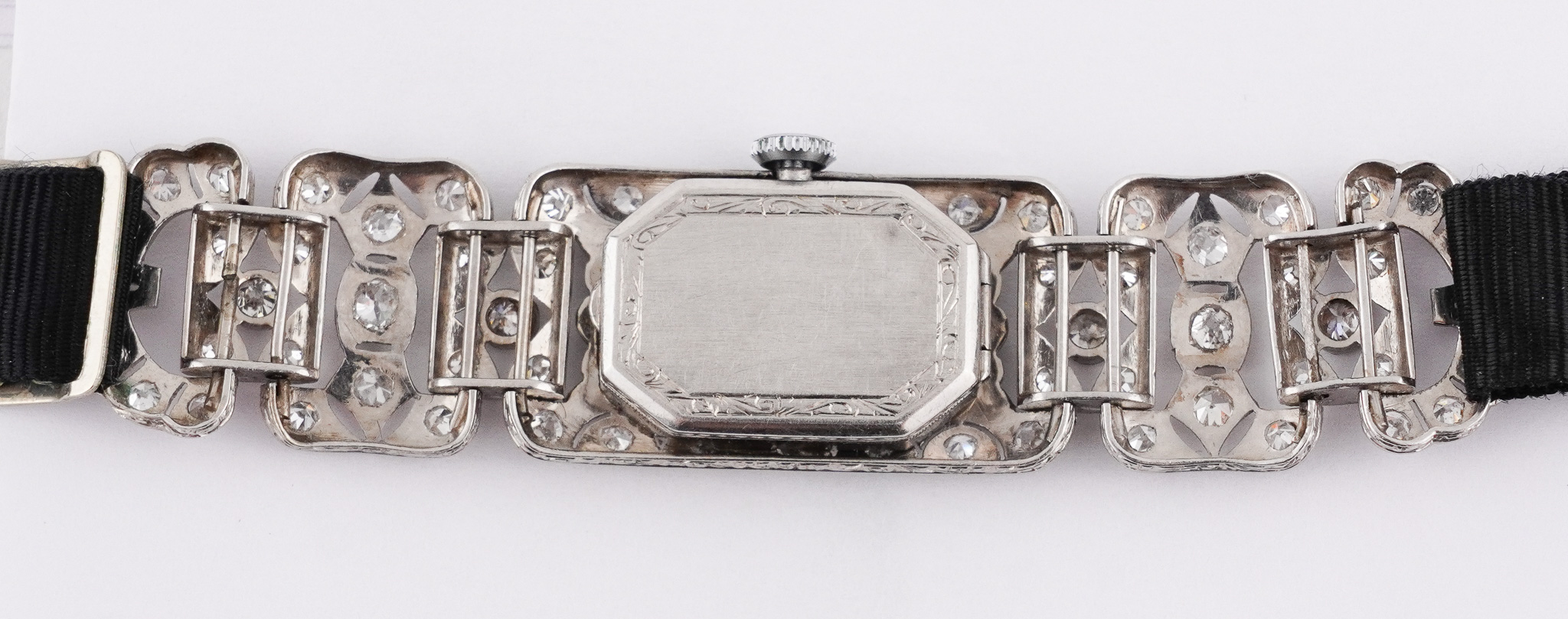 Eine feine Art déco Uhr gearbeitet in Platin mit Diamantbesatz und Ripsarmband. Uhr läuft an.