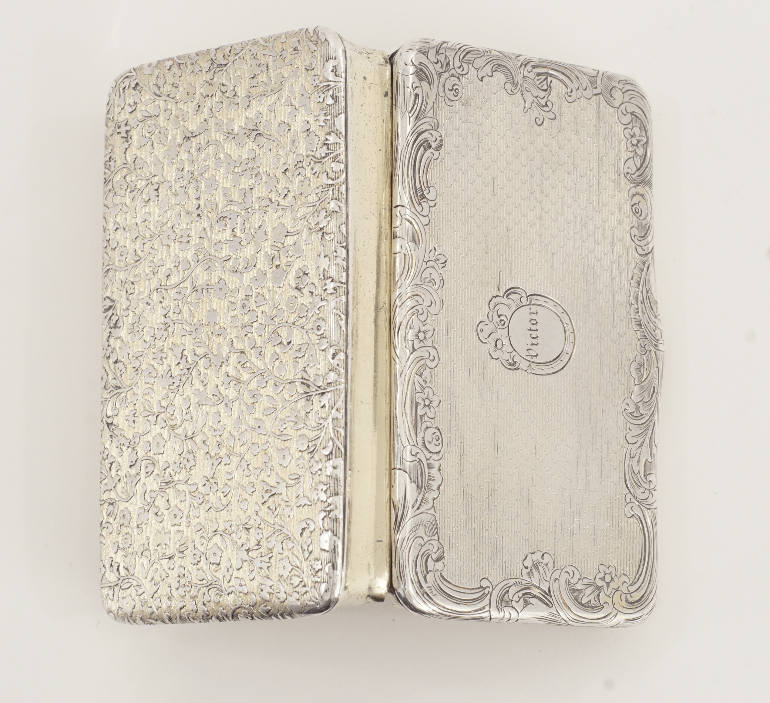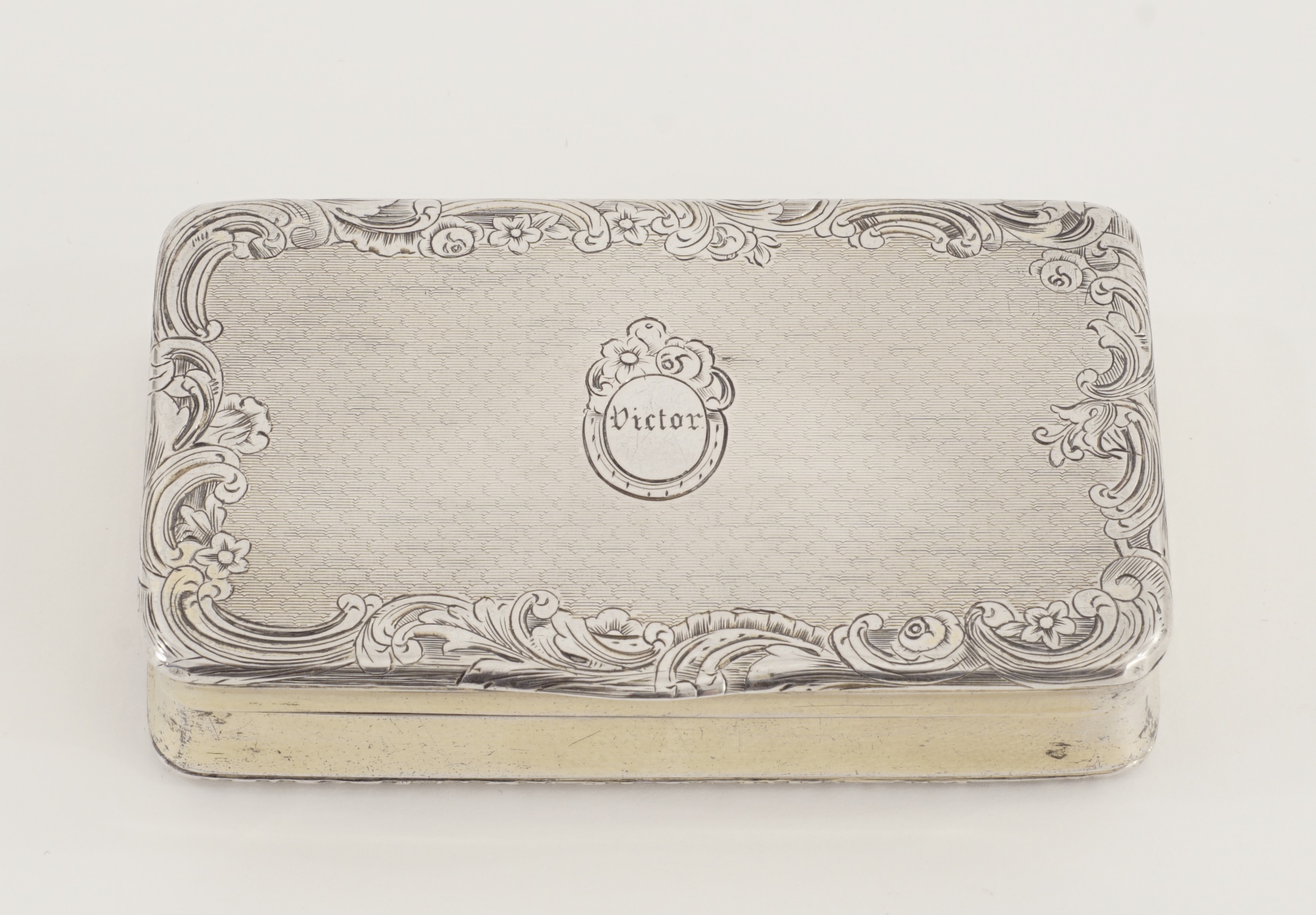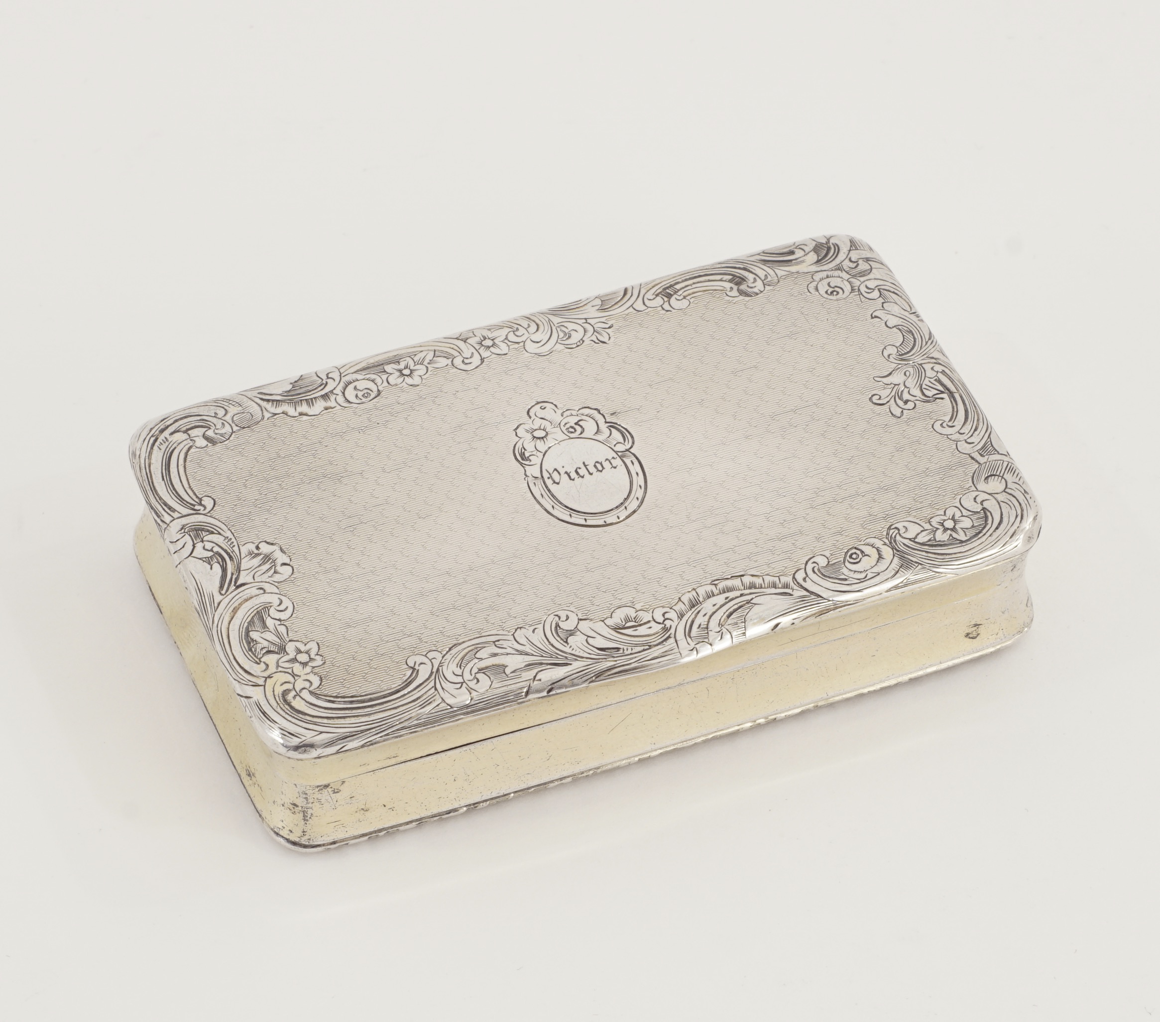 Fein guillochierter Dekor. Innen vergoldet. Auf Deckel die Namensgravur „Victor“ in Kartusche.