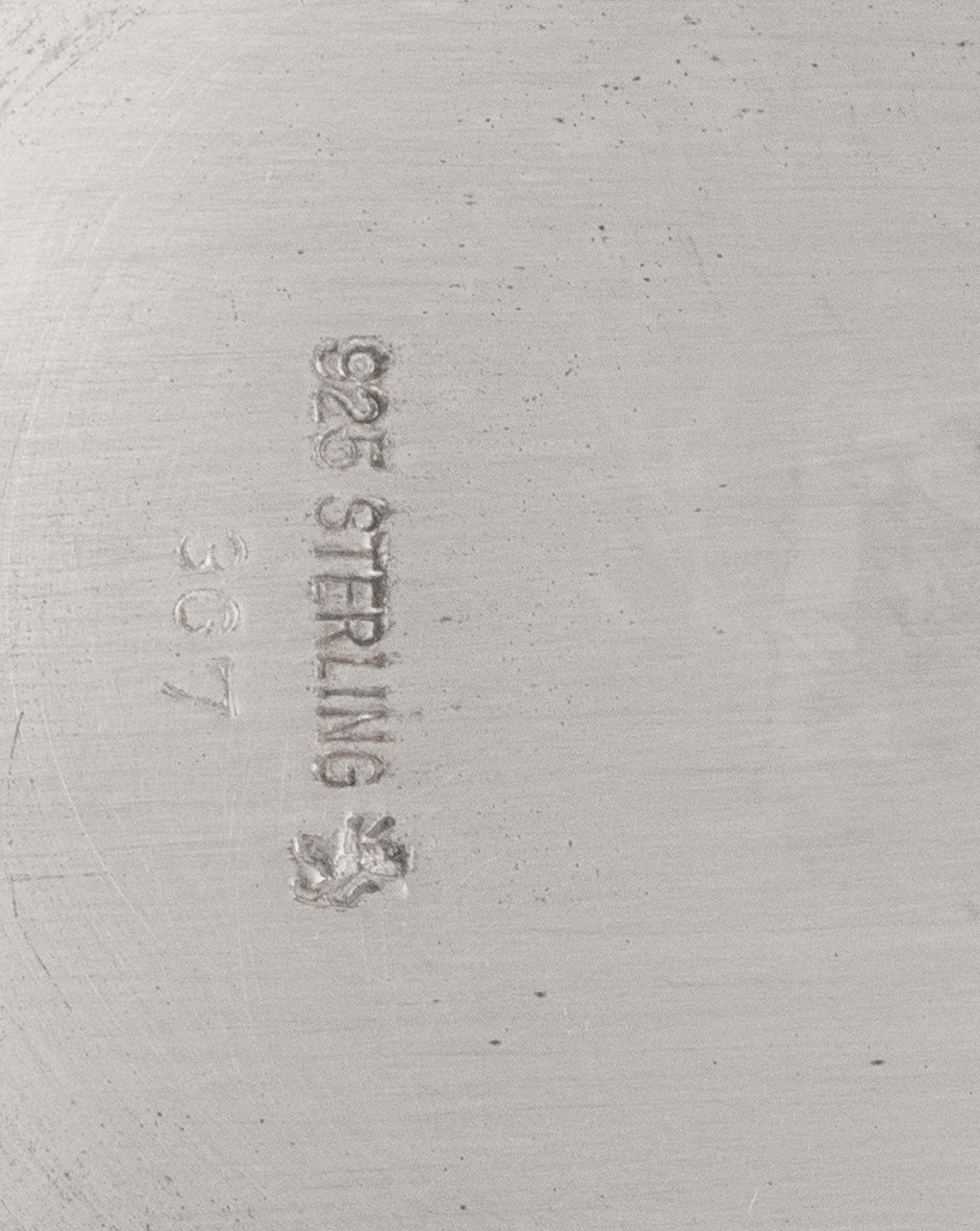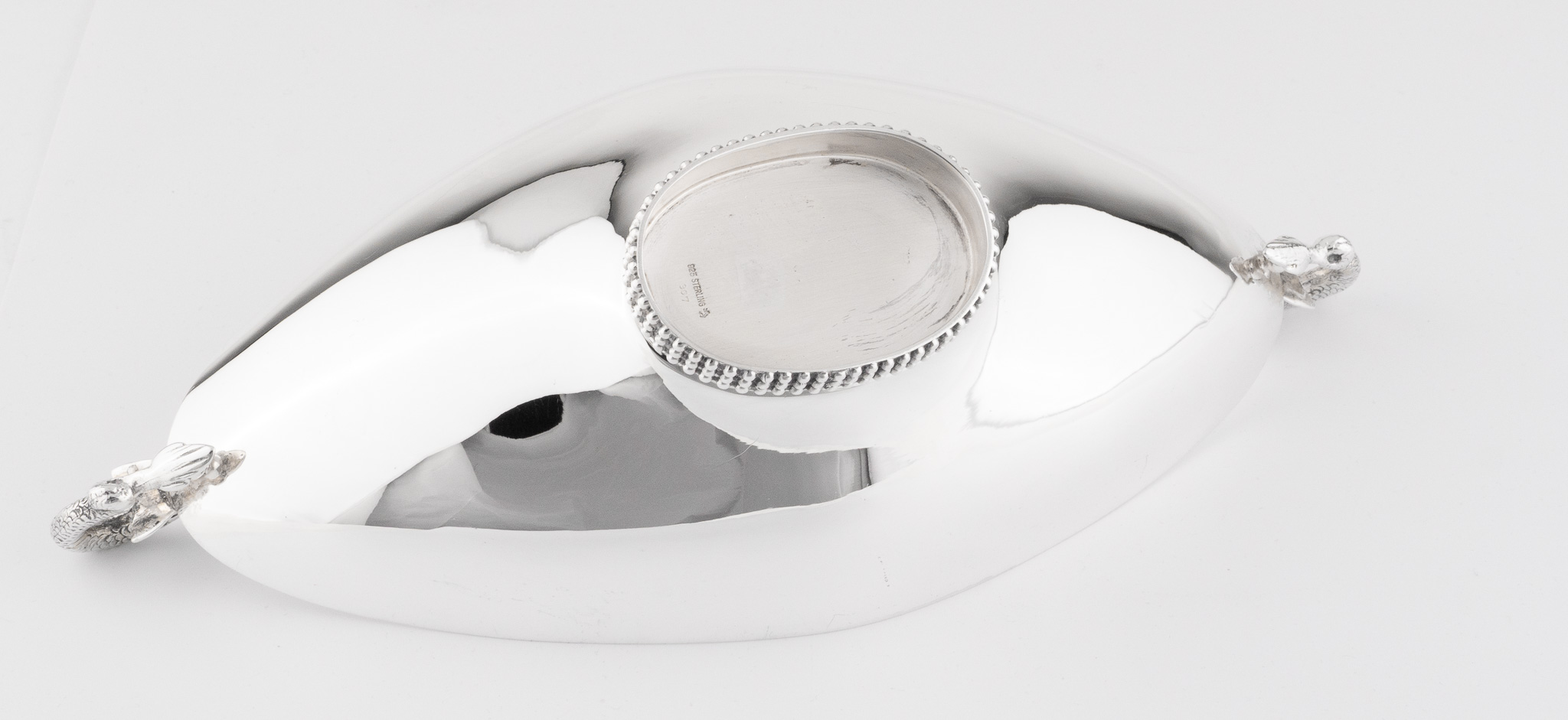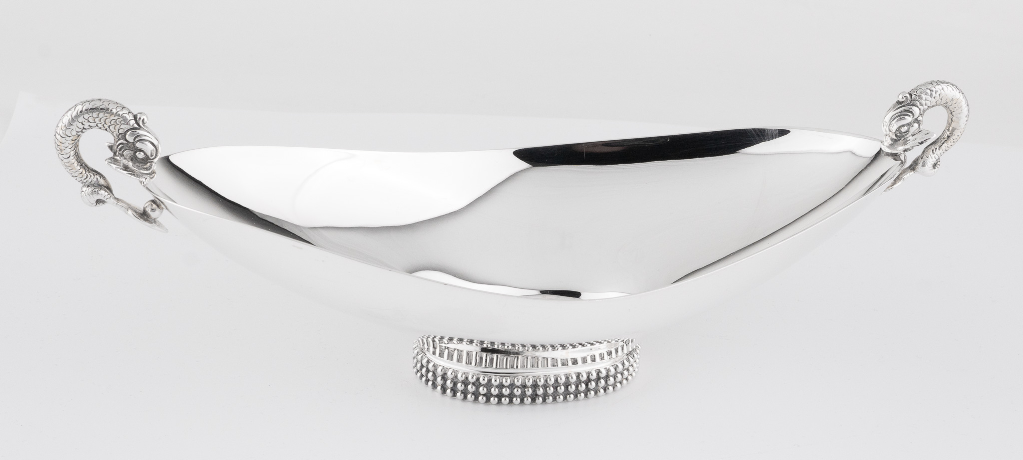 Eine elegante Henkelschale mit Delphinen als Handhabe gearbeitet in 925 Sterlingsilber – Meistermarke Gebrüder Deyhle Schwäbisch Gmünd – Mitte 20. Jahrhundert