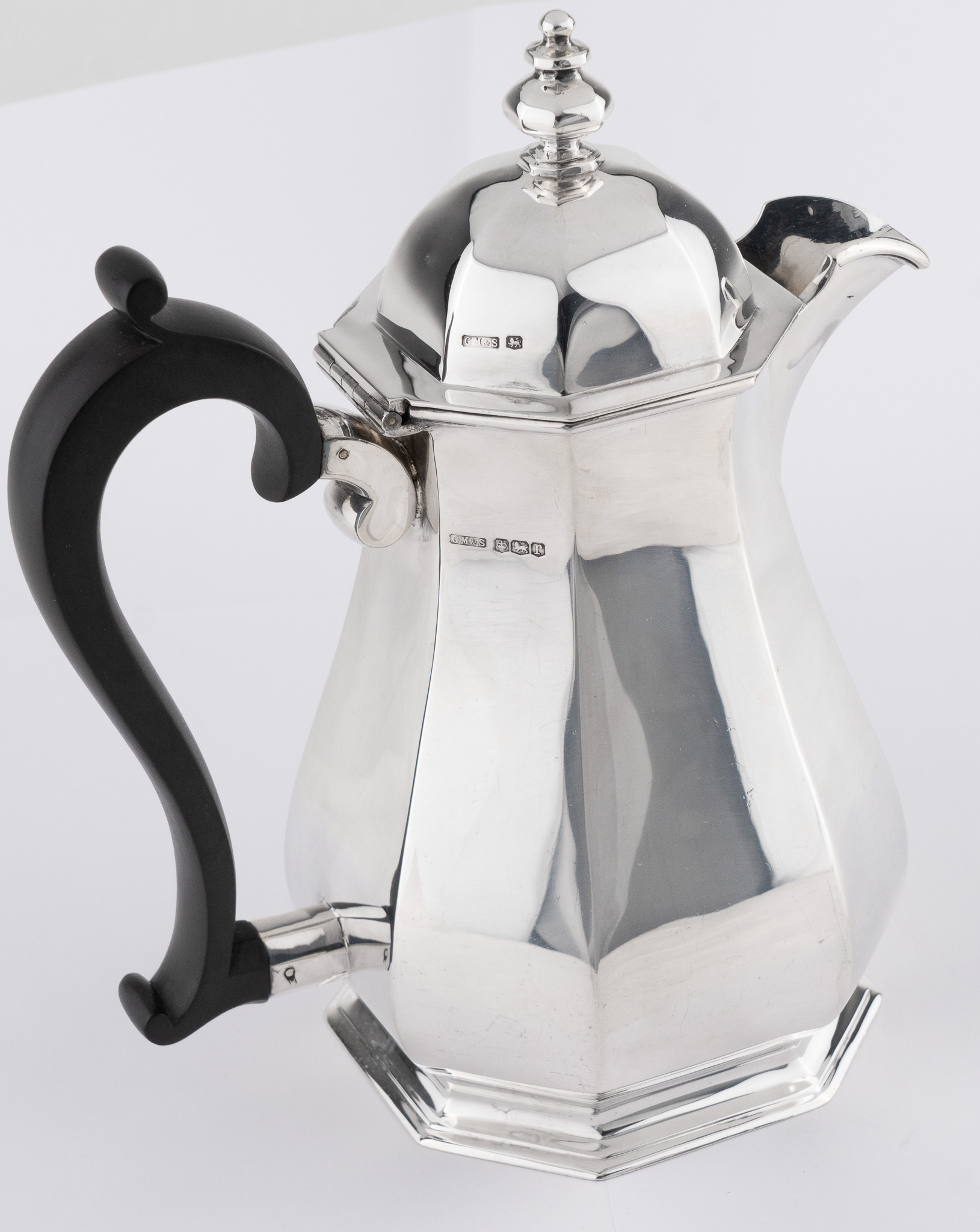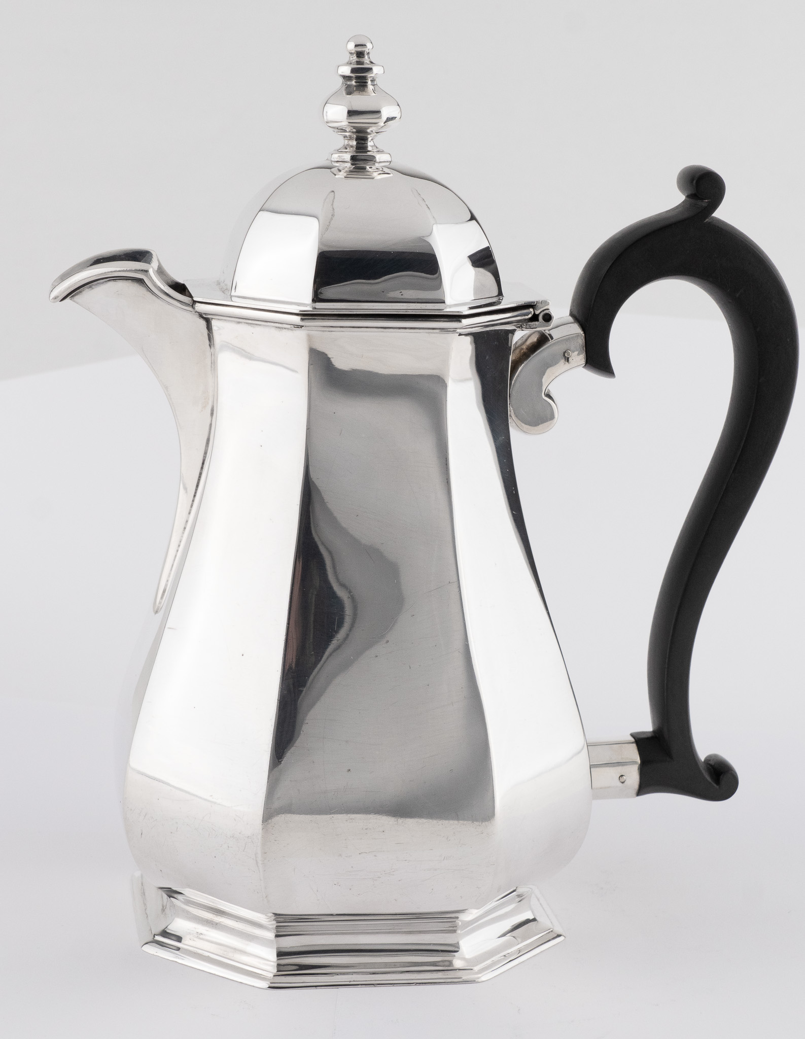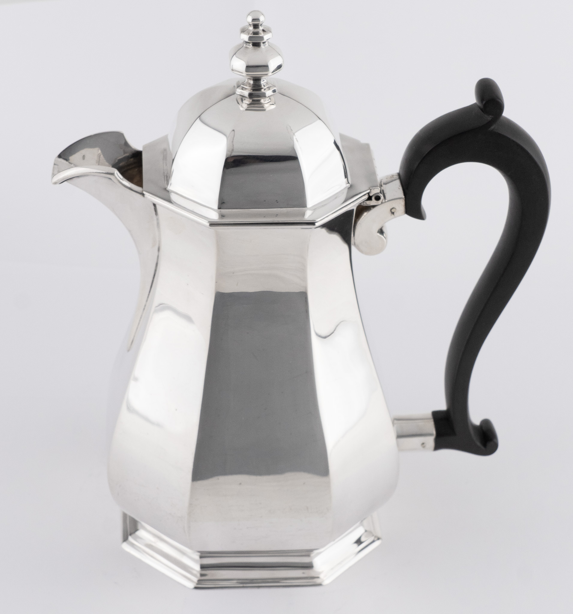 Eine sehr solide Kaffeekanne gearbeitet in 925er Sterlingsilber – Oktogonale Form im Stil der Kannen aus der Zeit George I. – Griff in ebonisiertem Holz.