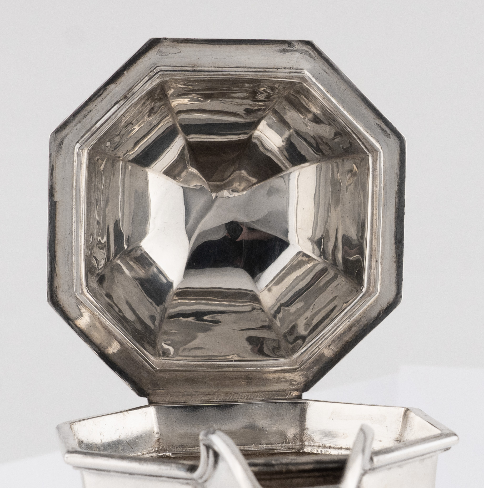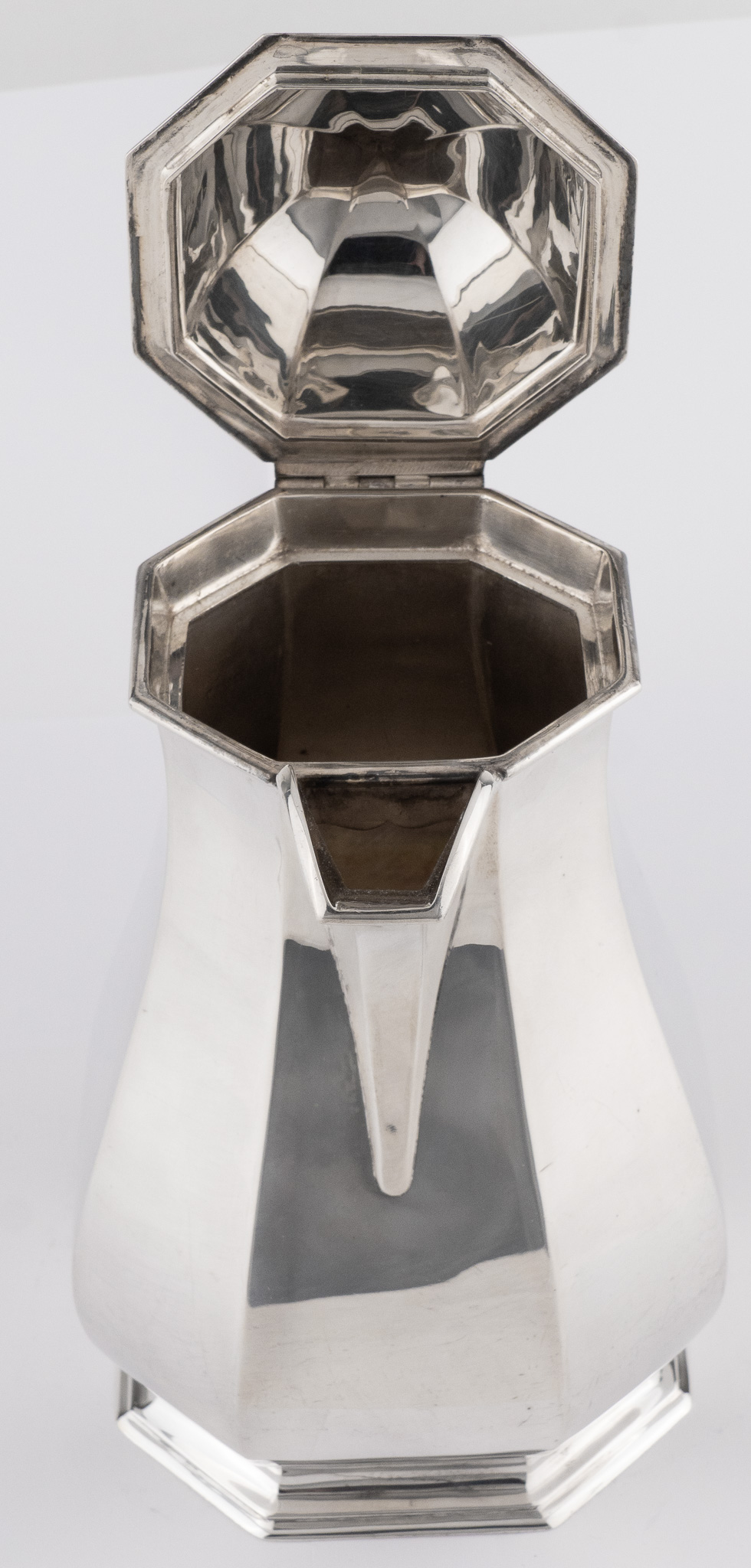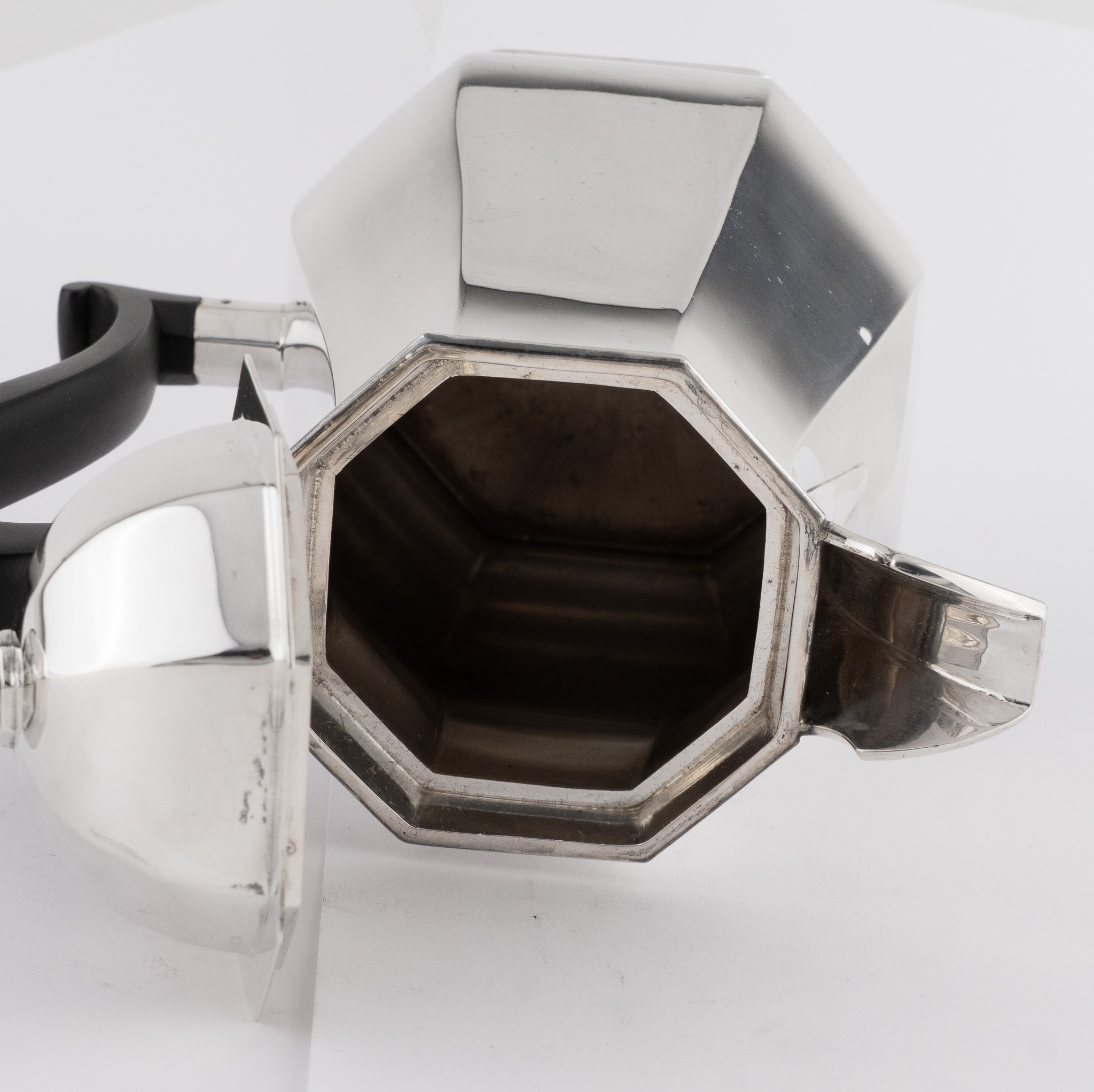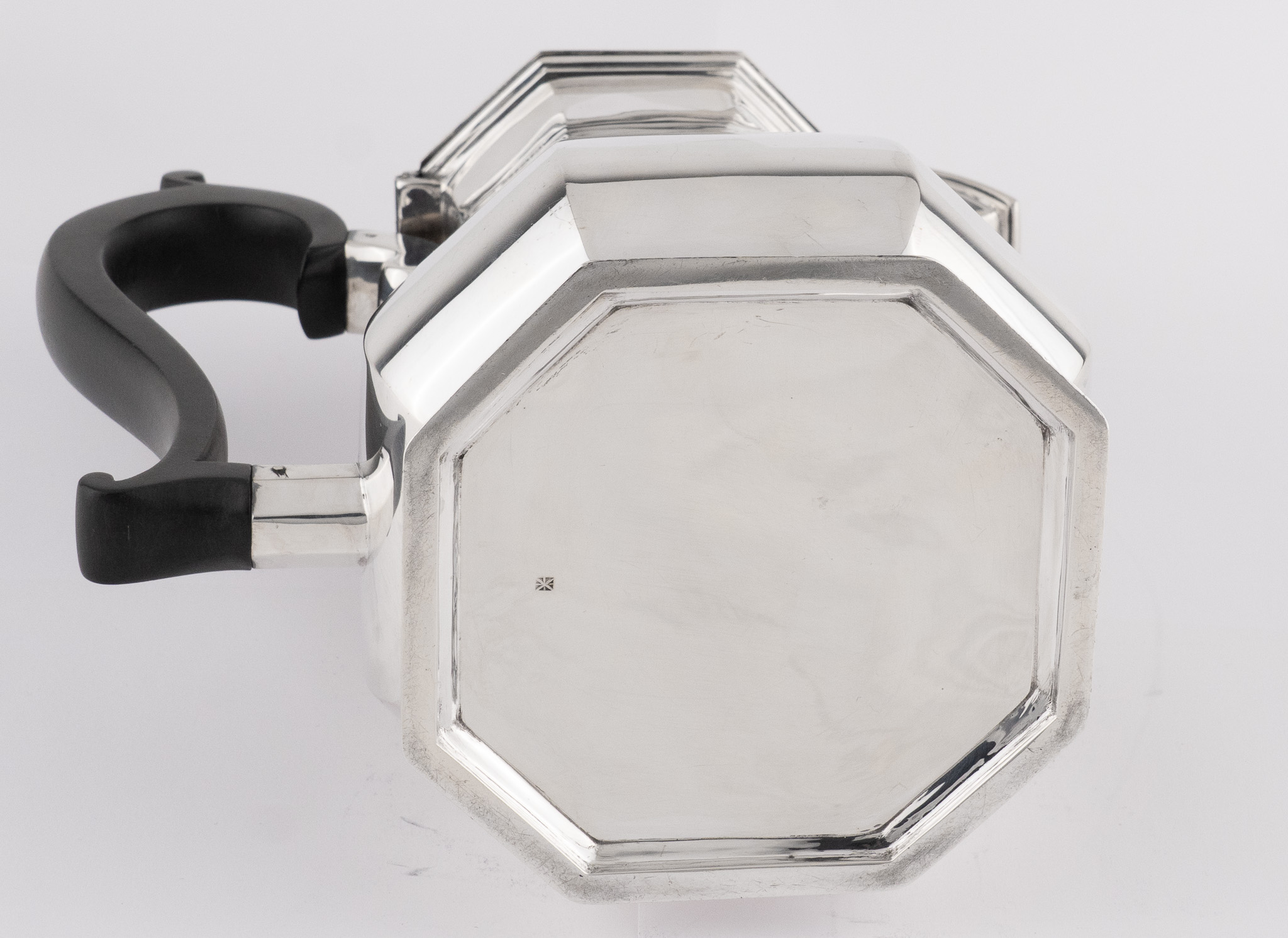 Eine sehr solide Kaffeekanne gearbeitet in 925er Sterlingsilber – Oktogonale Form im Stil der Kannen aus der Zeit George I. – Griff in ebonisiertem Holz.