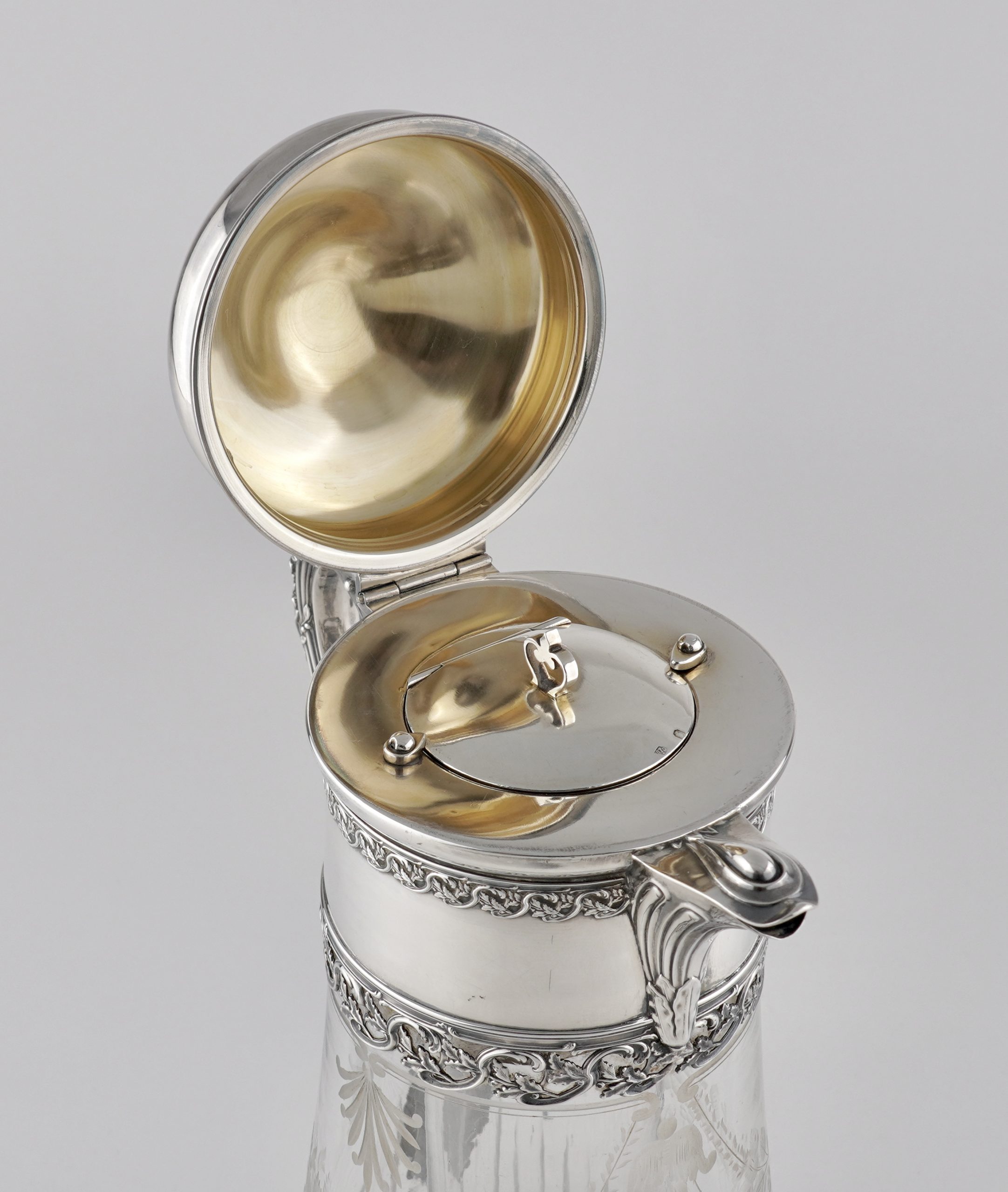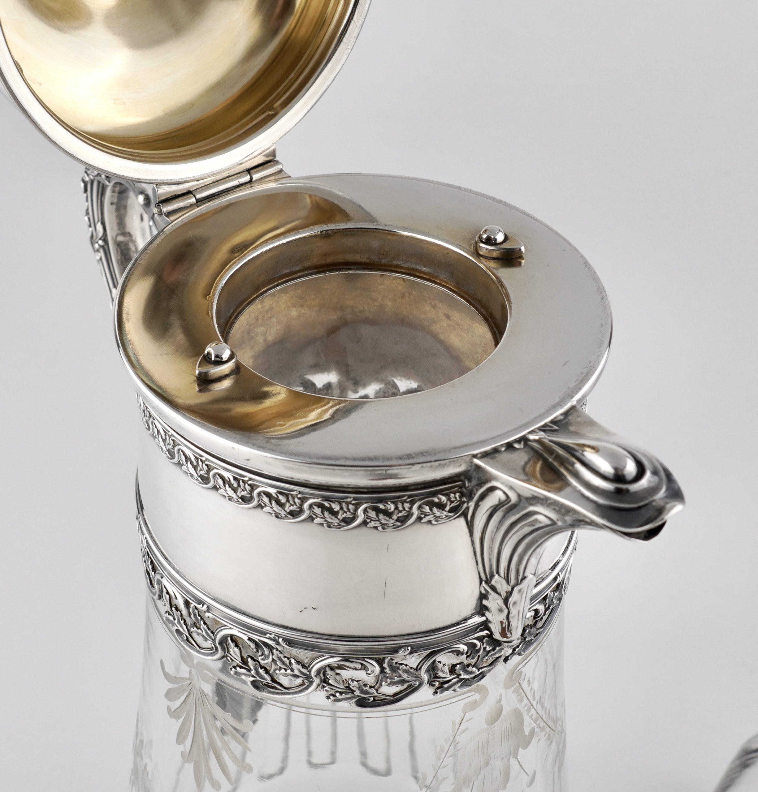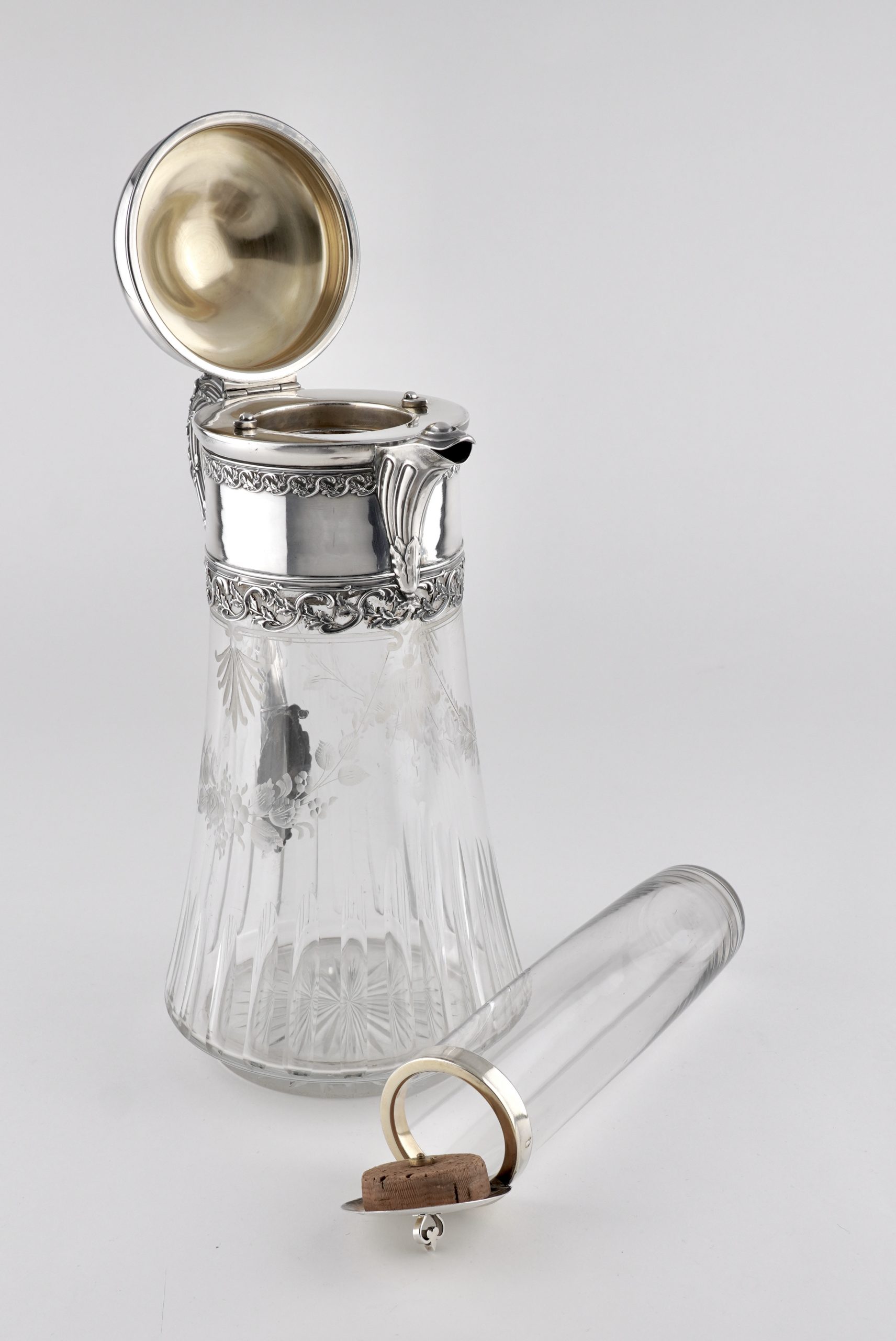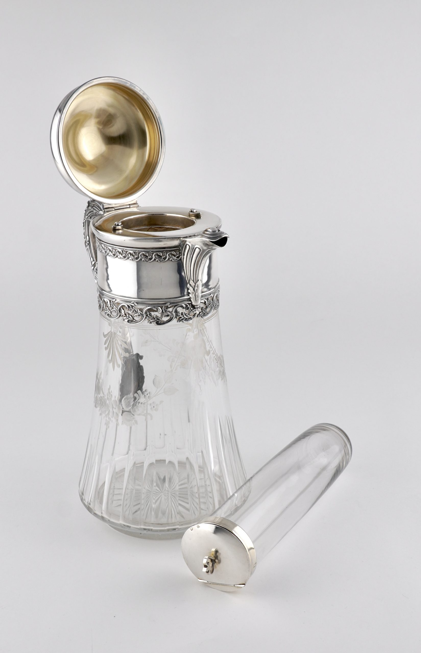Eine aparte „Kalte Ente“ mit fein graviertem Glas und Silbermontierung, gearbeitet in 950er Silber – im Stil des Louis-seize