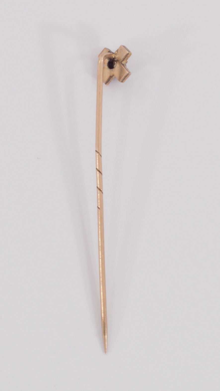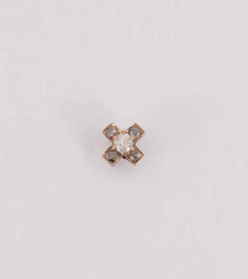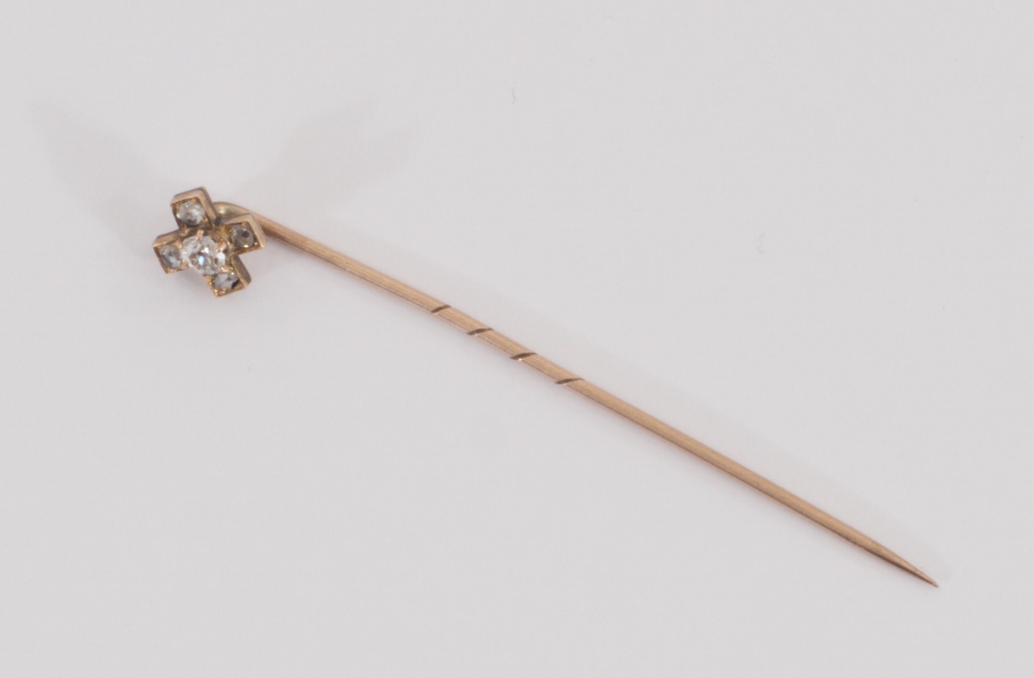 Eine Krawattennadel in 8 Karat Gelbgold gearbeitet, zentral mit einem Altschliff-Diamanten von ca. 0,15 ct. und 4 Rosen-Diamanten in Form eines „X“ angeordnet.