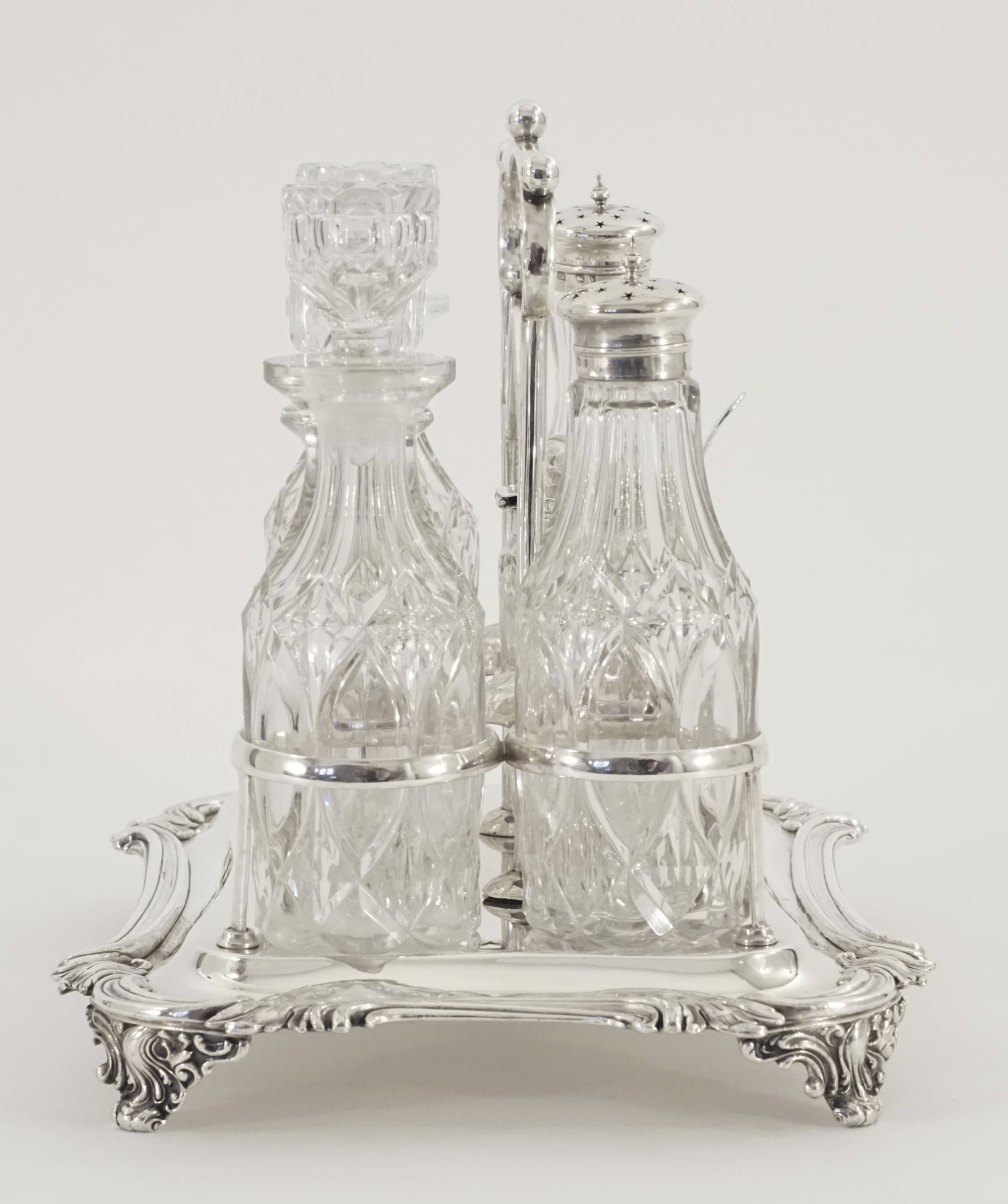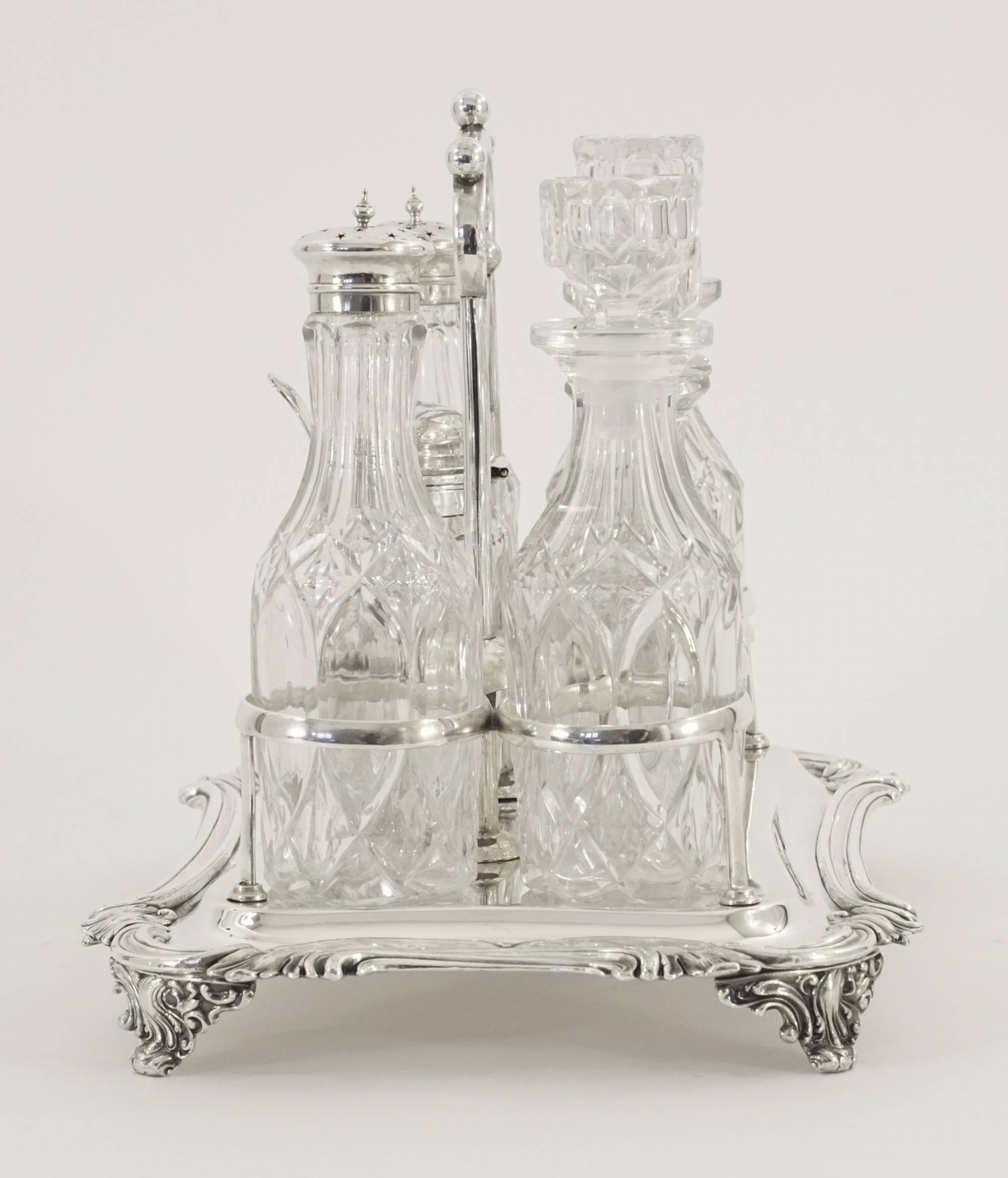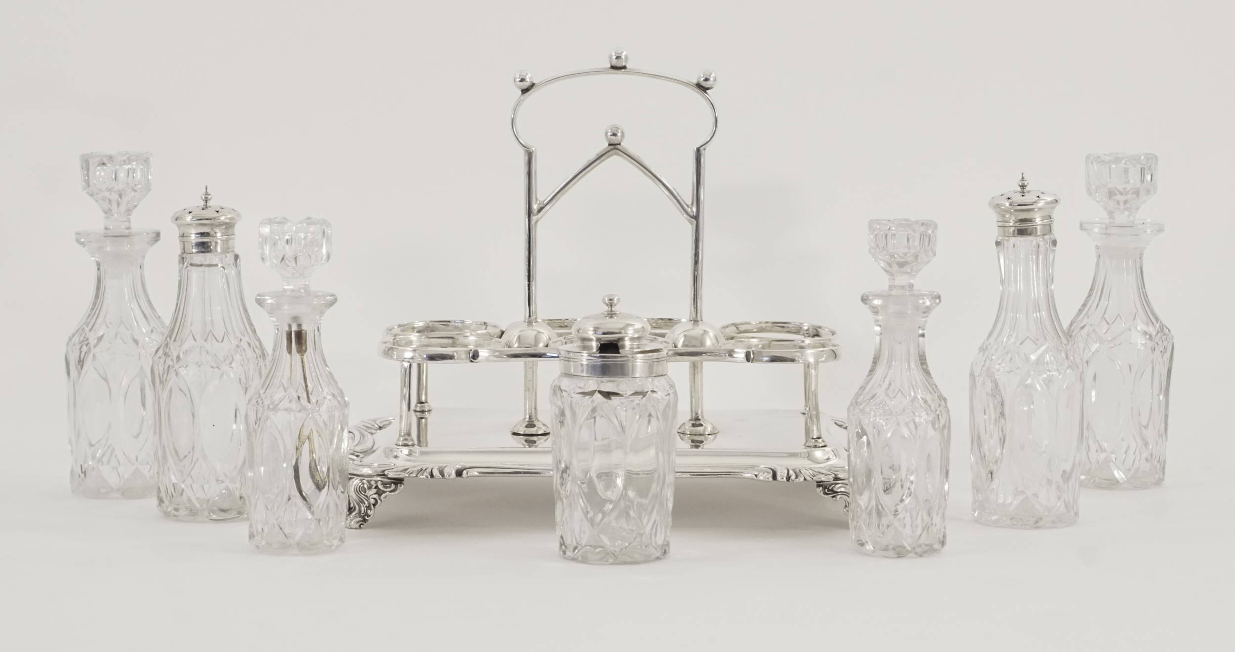 Eine victorianische Menage in Sterlingsilber mit sieben Glaseinsätzen, davon 2 Gewürzstreuer und ein Senfglas mit Silbermontierung.