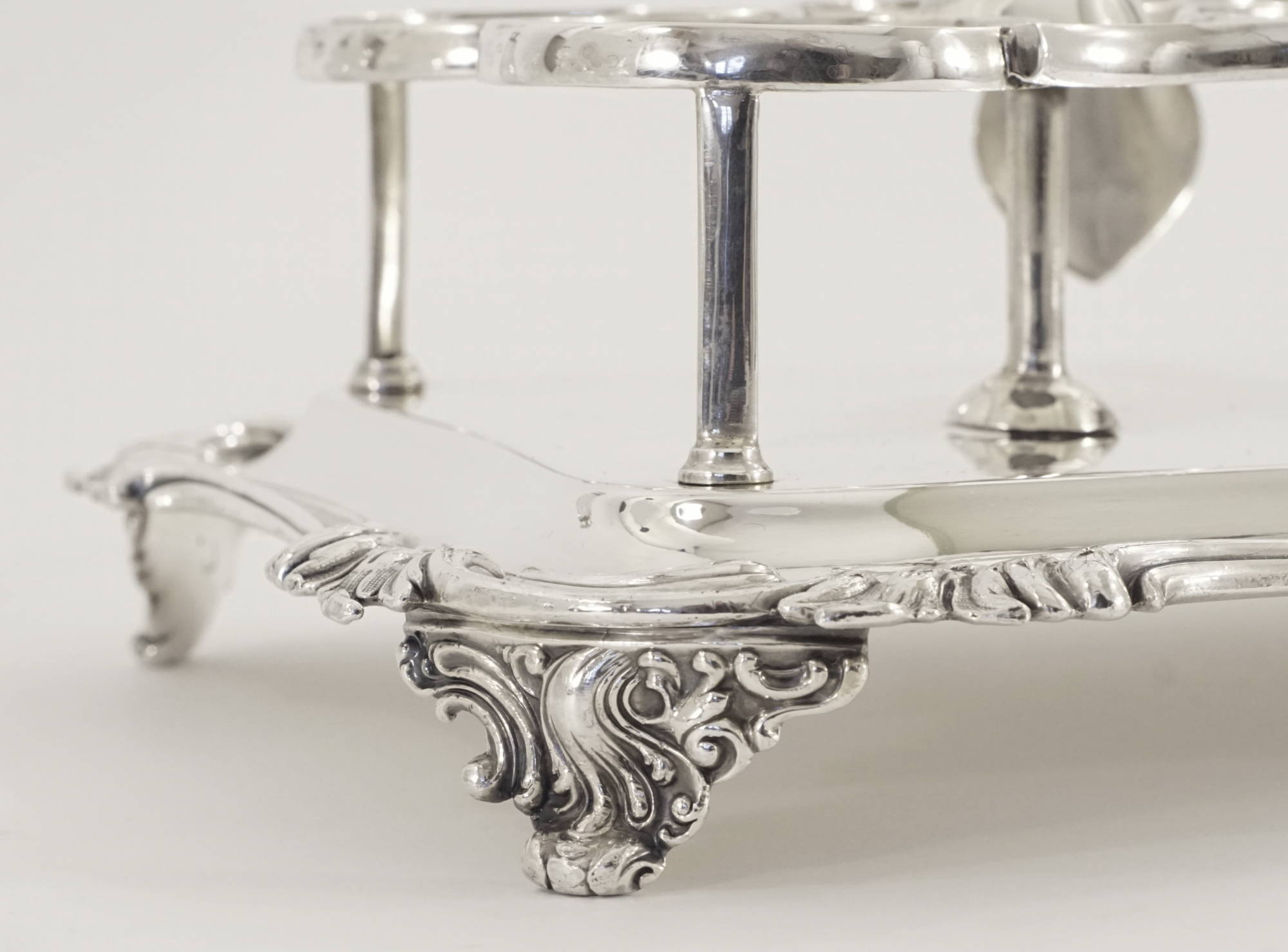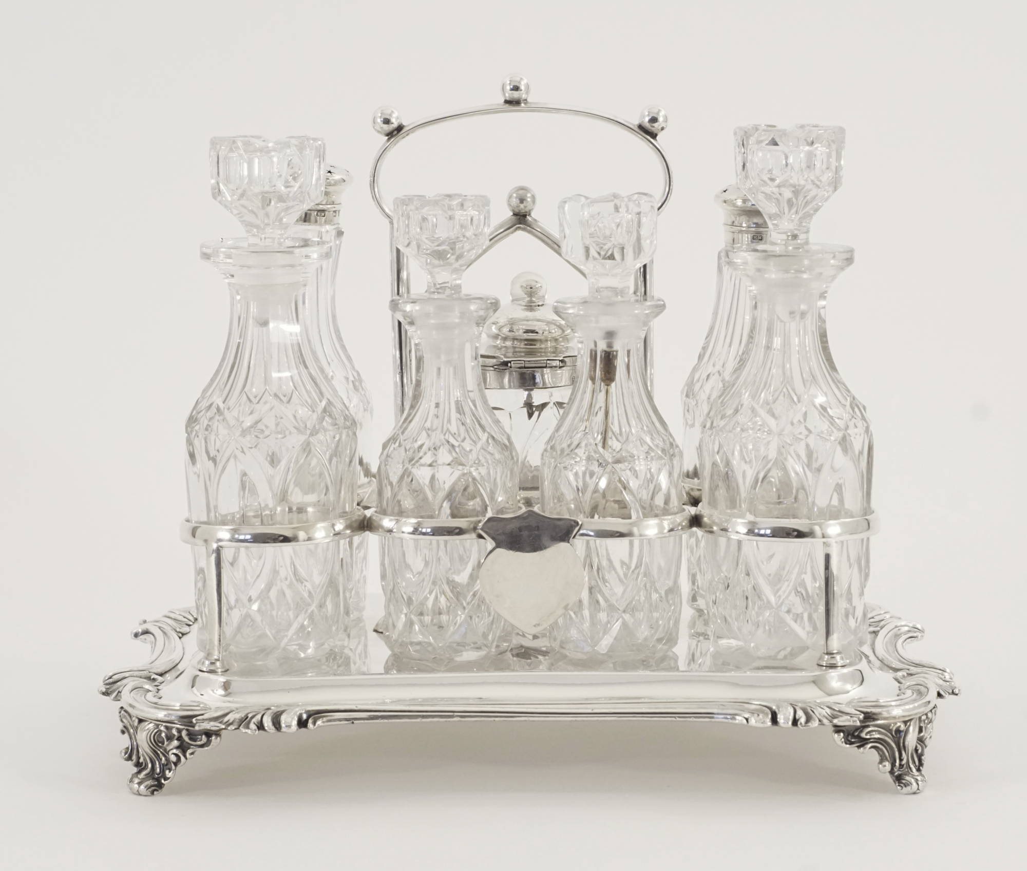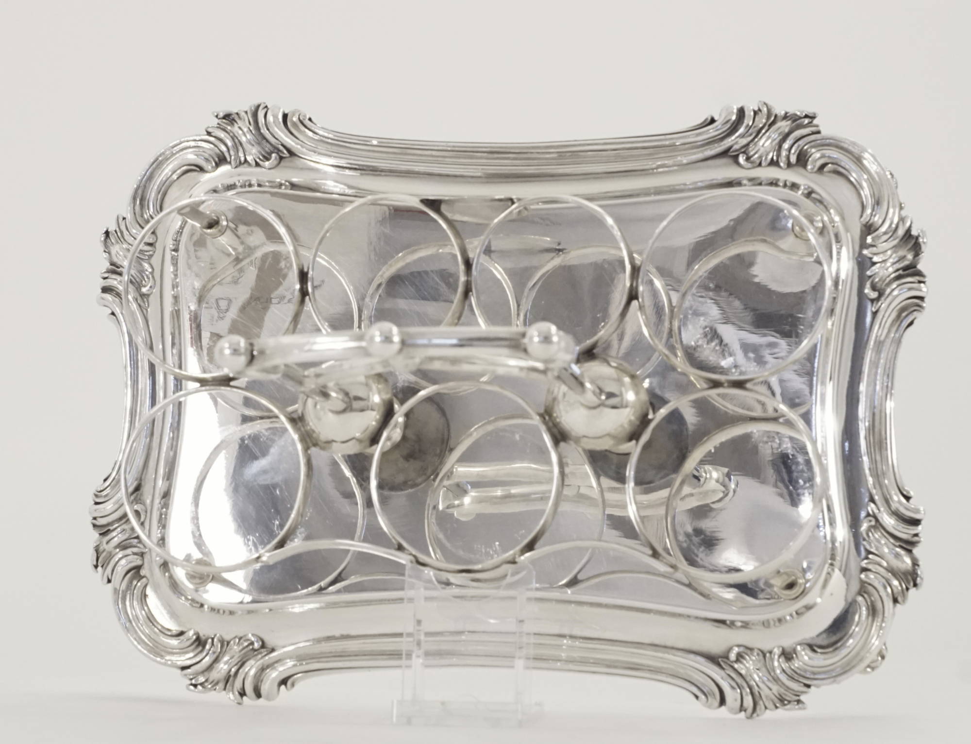 Eine victorianische Menage in Sterlingsilber mit sieben Glaseinsätzen, davon 2 Gewürzstreuer und ein Senfglas mit Silbermontierung.
