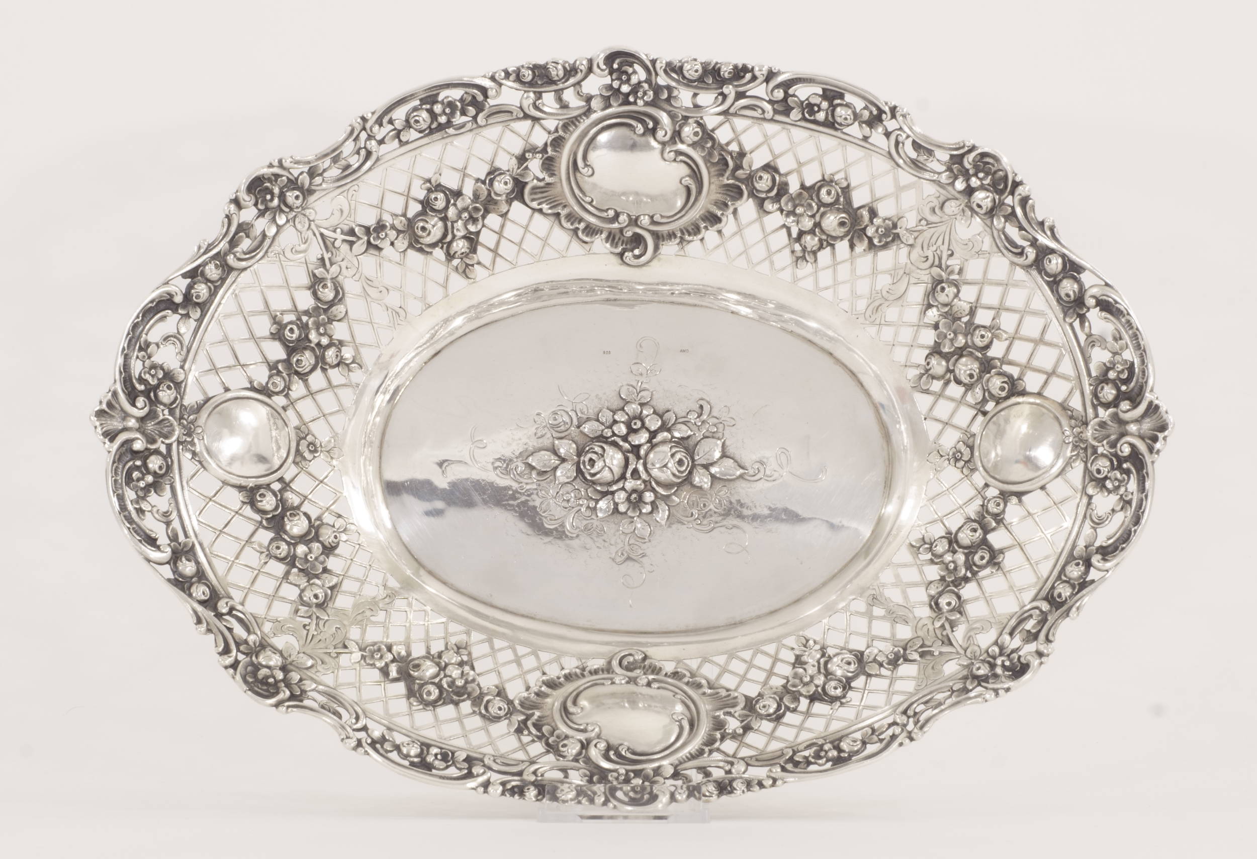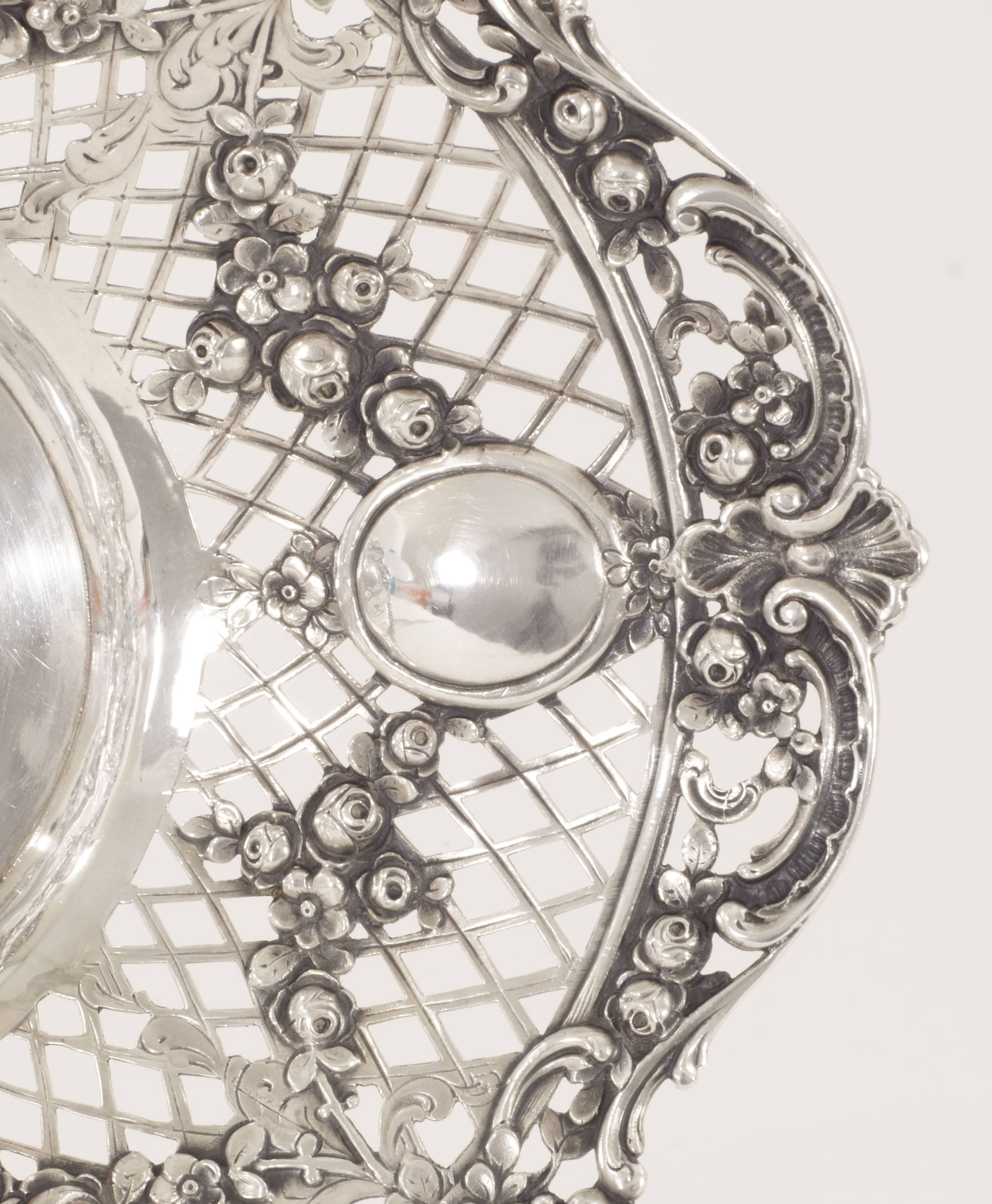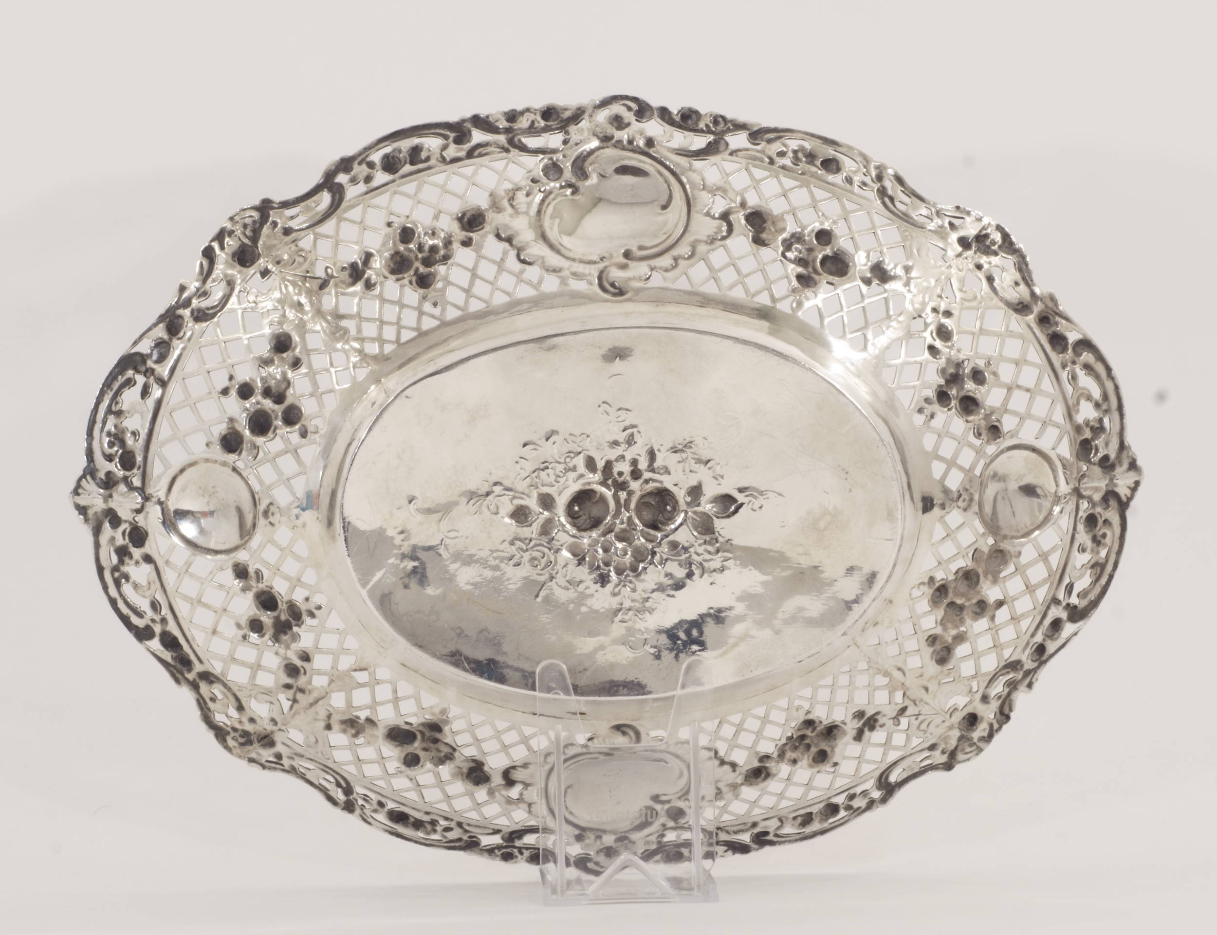 Eine ovale Schale in 800er Silber, durchbrochen gearbeitet, verziert mit Rocaillen, Blüten und Festons.