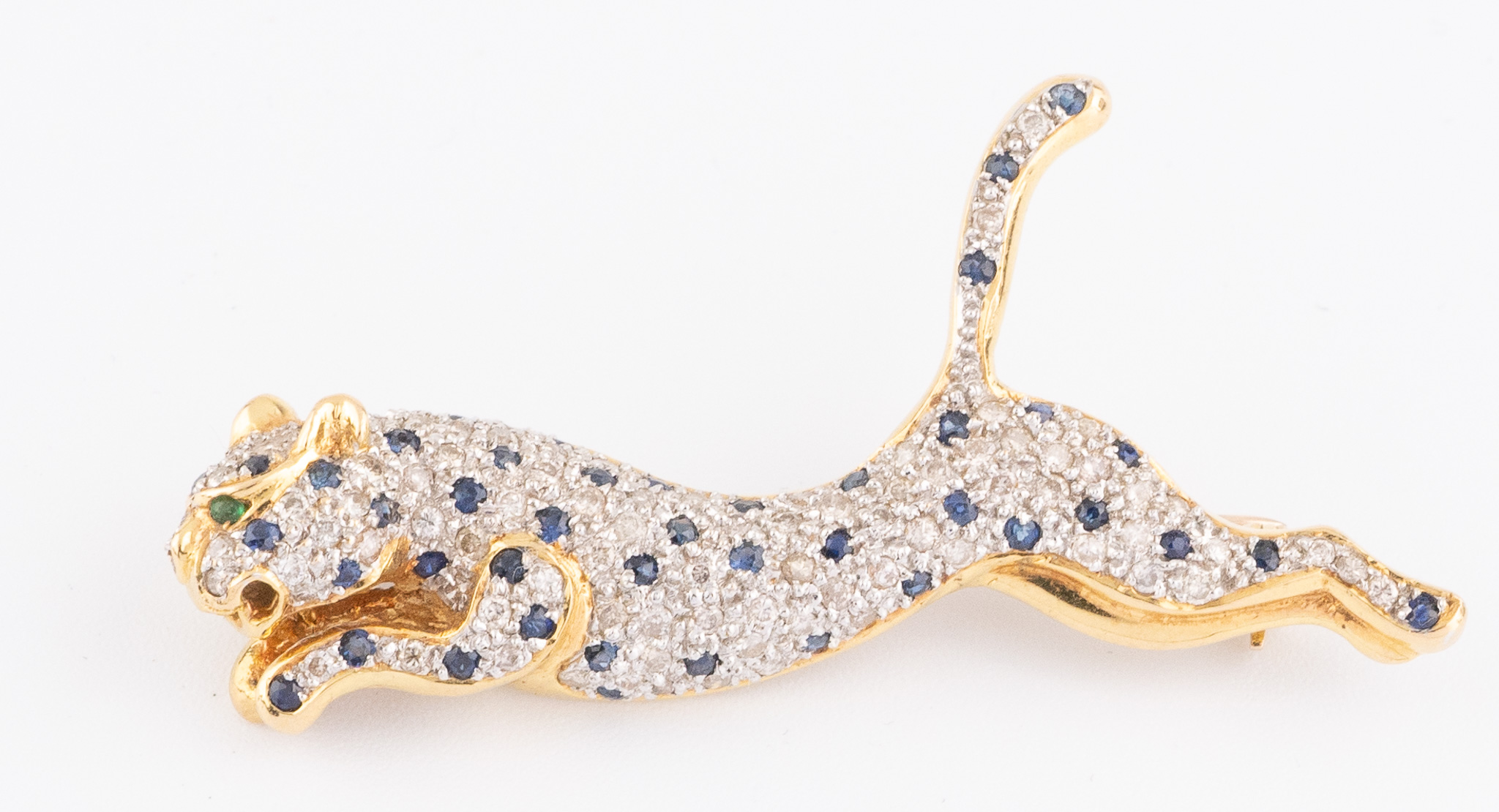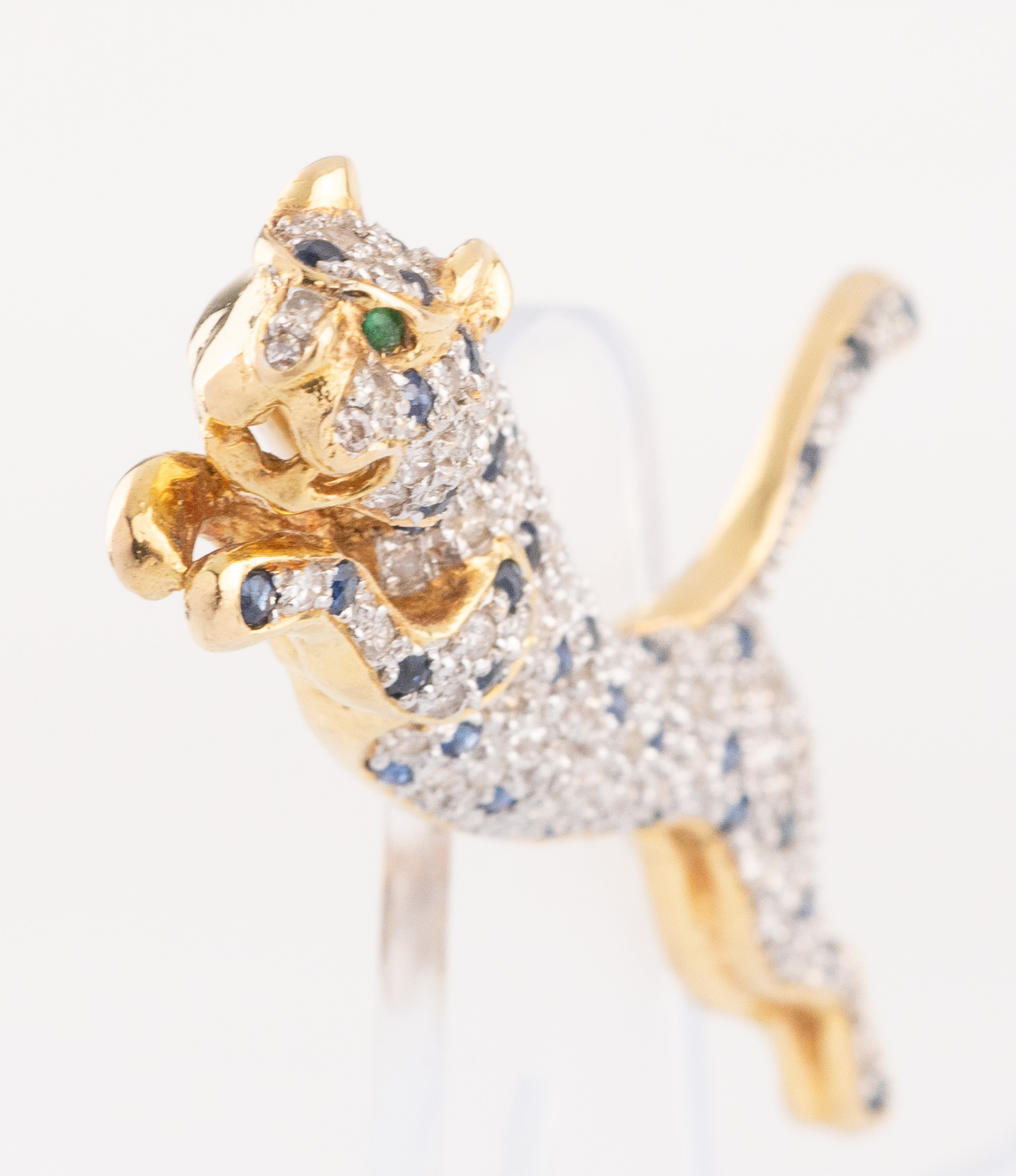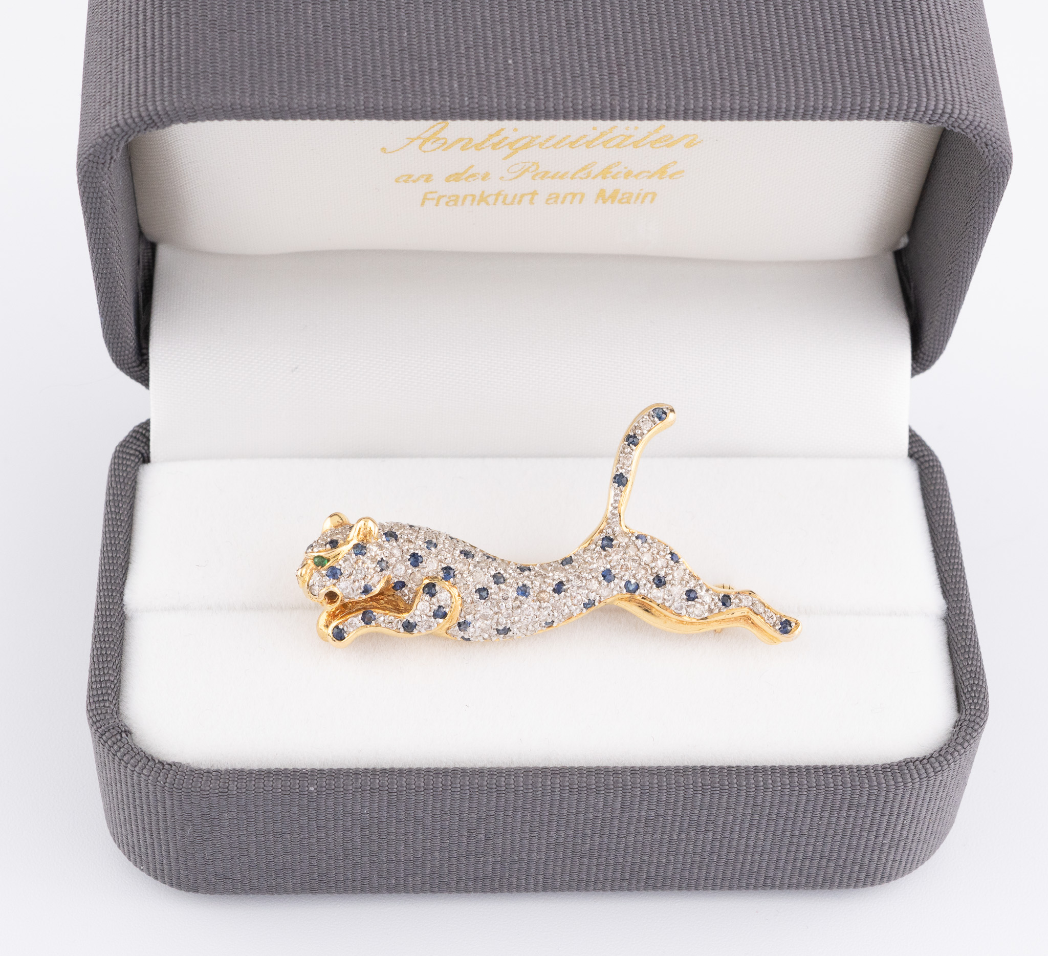 Eine Pantherbrosche in 18 Karat (750/1000) Gelbgold mit 40 Saphiren, ca. 60 Diamanten von zusammen ca. 1,2 ct. sowie einem Smaragd.