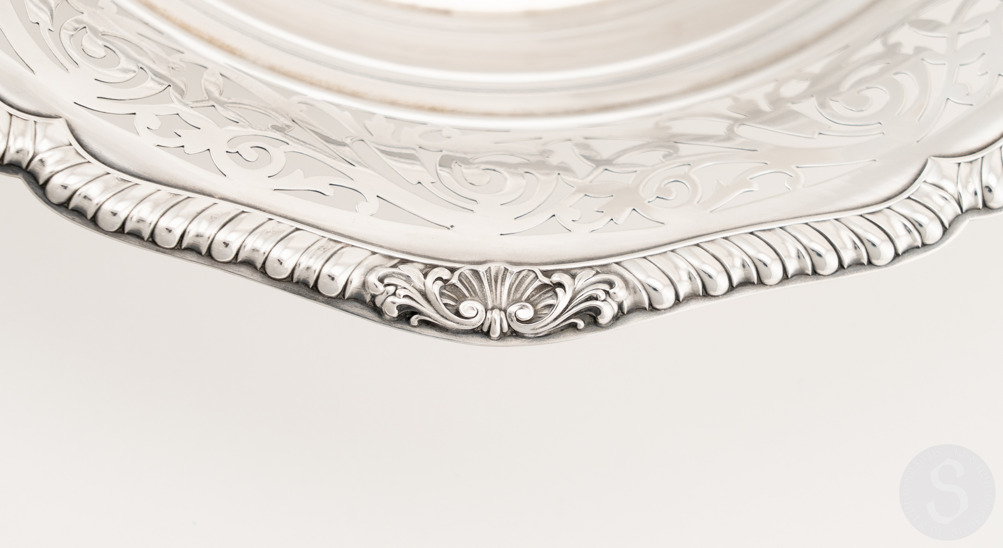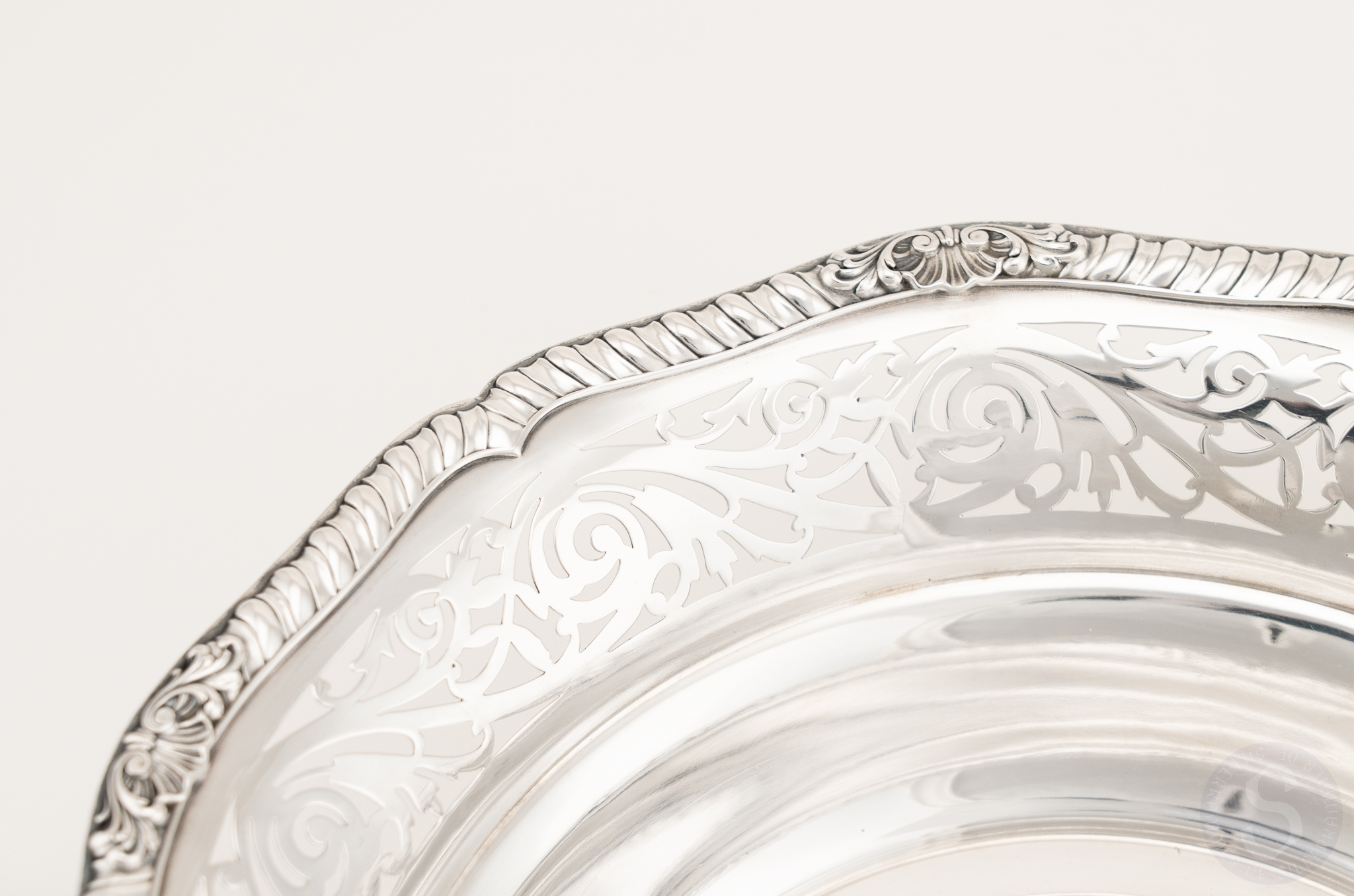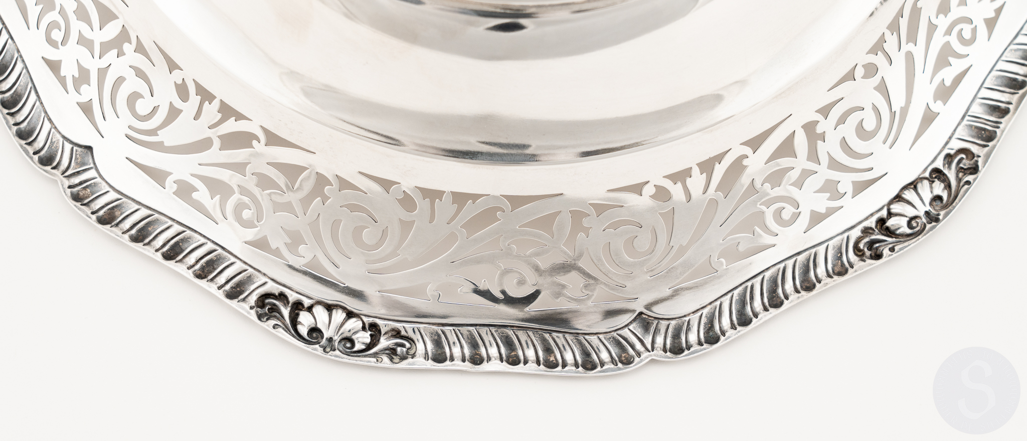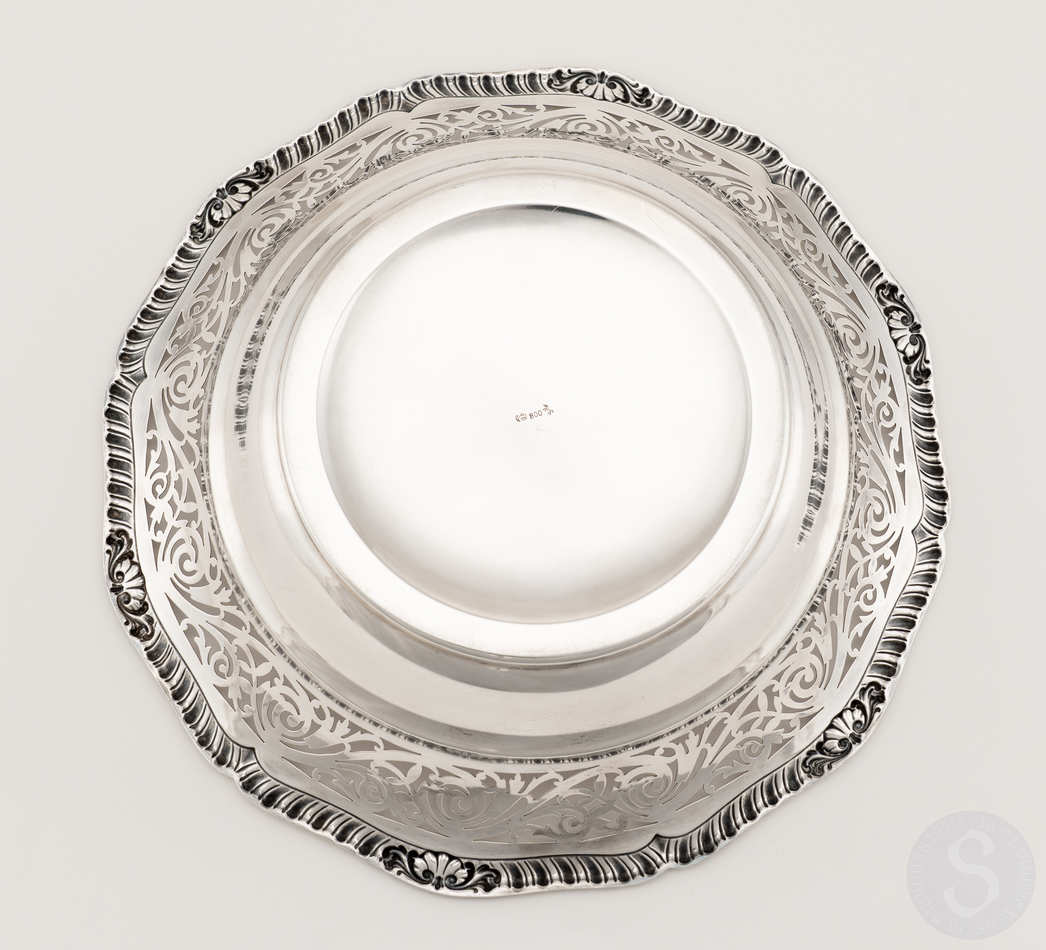 Eine runde Schale in 800/1000 Silber im englischen Stil. Der Rand ist geschweift, durchbrochen gearbeitet und mit reliefierten Blatt- und Rocaillemotiven verziert. Umlaufend mit Godrondekor.