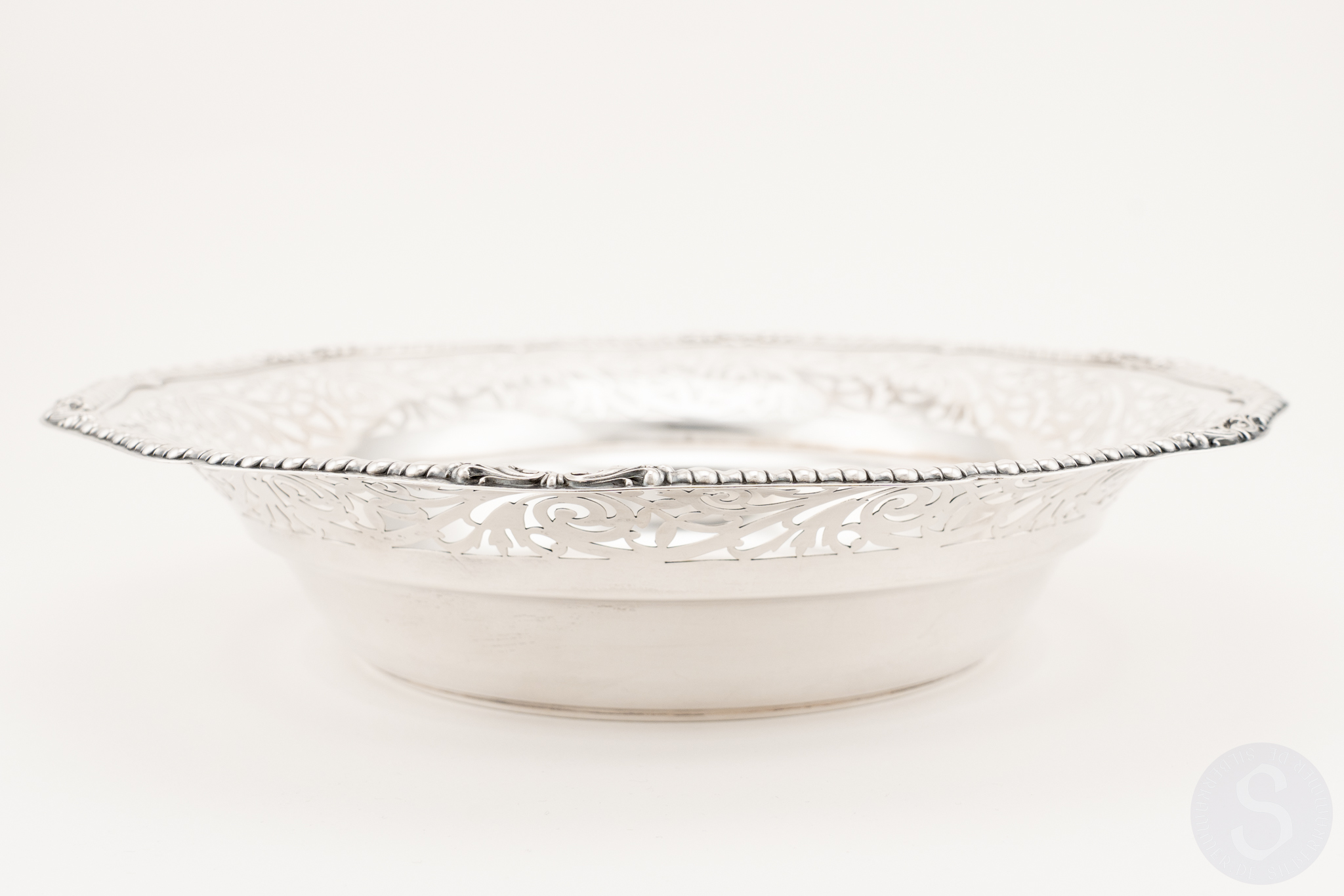Eine runde Silberschale in 800er Silber im englischen Stil mit durchbrochenem Rand – Deutschland 1. Hälfte 20. Jahrhundert