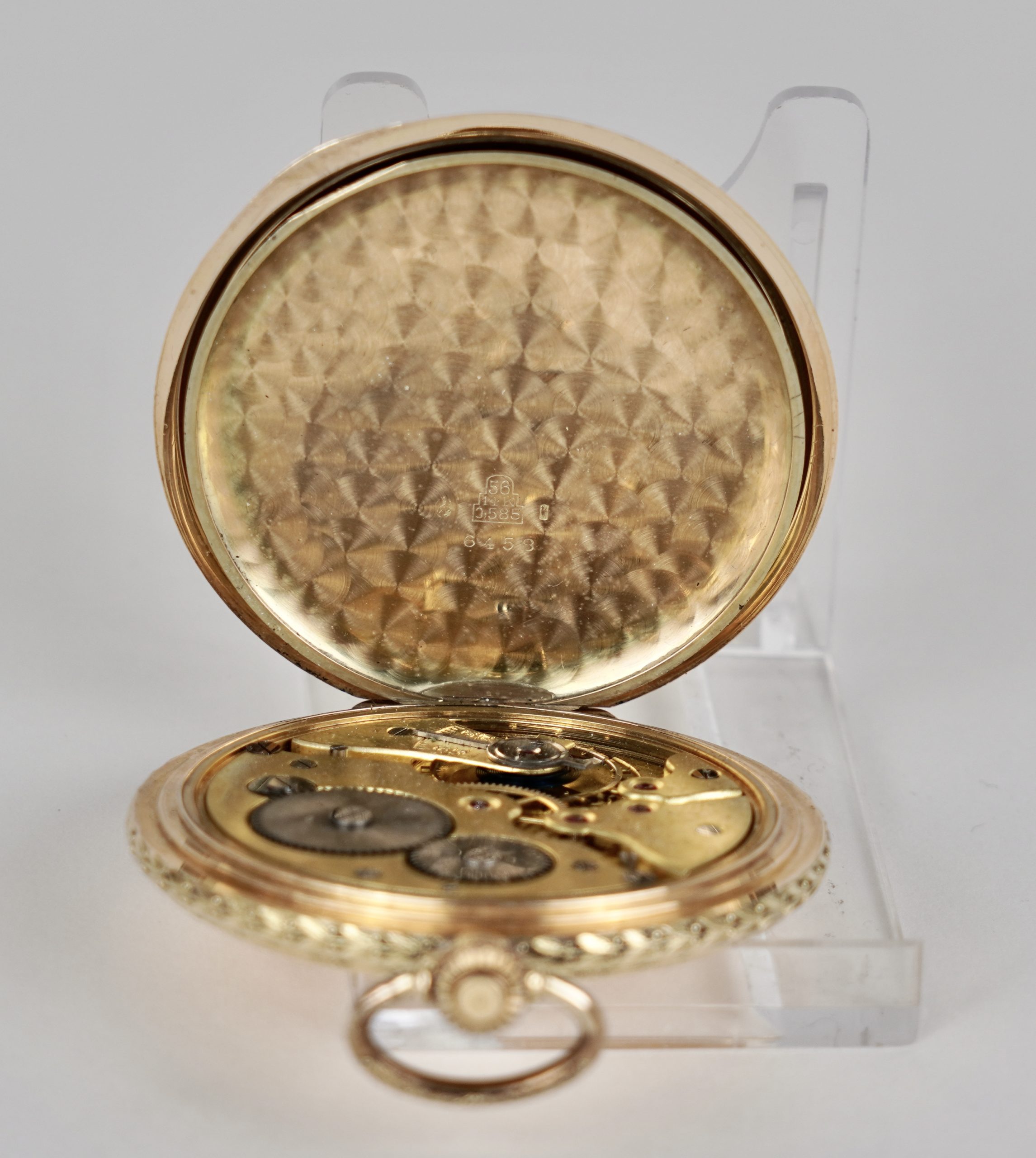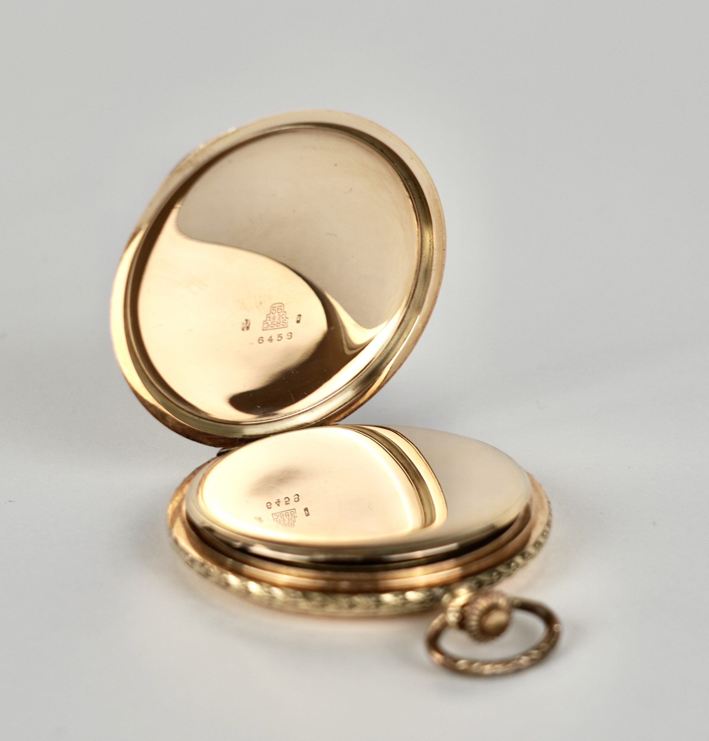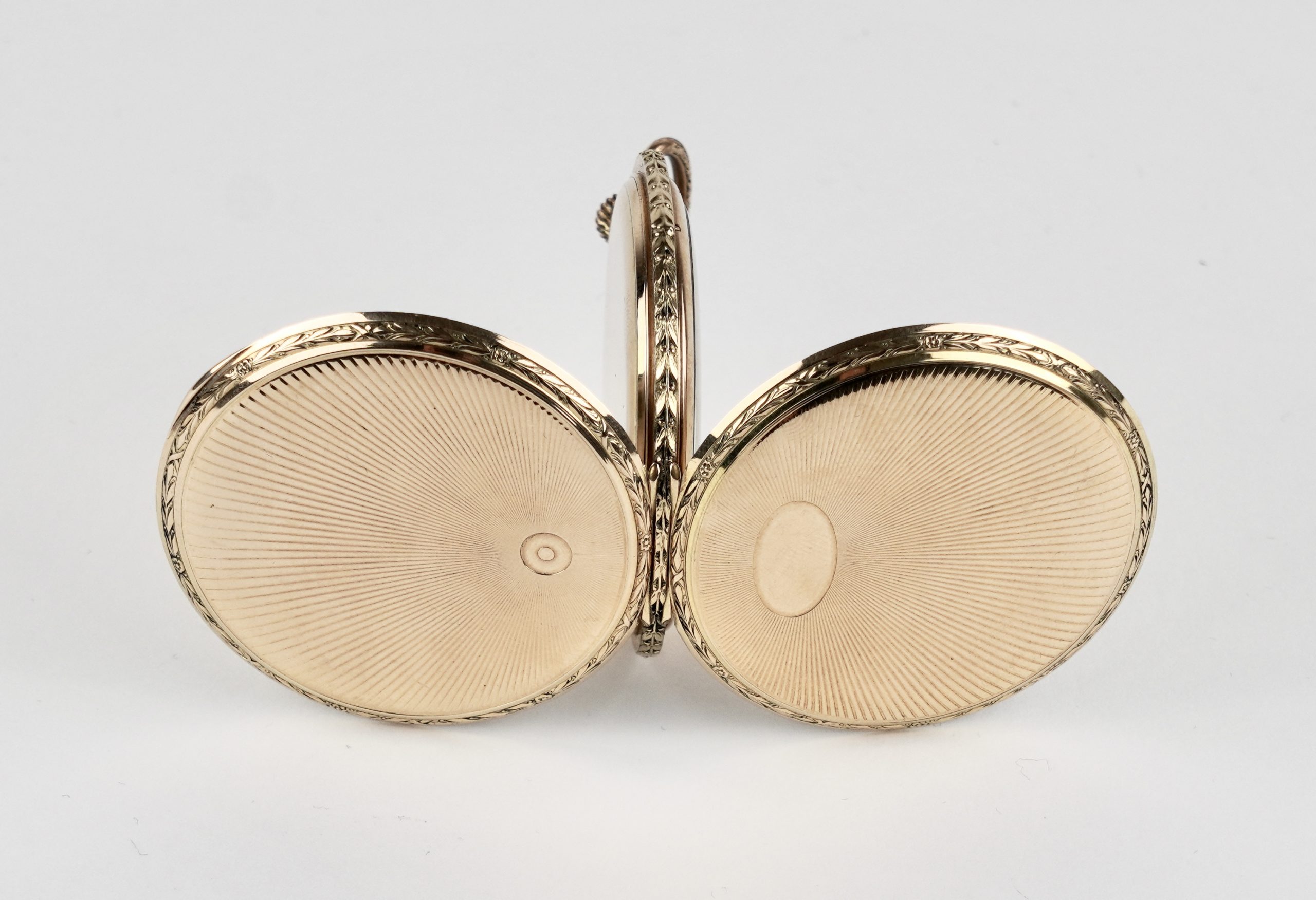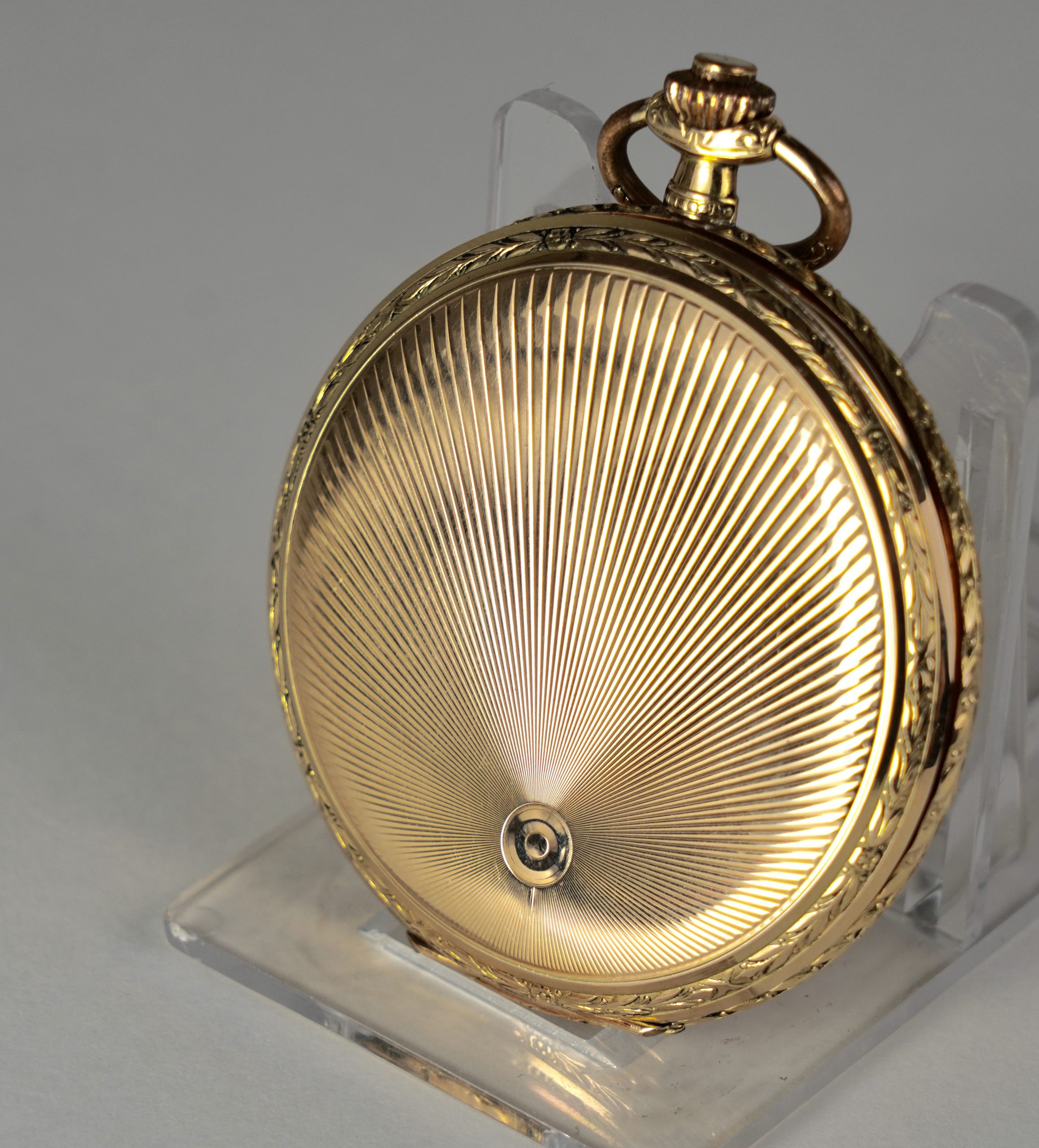Eine Savonette (Sprungdeckeluhr) mit drei Deckeln gearbeitet in 14 Karat (585/1000) Gelbgold mit Sunburst Dekor.