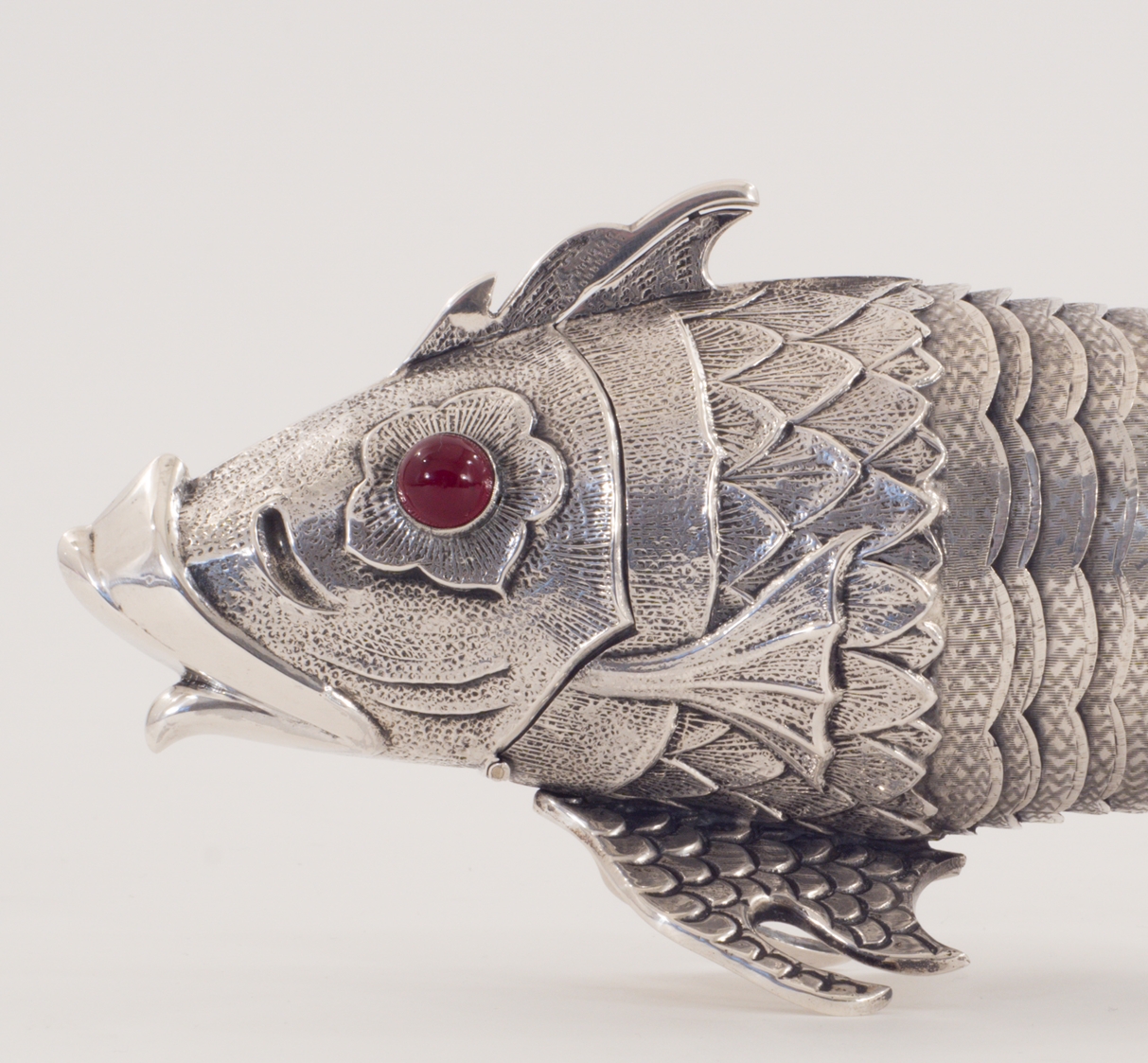 Eine seltene Besamimbüchse in Form eines beweglichen Fisches. Ein Fisch als Besamimbüchse, gearbeitet in 915/1000 Silber.