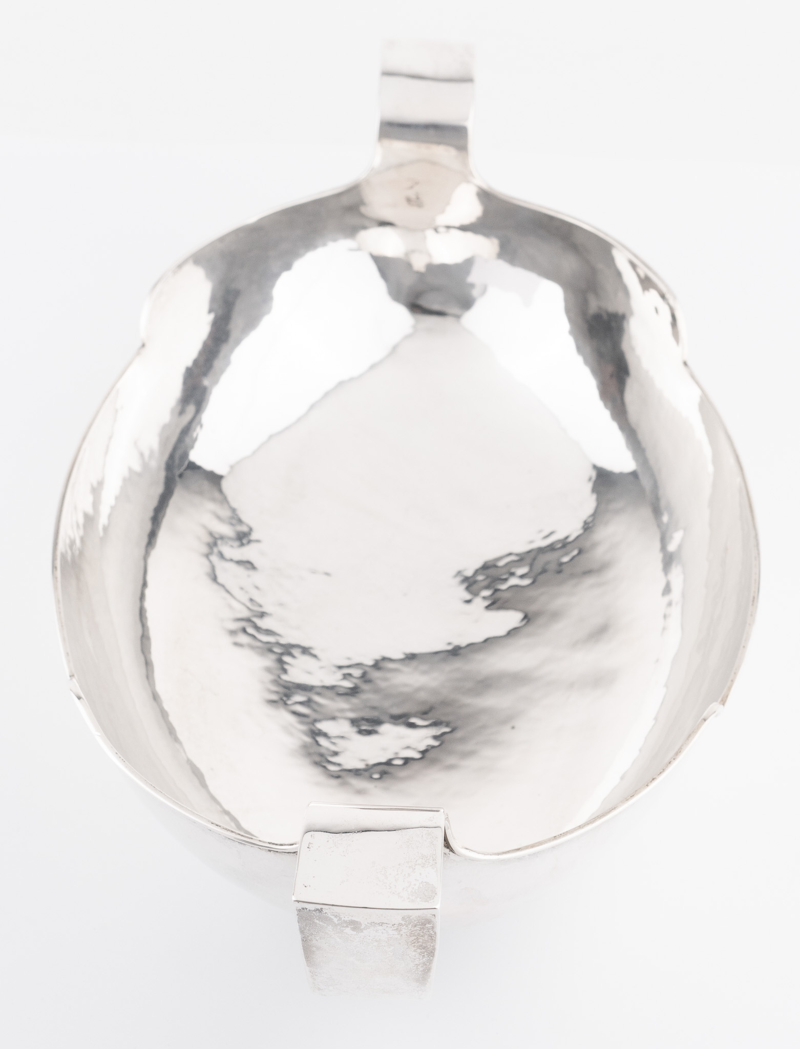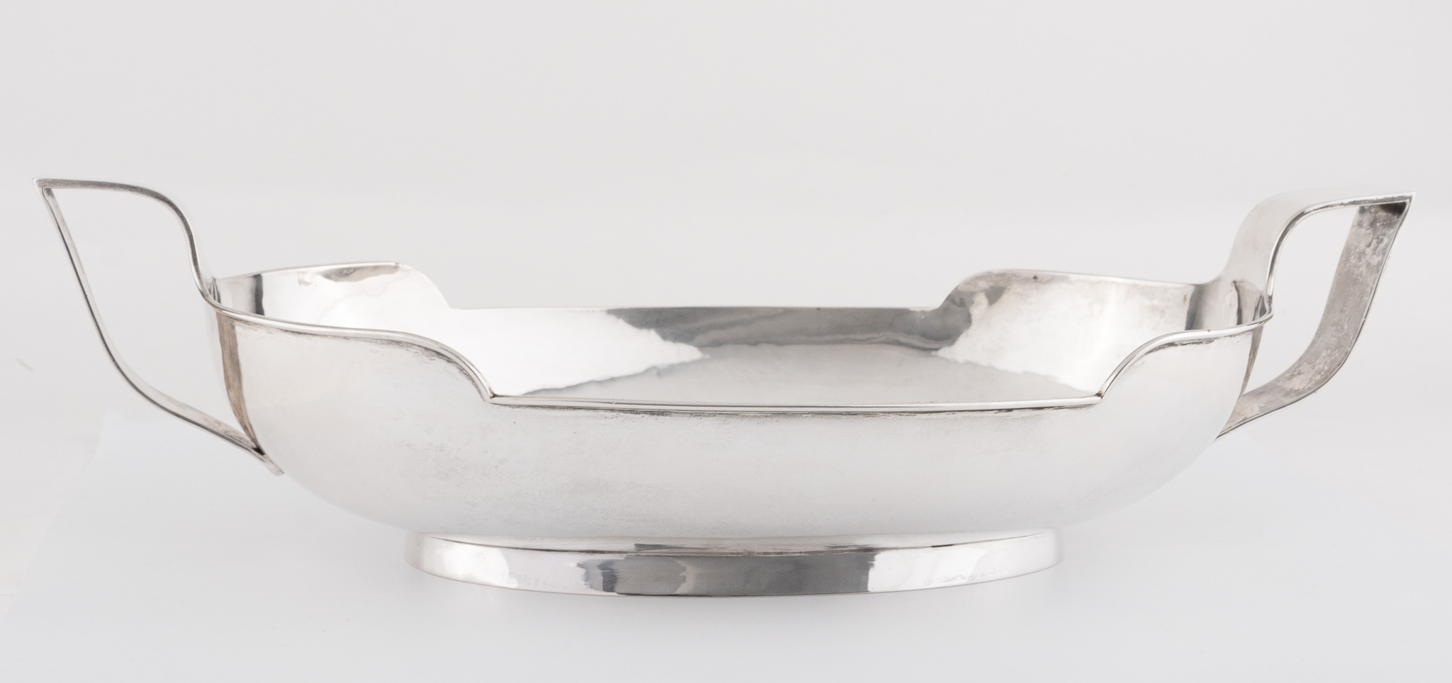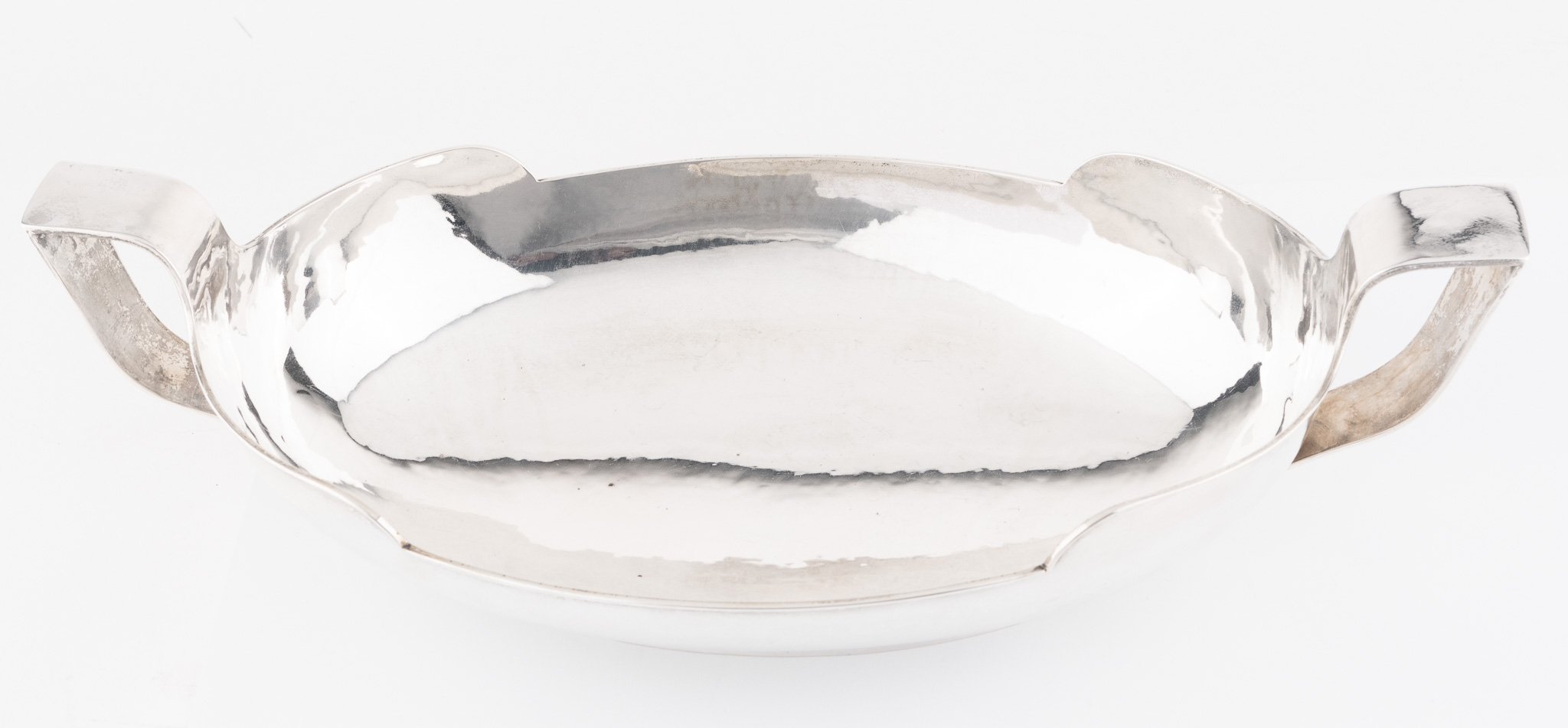 Eine solide Schale aus 835er Silber mit seitlich angesetzten Griffen, glattem, hochpoliertem Dekor und Hammerschlag-Optik im Inneren. Deutschland, Mitte 20. Jahrhundert