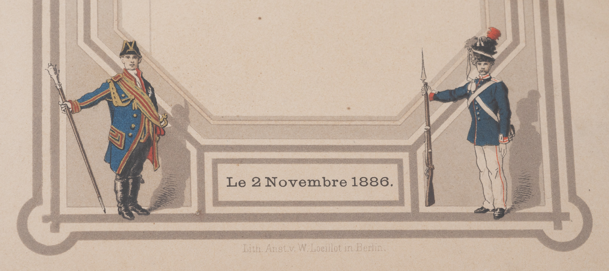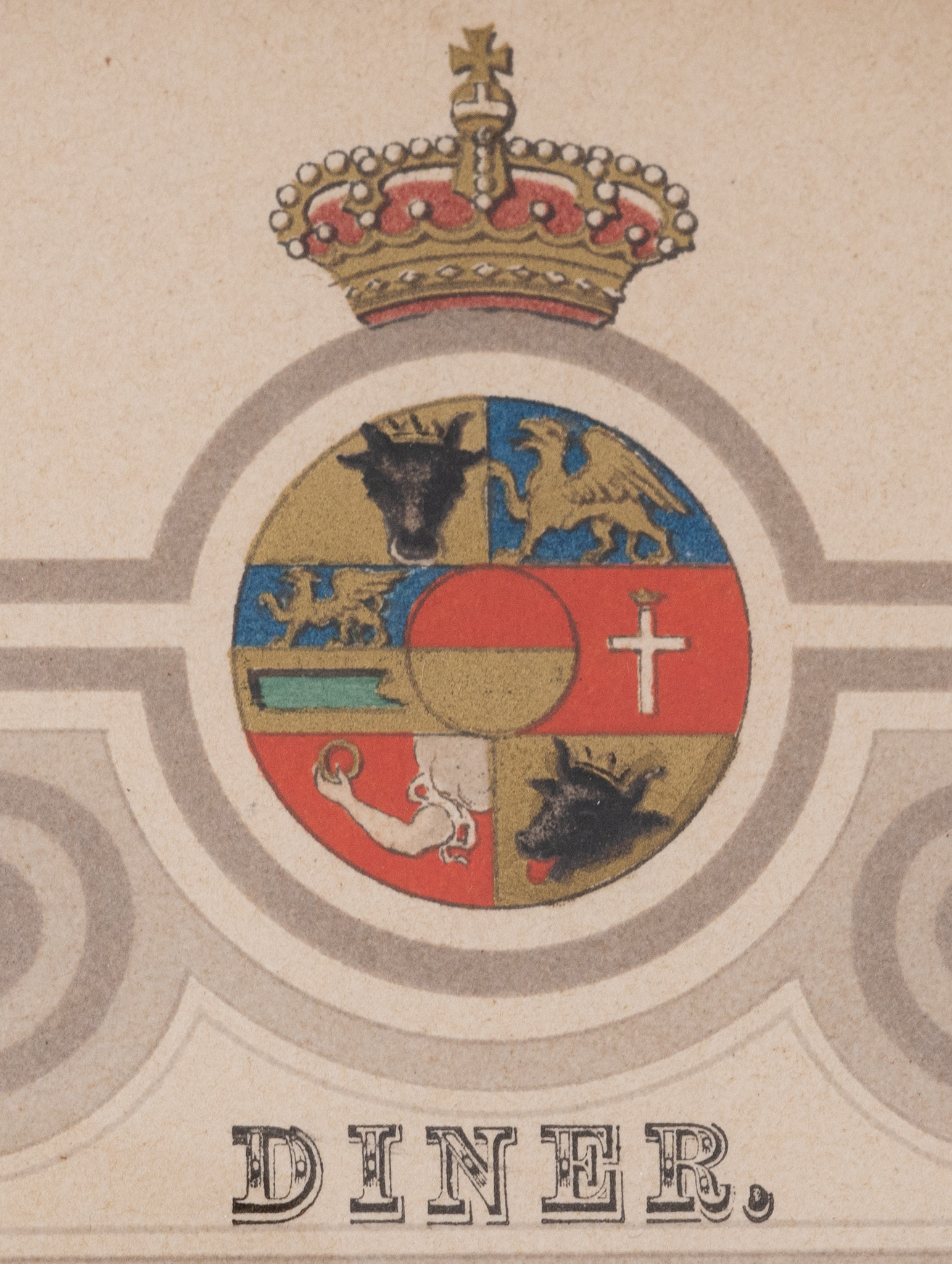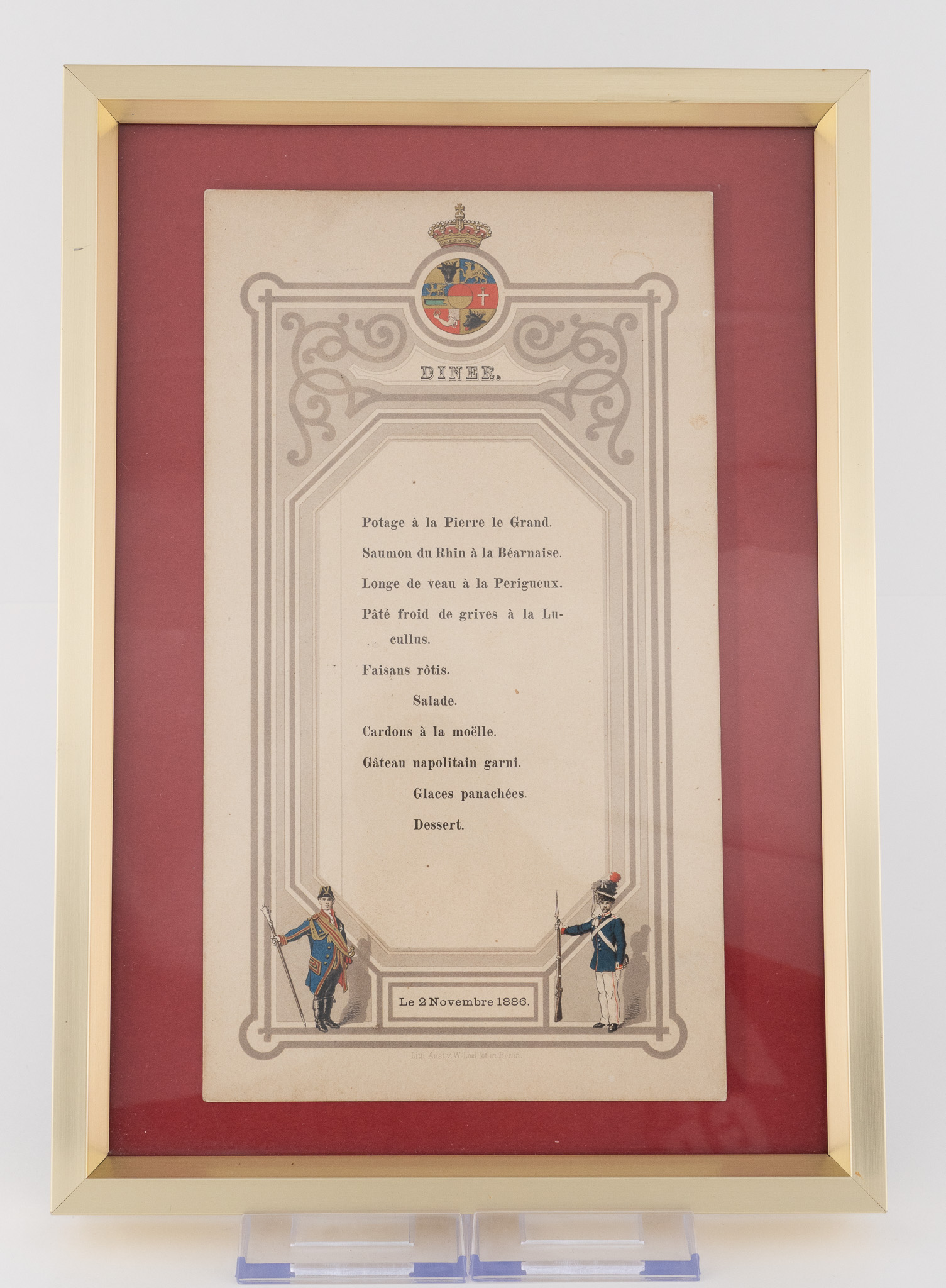 Eine äußerst seltene und fein kolorierte Speisekarte von einem Empfang des Großherzogs zu Mecklenburg-Schwerin. Die Karte ist datiert: 2. November 1886, also aus der Herrschaftszeit von Großherzog Friedrich Franz II.
