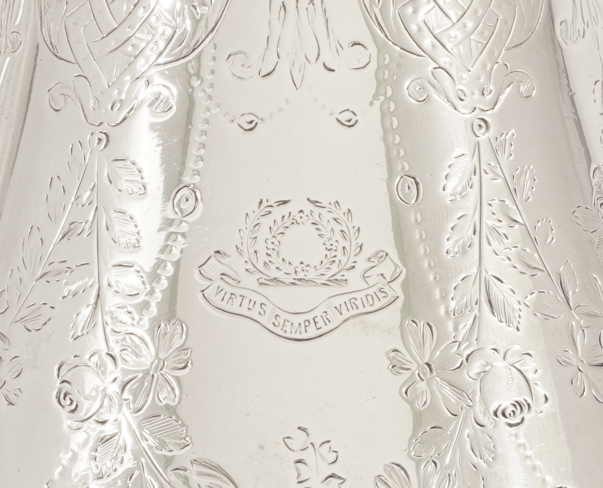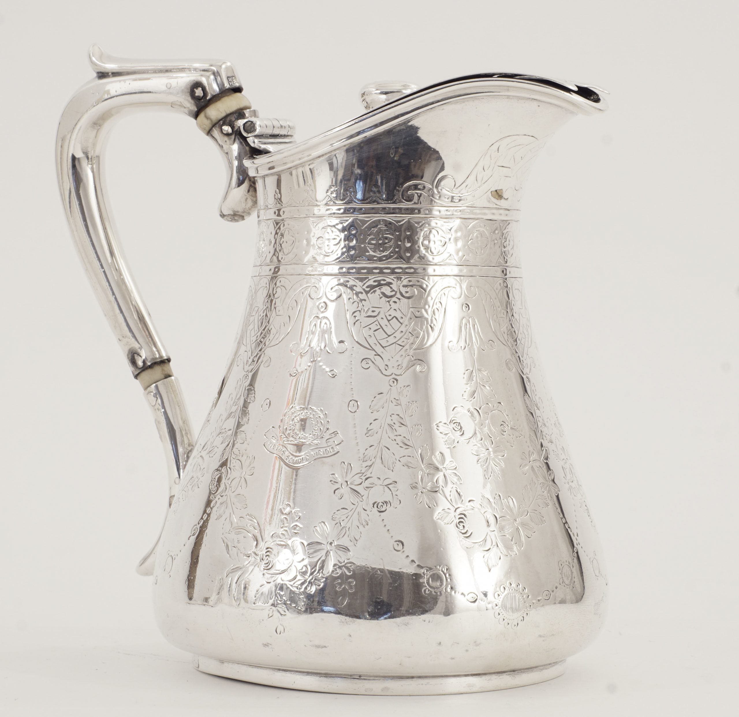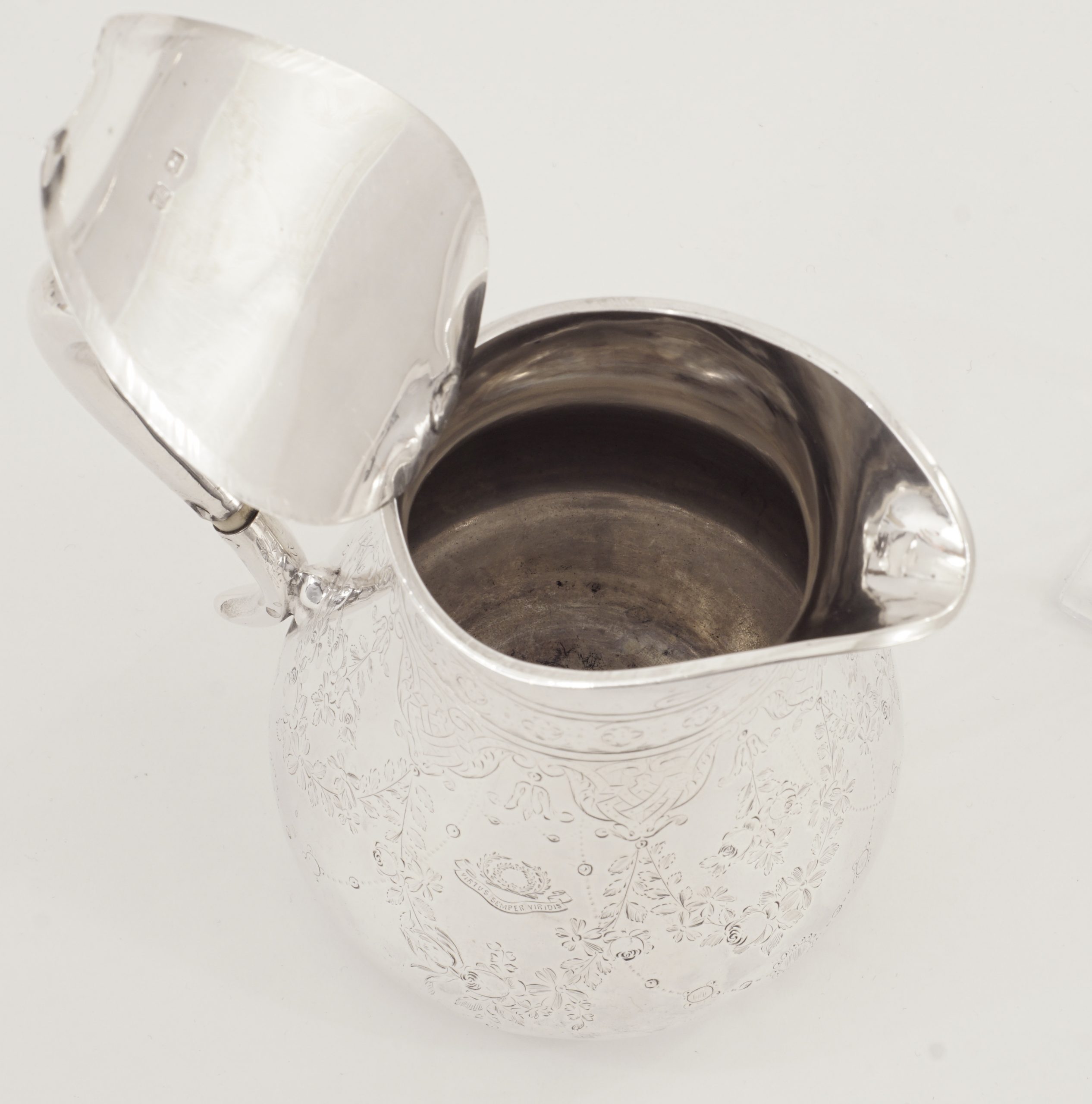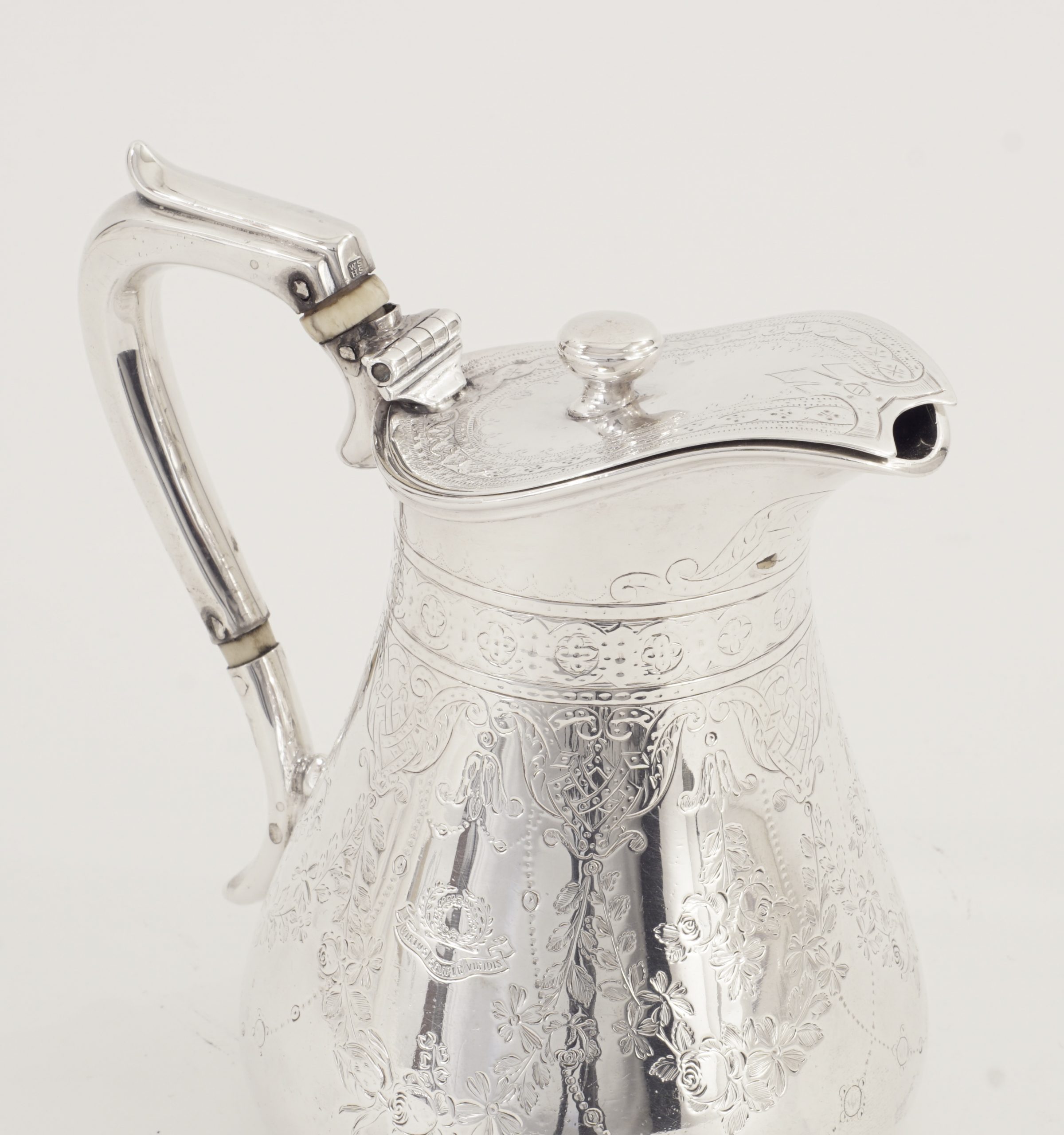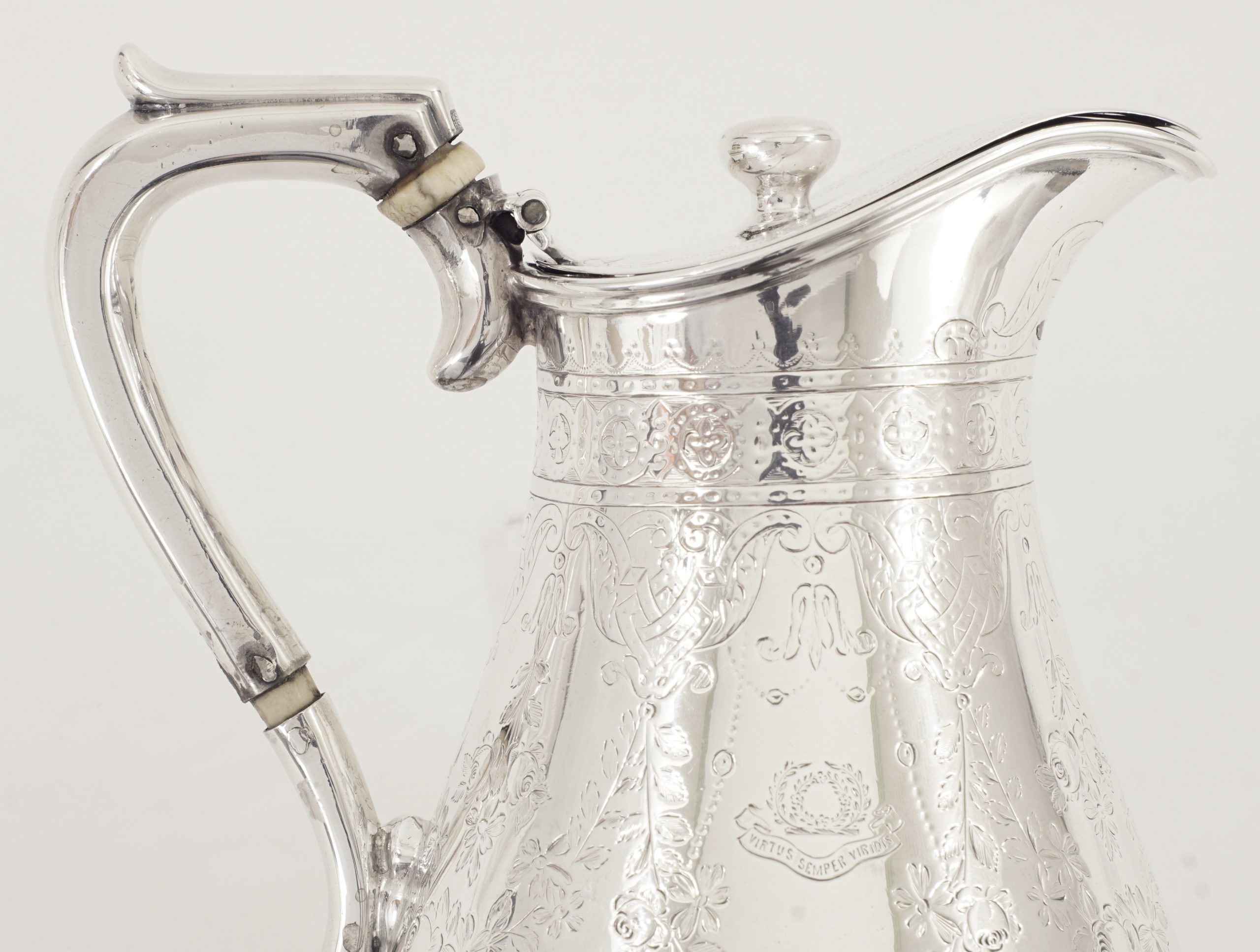 Eine Viktorianische Heißmilch-/Heißwasserkanne gefertigt in 925er Sterlingsilber. Reich dekoriert u.a. mit Floral- und Bandelwerk. Auf einer Seite das gravierte Familienwappen der schottischen Familie Lowrey.