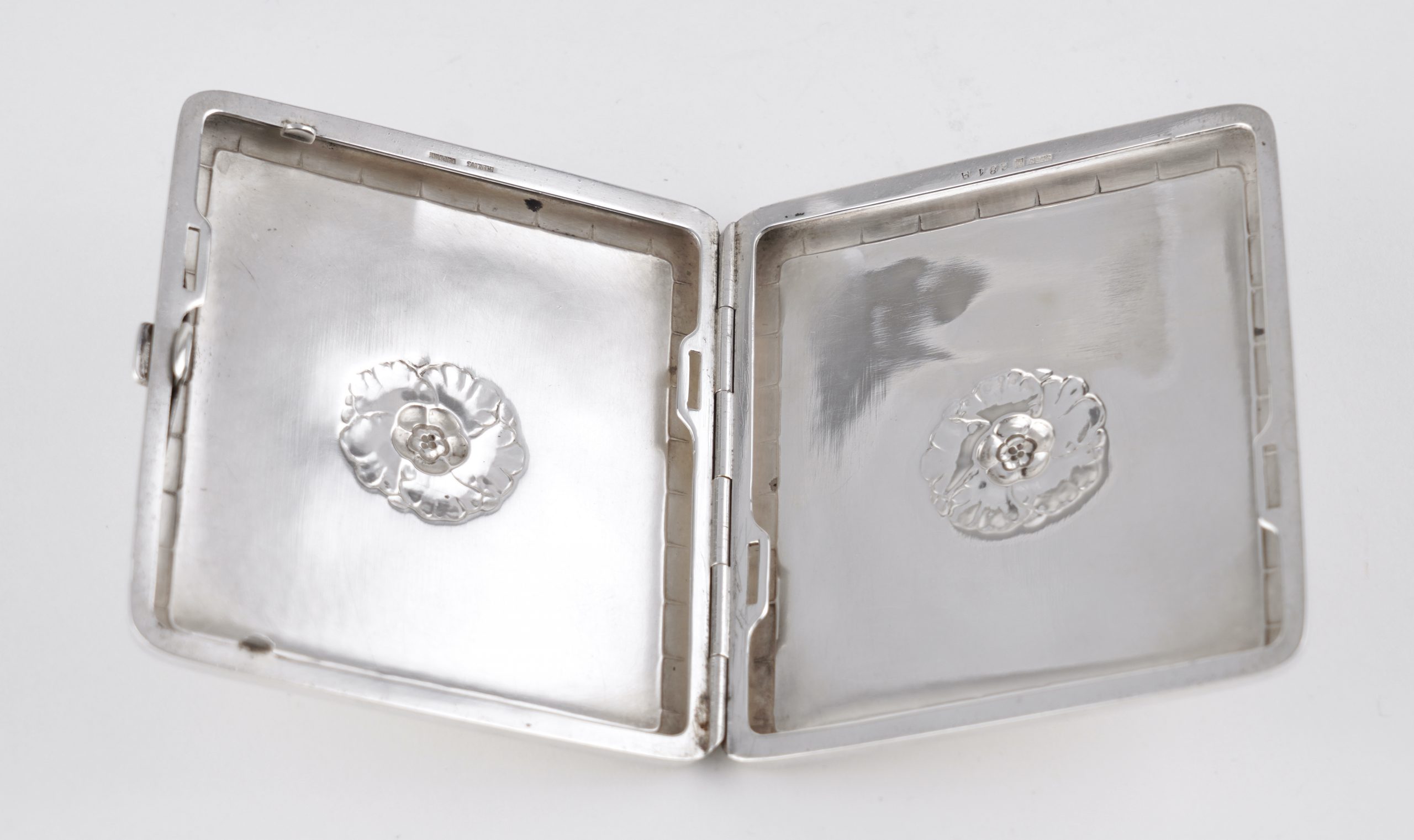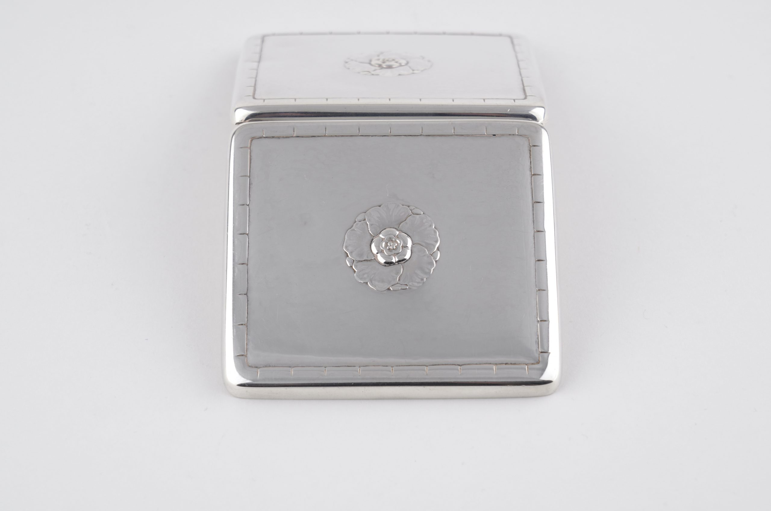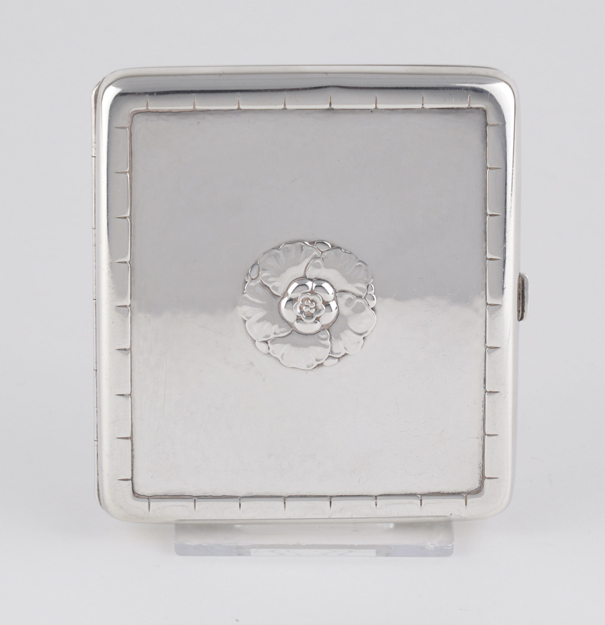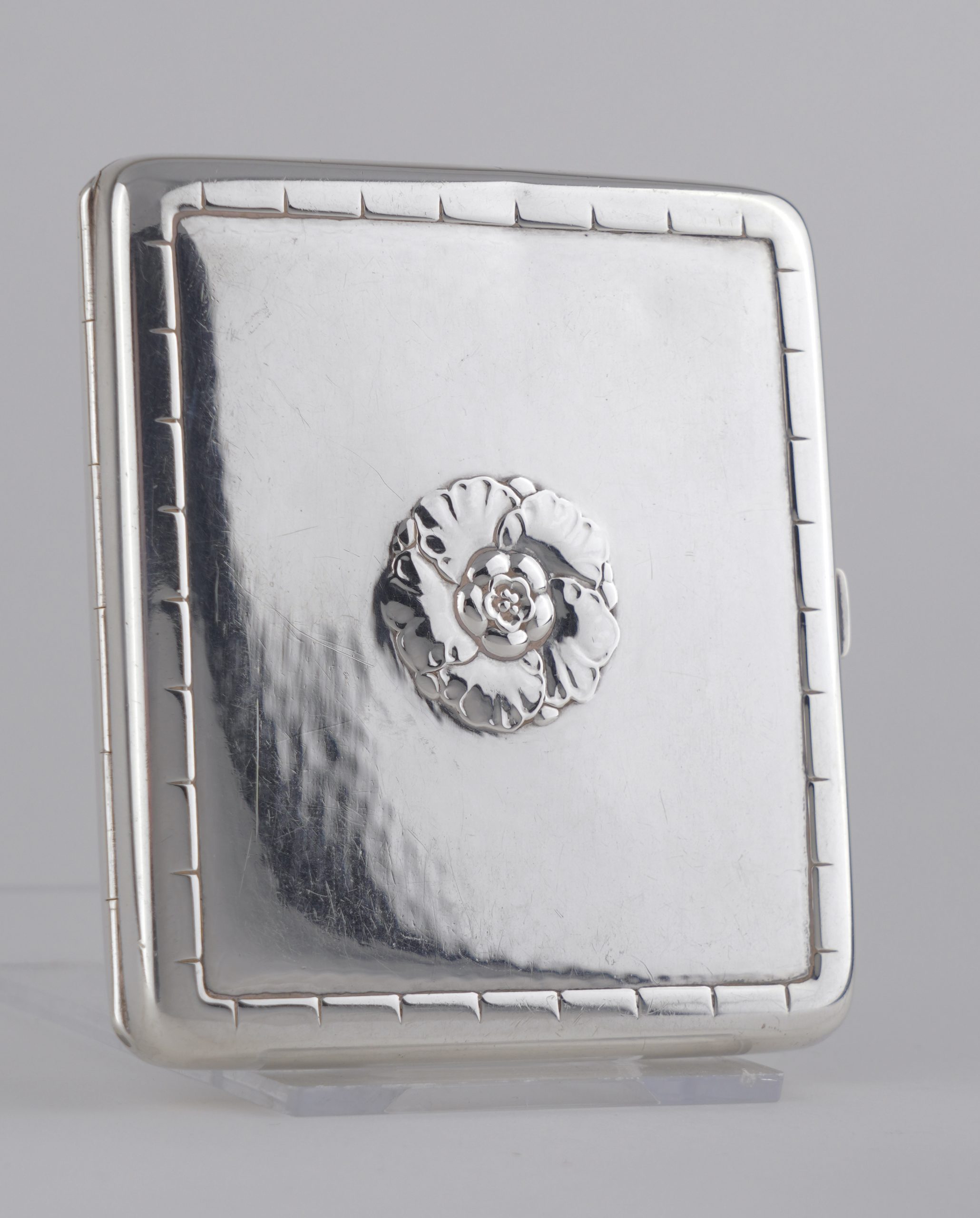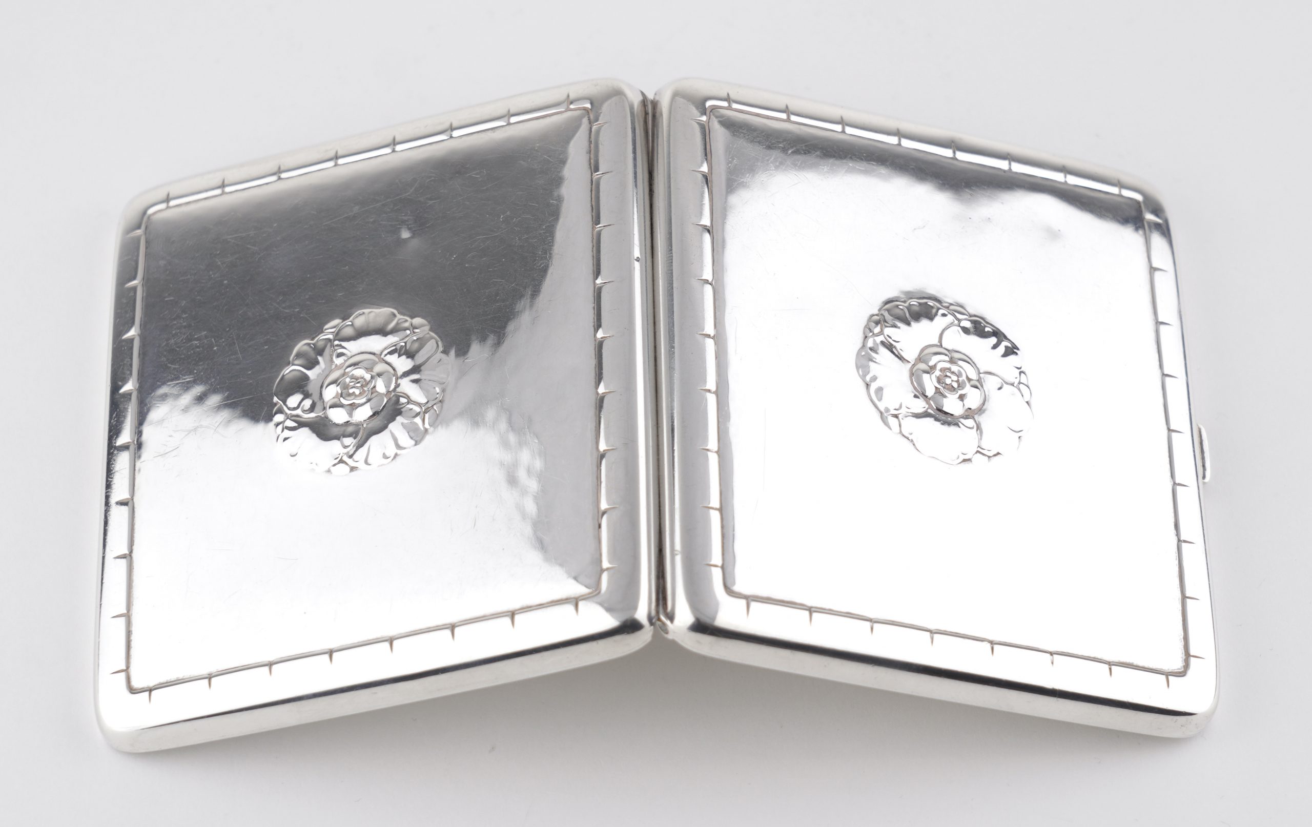 Ein seltenes Zigarettenetui von Georg Jensen 1933/44 – Hammerschlagoptik, auf der Vorderseite und der Rückseite mit einer Blüte.