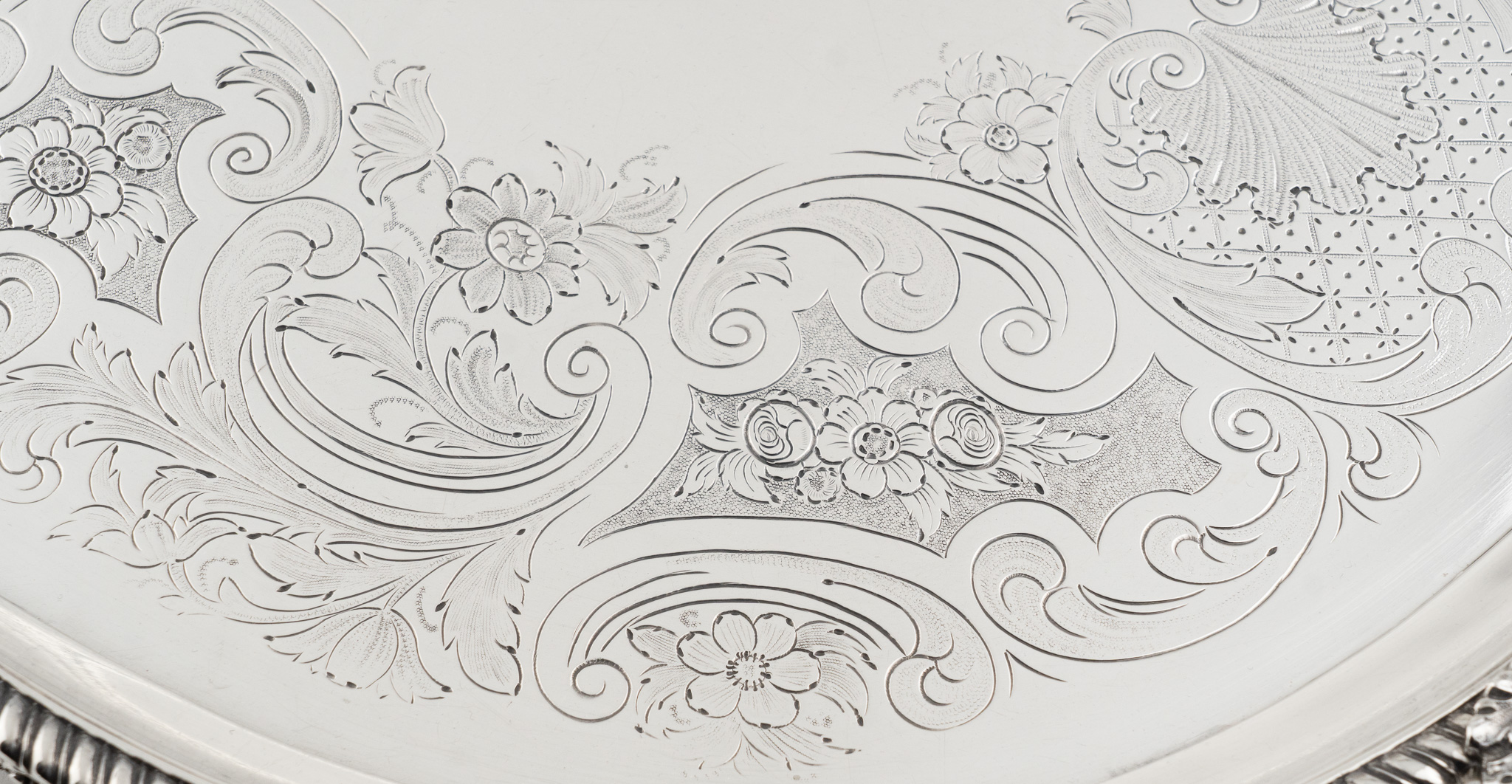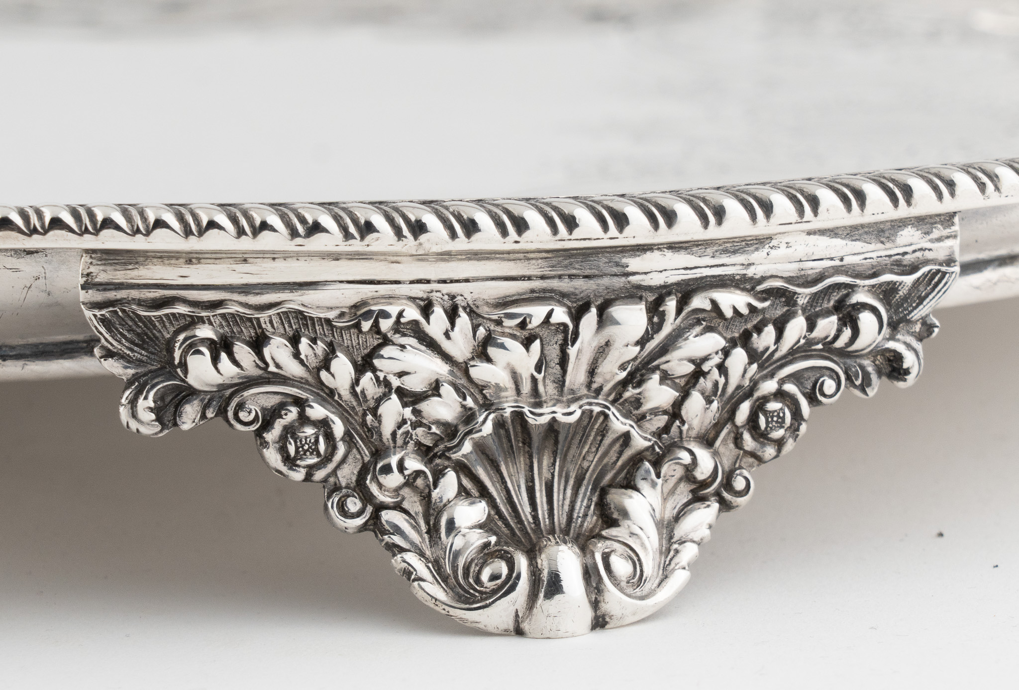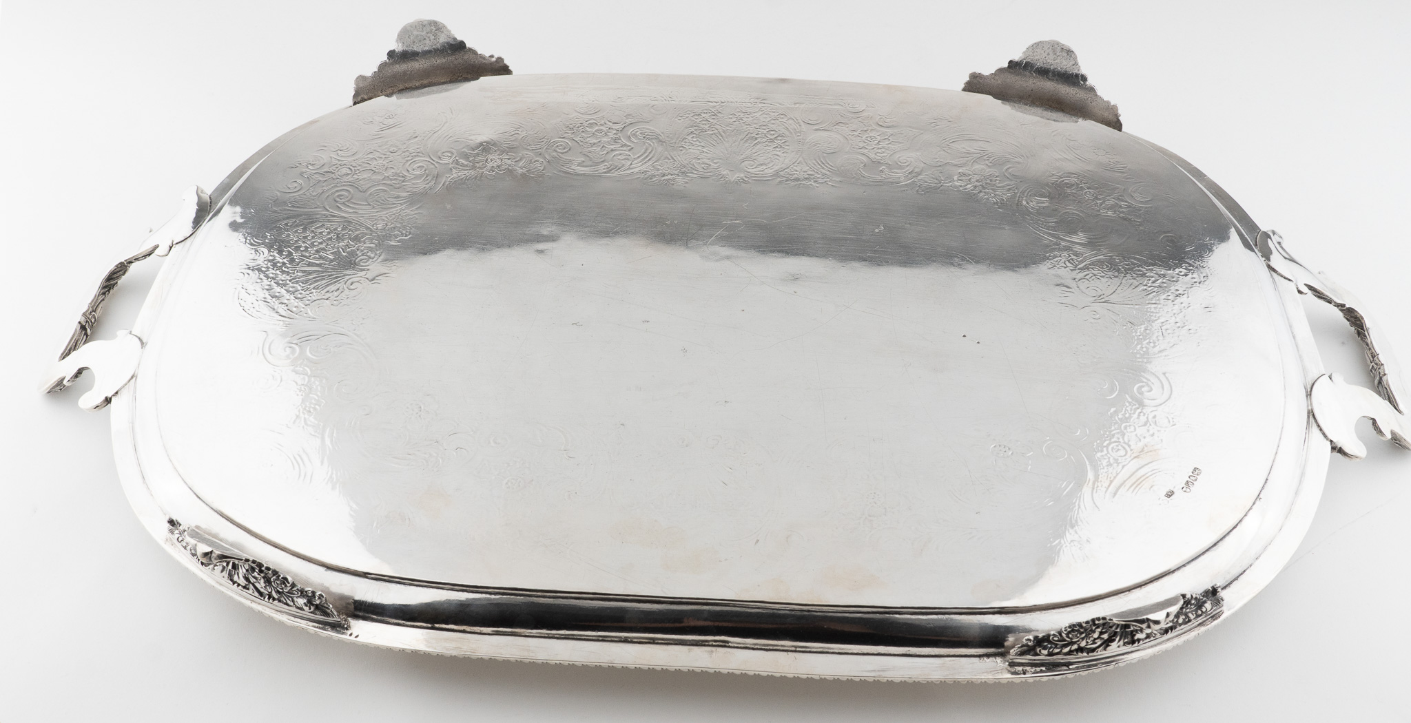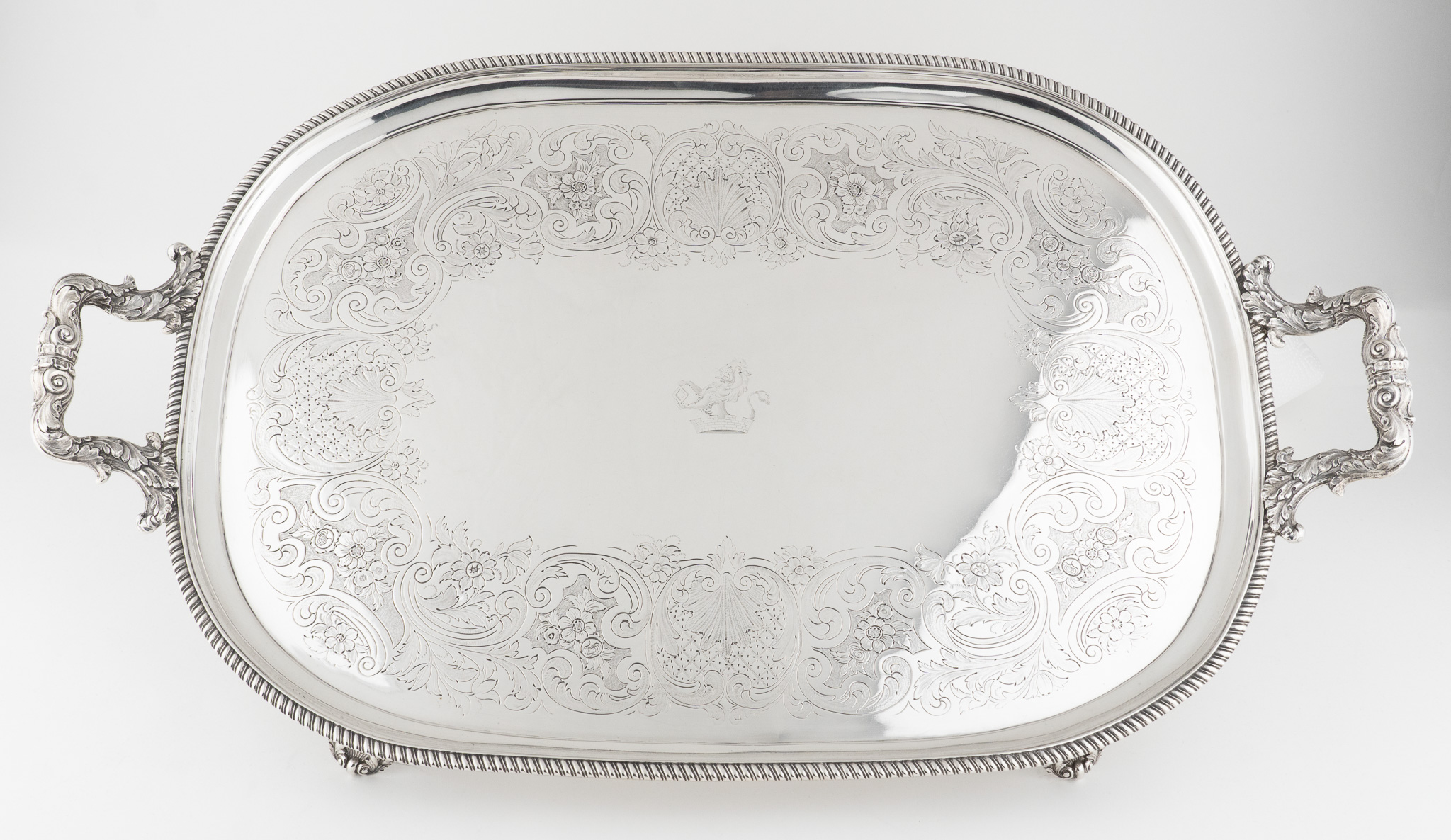 Tablett stehend auf vier Löwentatzen Füßen. Feine Floral- und Rocaillen-Gravuren. Mittig ein englisches Familien Wappen (Löwe)