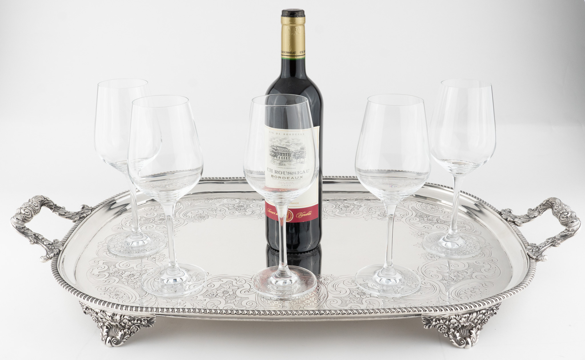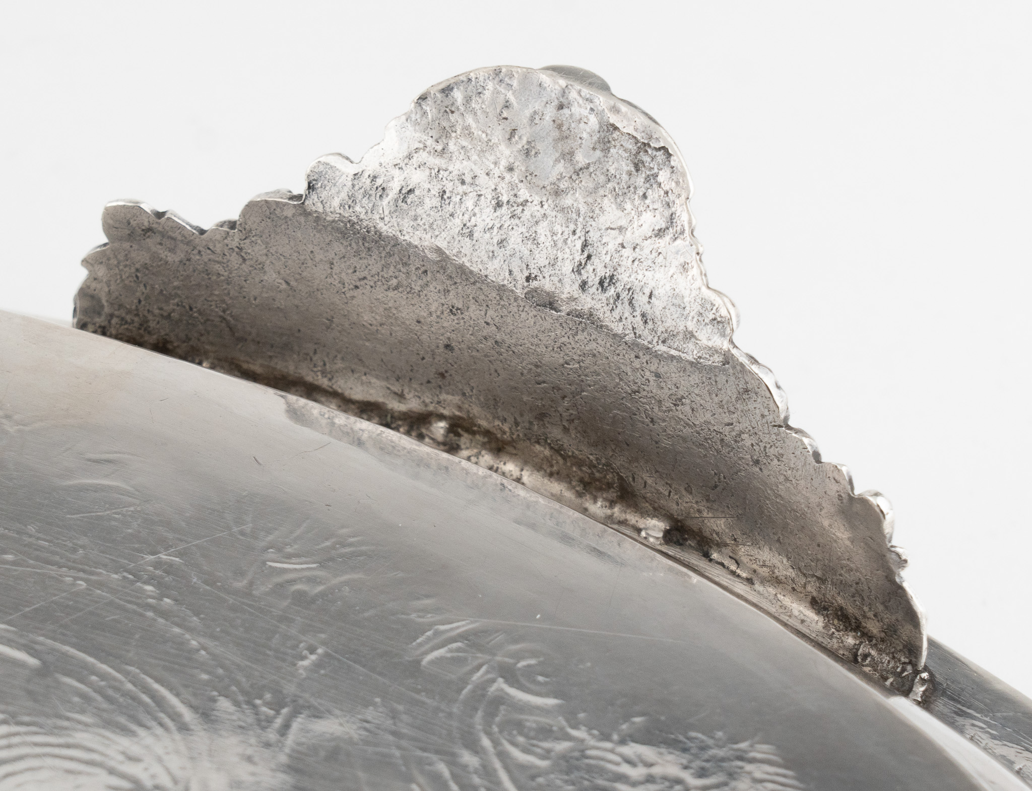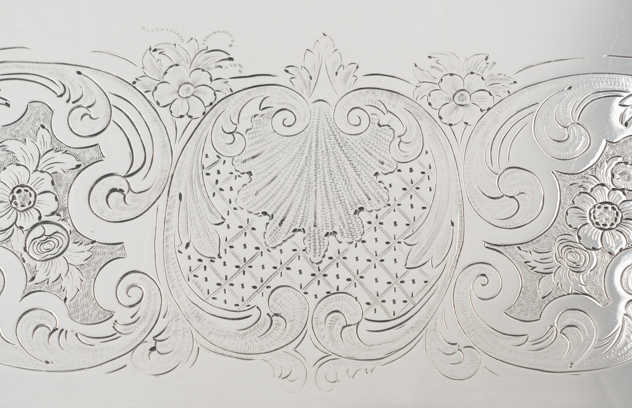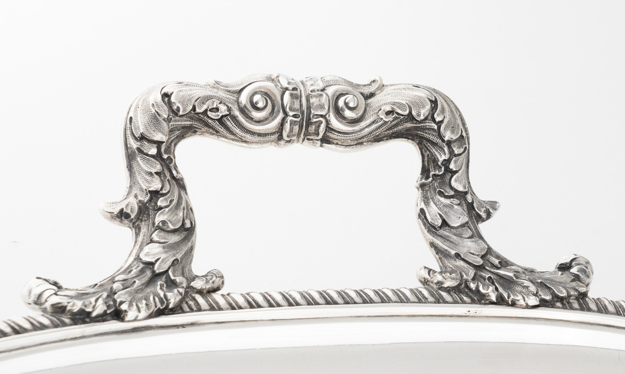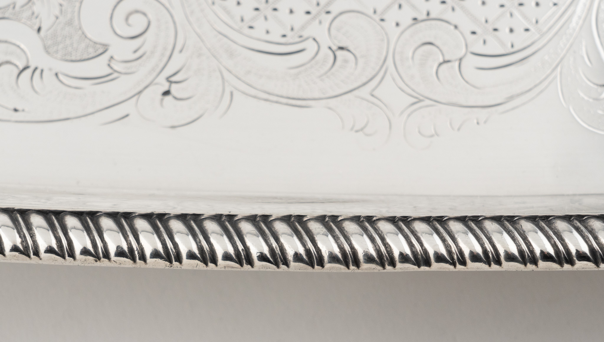 Tablett stehend auf vier Löwentatzen Füßen. Feine Floral- und Rocaillen-Gravuren. Mittig ein englisches Familien Wappen (Löwe)