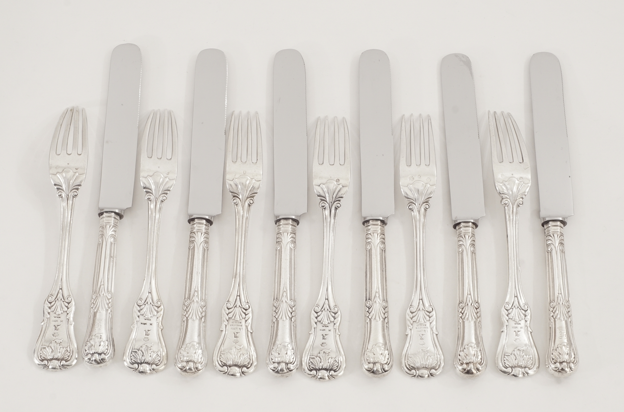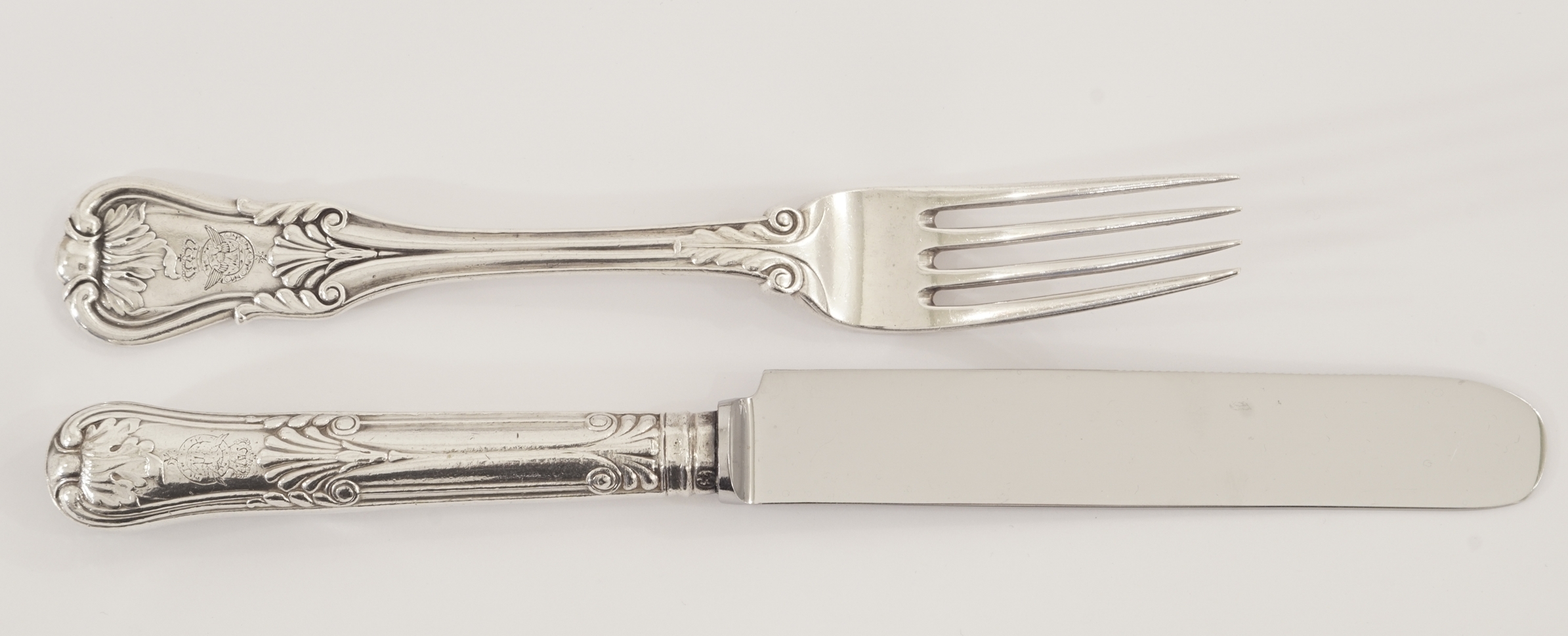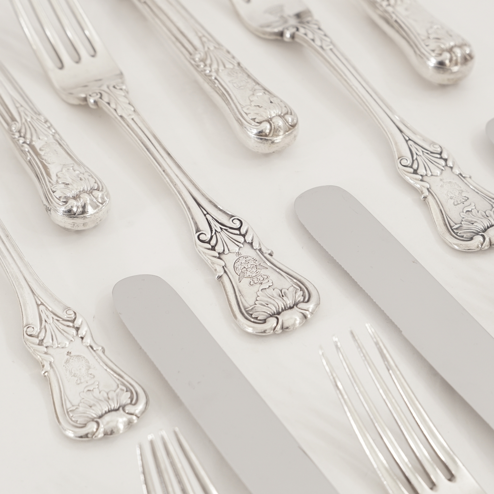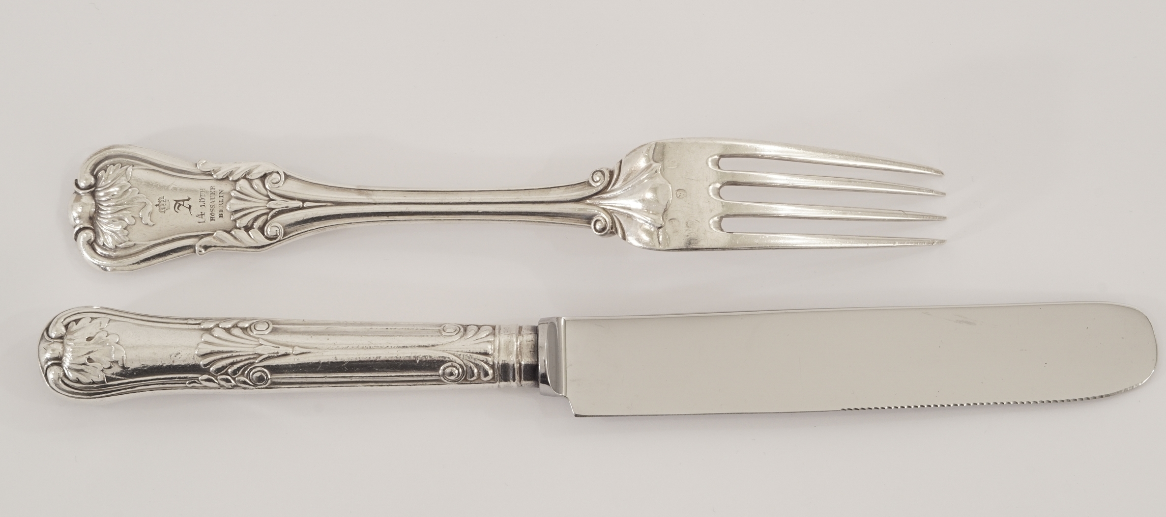 Sechs Sätze bestehend aus je einer Gabel und einem Messer aus dem Besitz der Kaiserin Augusta (1811 – 1890), der Gemahlin von Kaiser Wilhelm I. von Preussen, gearbeitet in 14 Lot (875/1000) und 15 Lot (937,5/1000) Silber im Kings Pattern Dekor.
