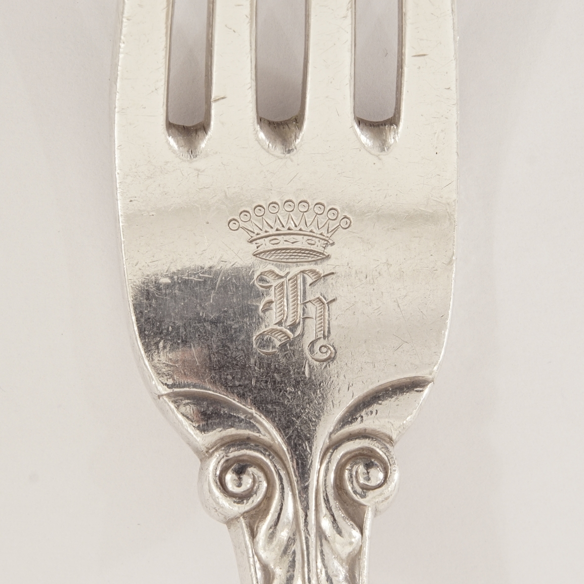 4 Gabeln und 2 Messer mit späterem bekrönten Besitzermonogramm „h“.