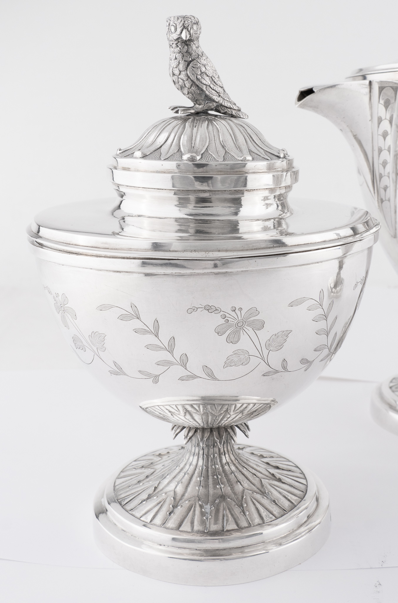 Set bestehend aus einer Kaffeekanne, Heißmilchkanne und einer Zuckerdose, alle Objekte bekrönt mit einem Knauf gearbeitet als vollplastische Eule.