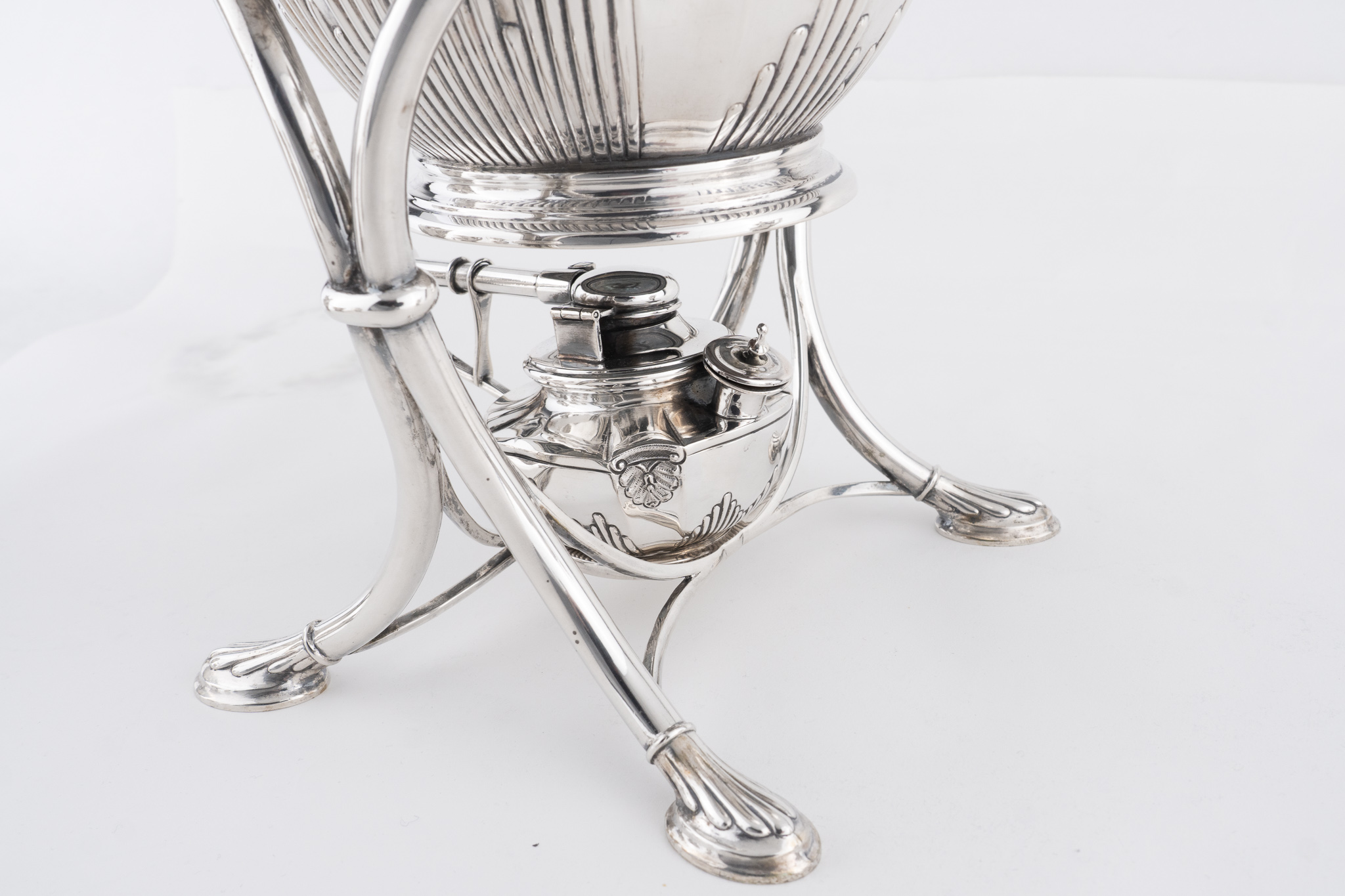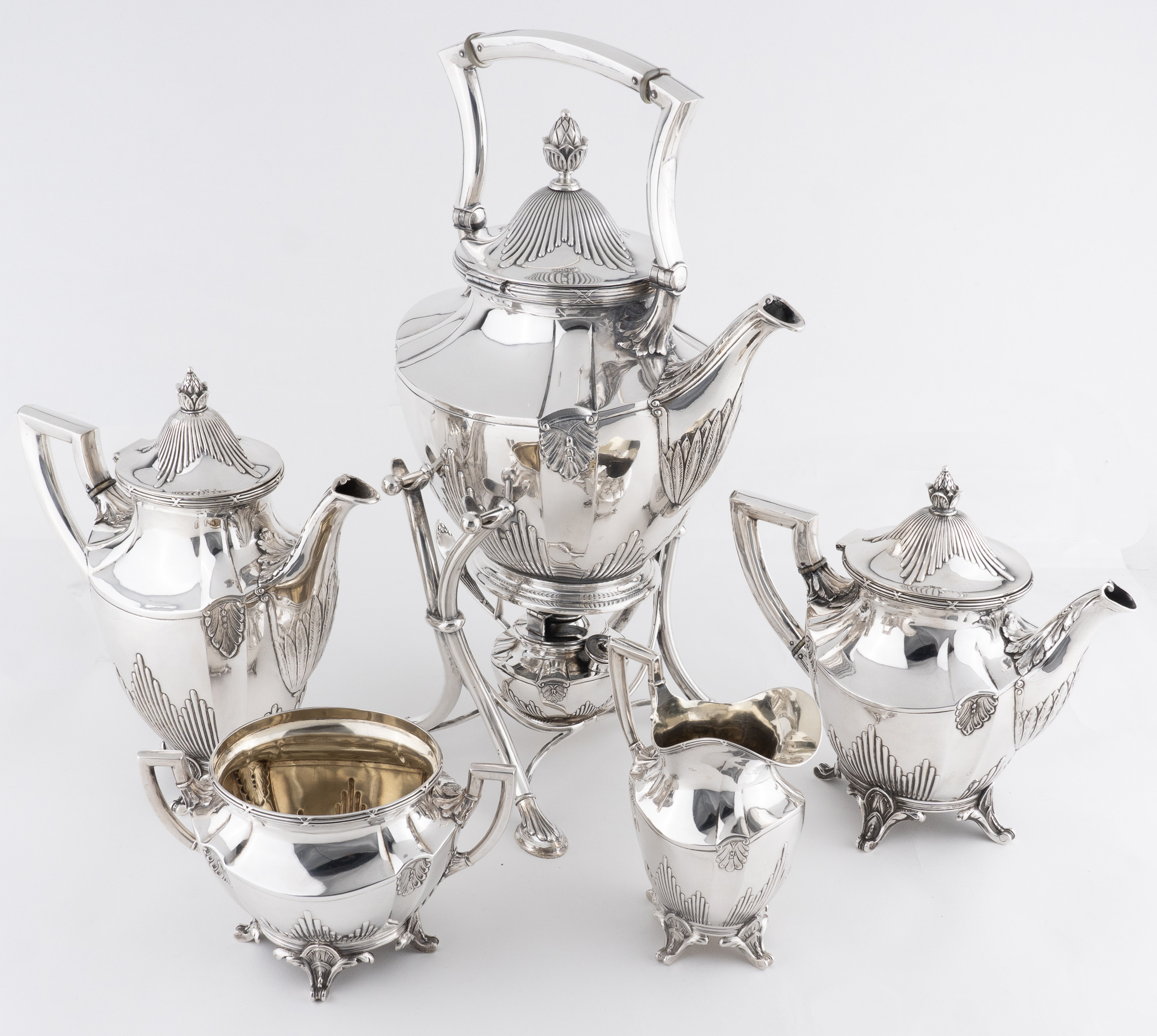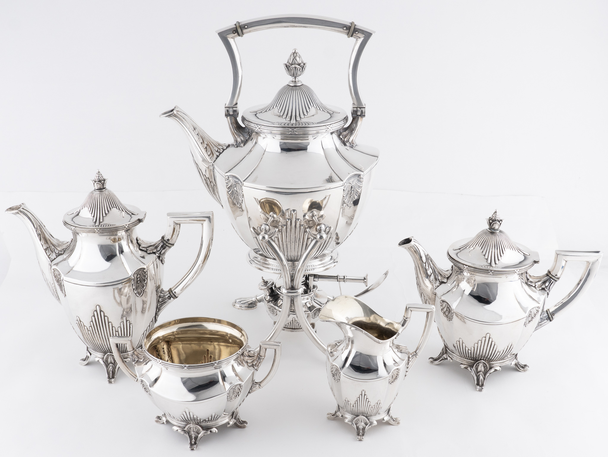 Set bestehend aus einer Heißwasserkessel mit Rechaud und Brenner, einer Teekanne, einer Kaffeekanne einem Milchkännchen und einer Zuckerschale.