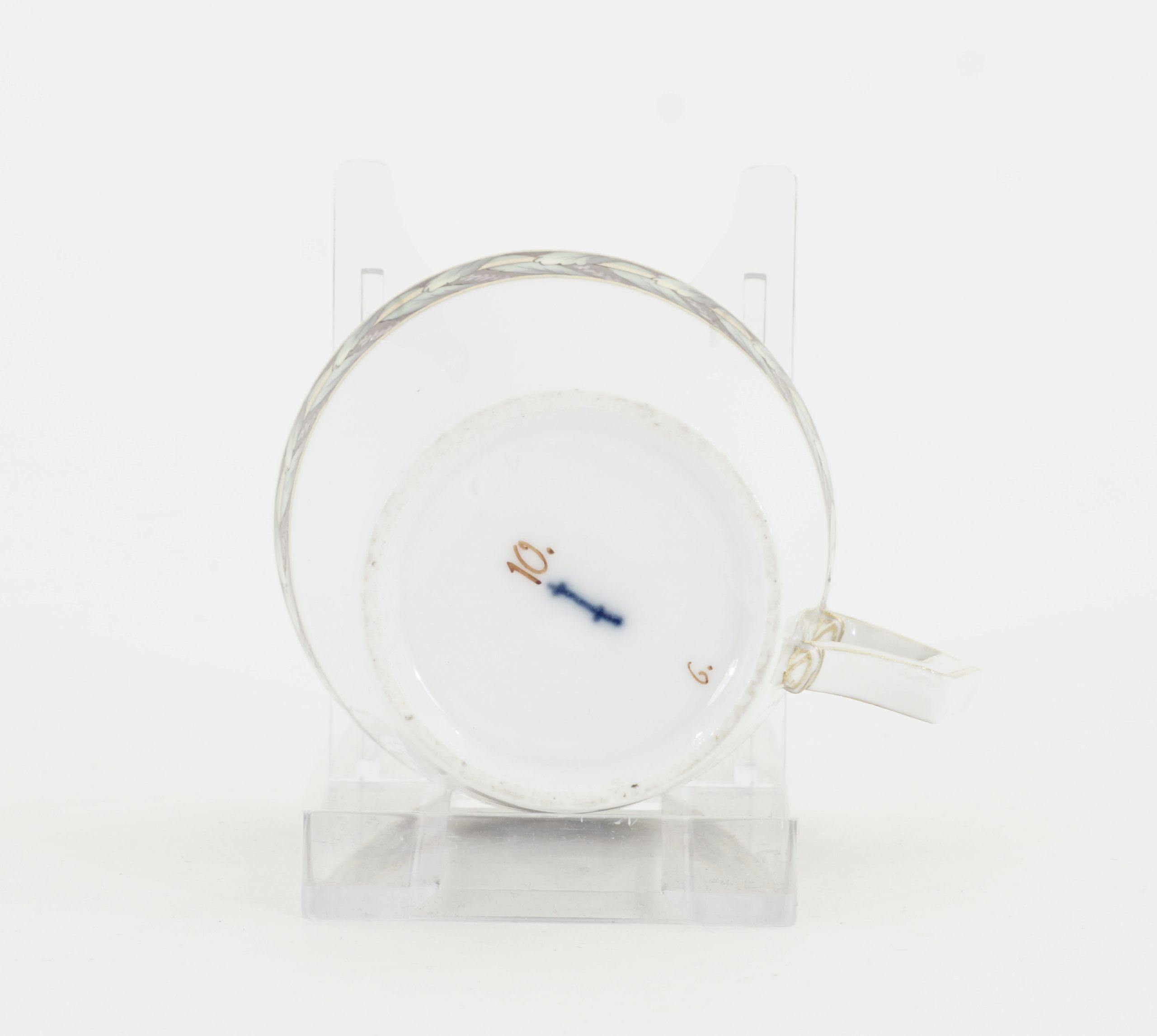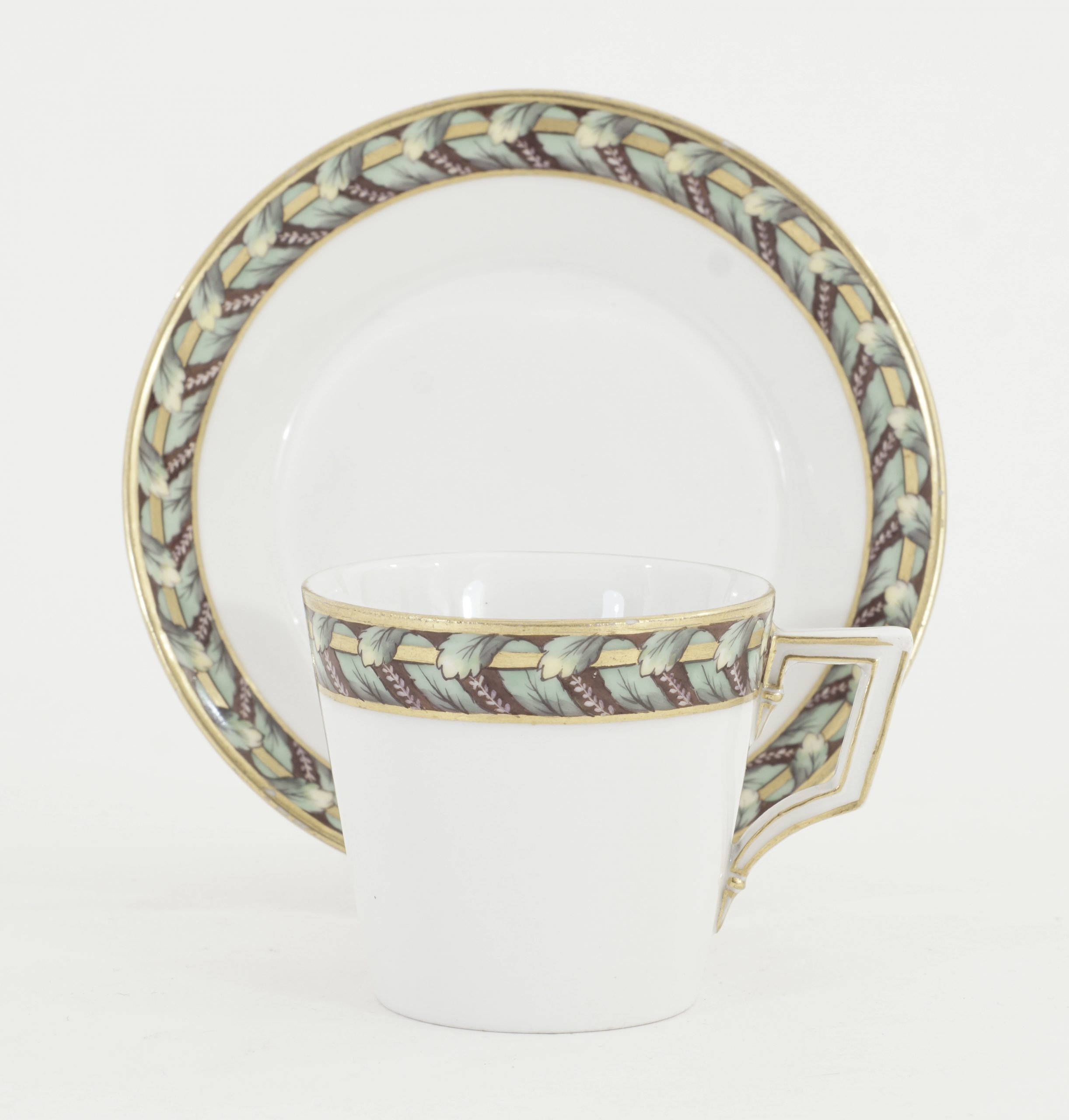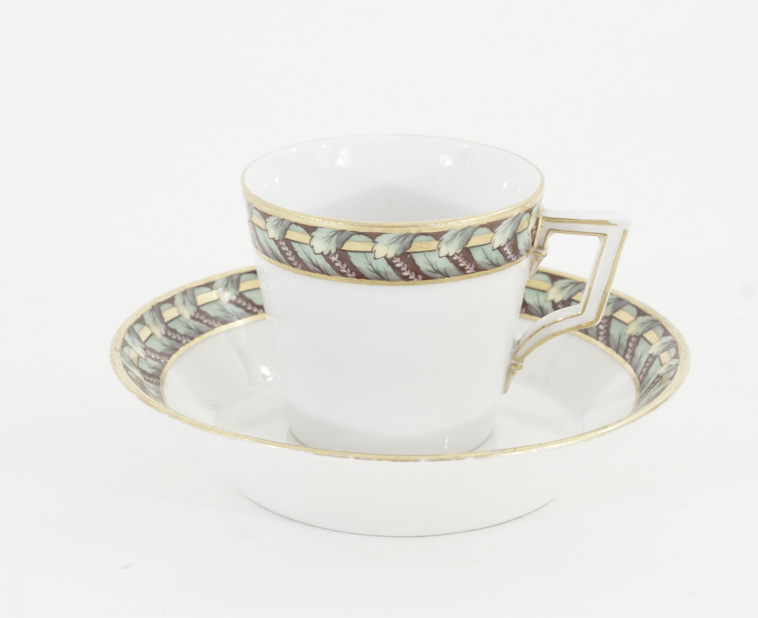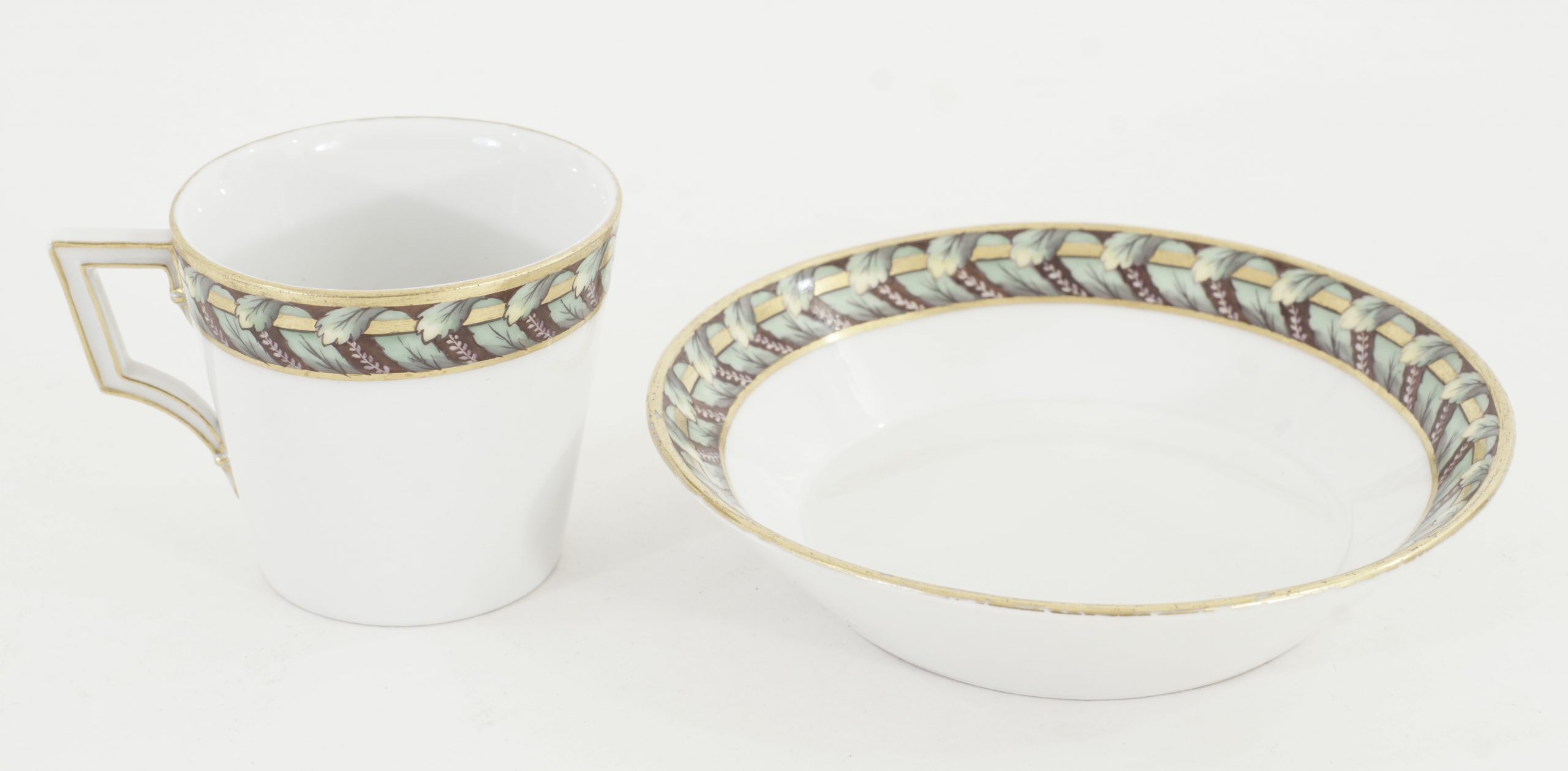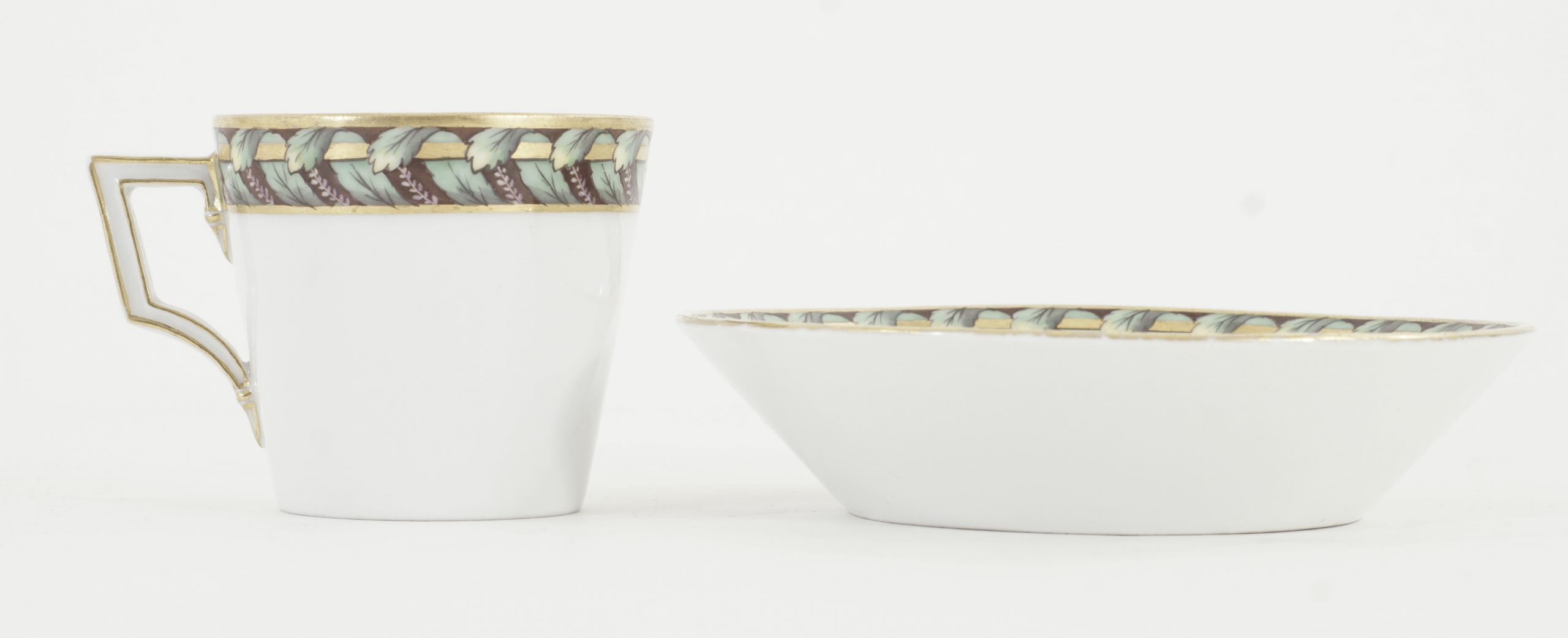 KPM Tasse und Unterasse mit Akanthus Dekor und Goldrand. Klassizistischer Henkel.