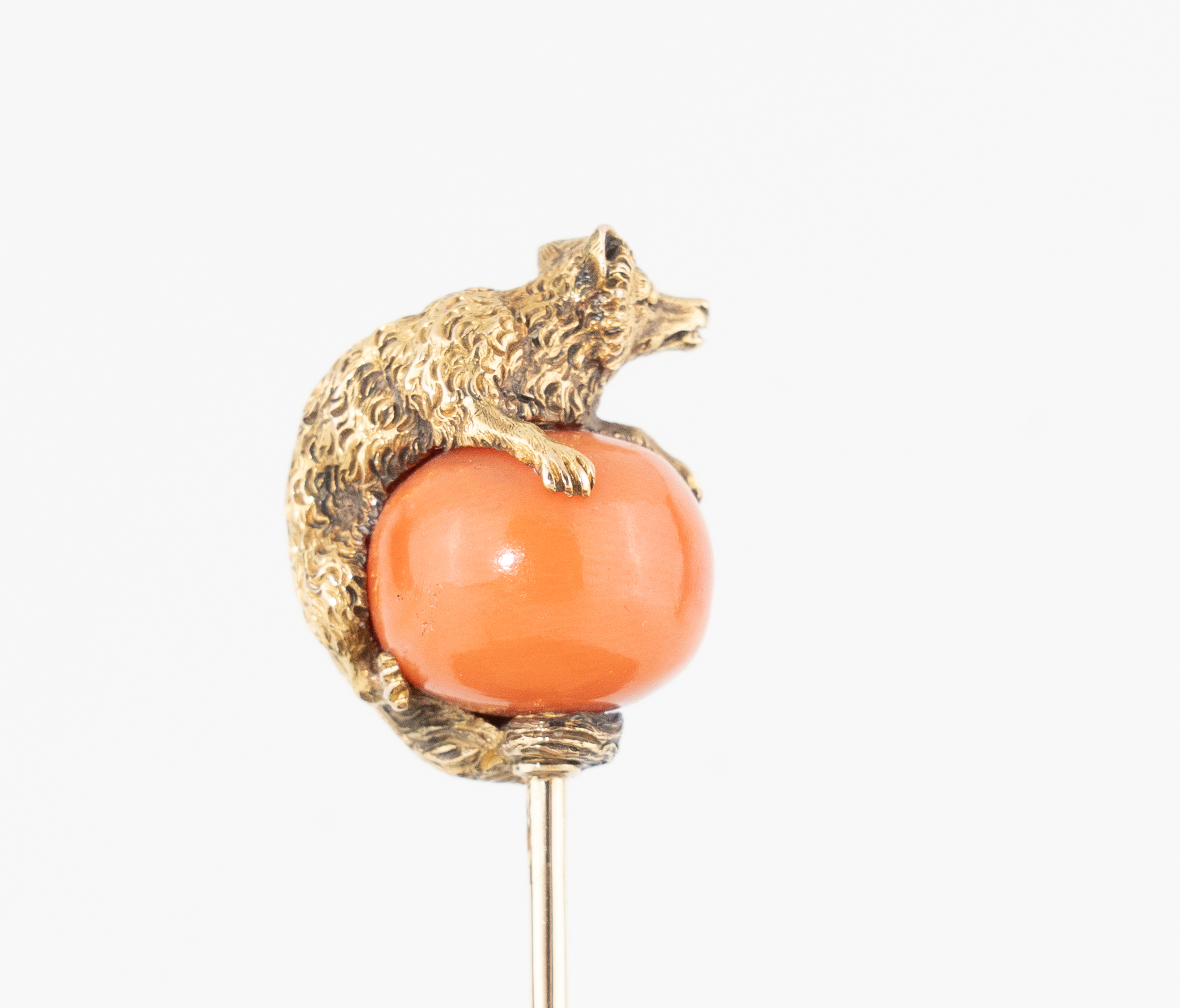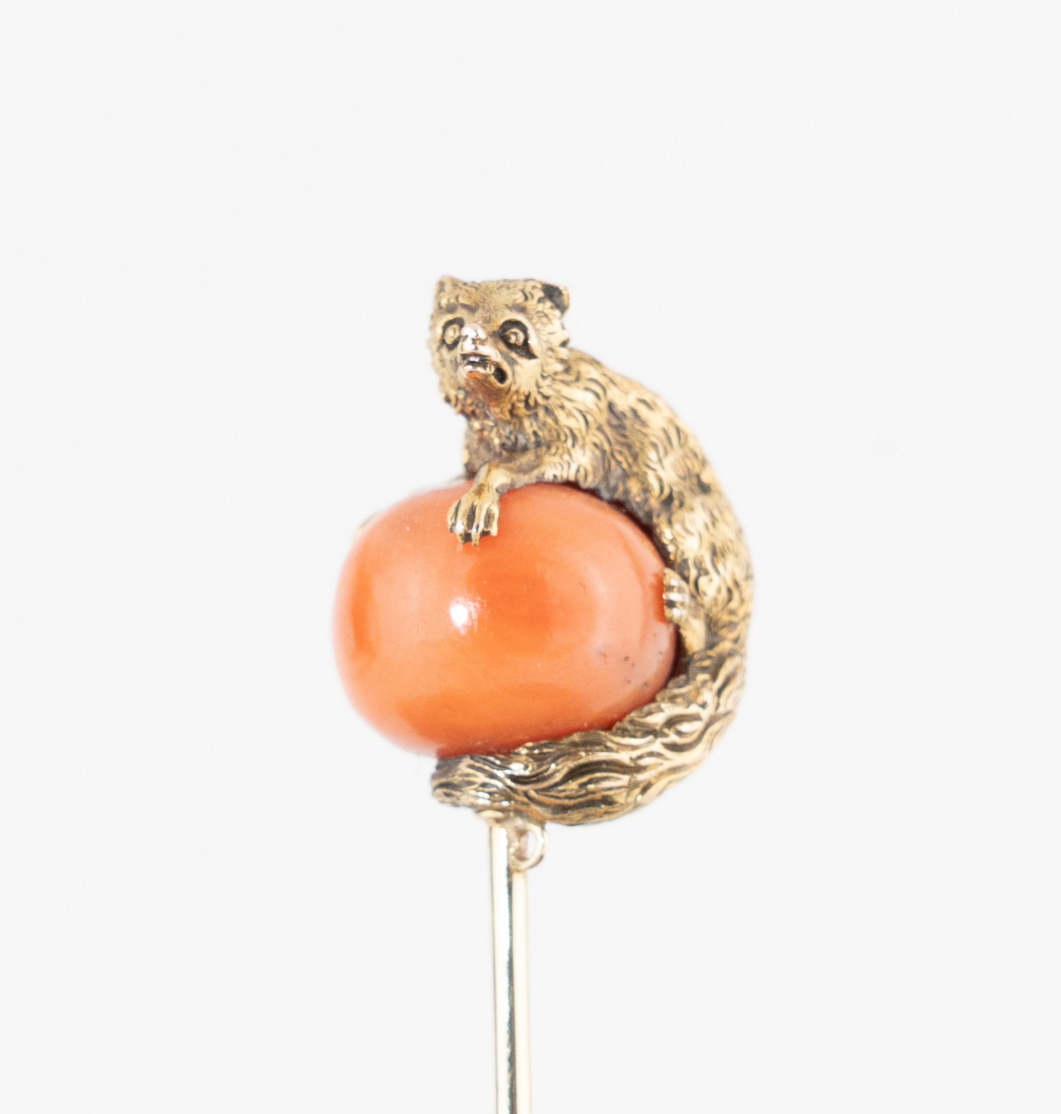 Eine außergewöhnliche Krawattennadel in Form eines auf einer Korallenkugel sitzenden Marders - 14 Karat Gold