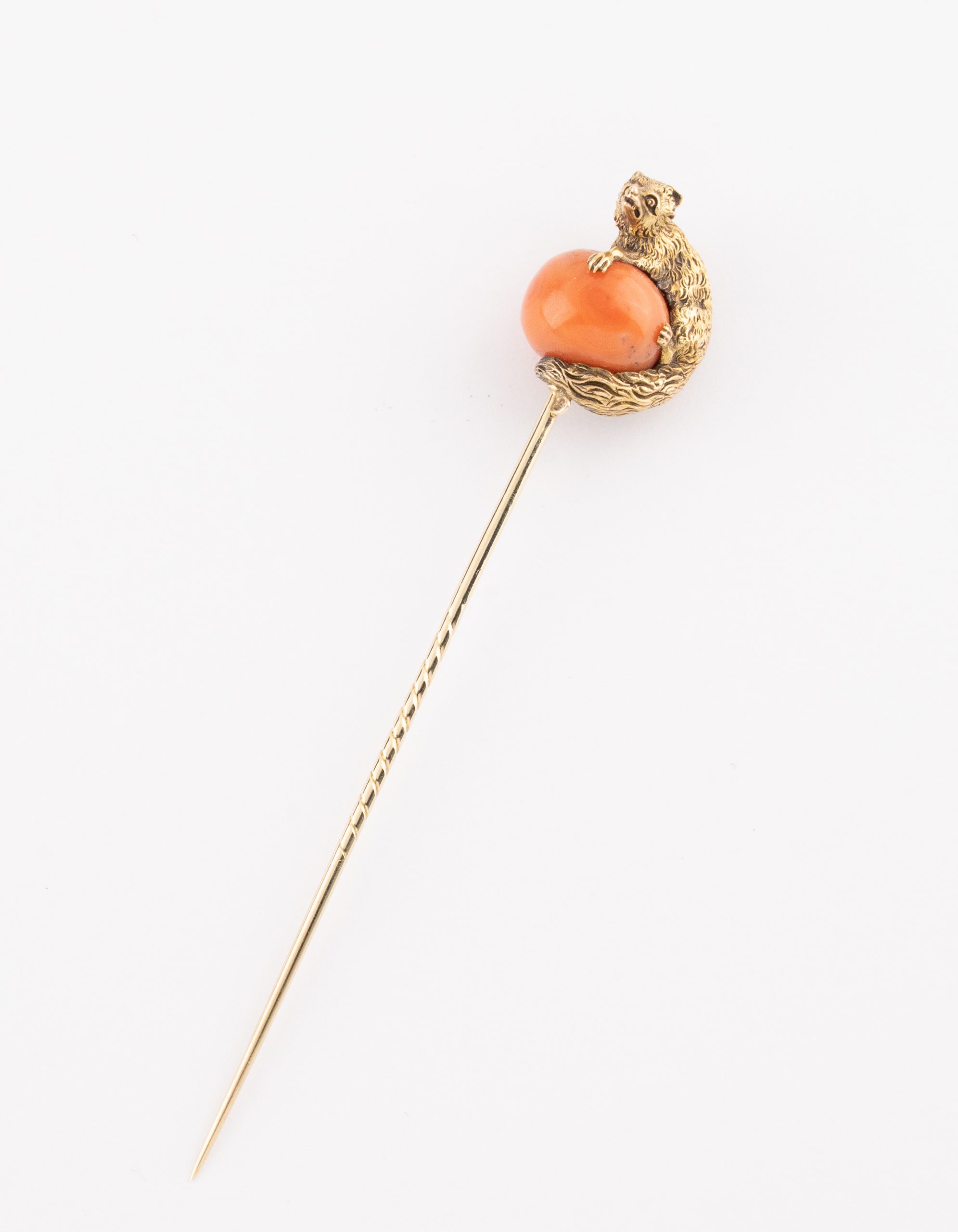 Eine außergewöhnliche Krawattennadel gearbeitet in form eines auf einer Korallenkugel sitzenden Marders in 14 Karat (585/1000)Gelbgold.
