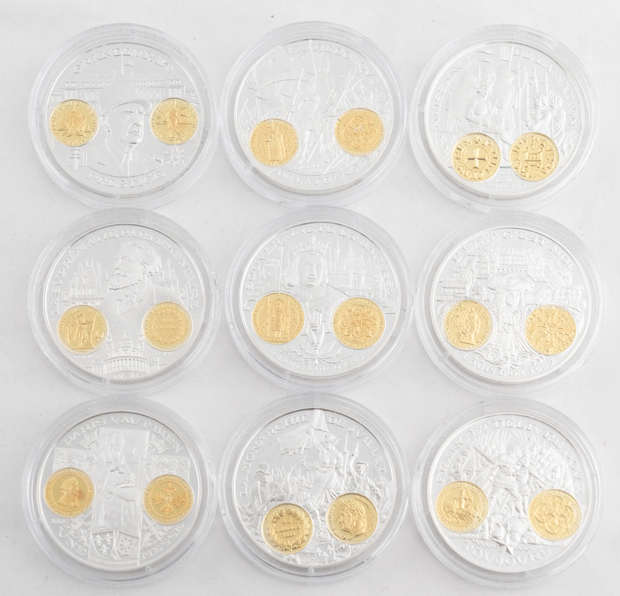 Ein Satz von 29 Medaillen in 999 Silber und teilvergoldet im Etui - 2000 Jahre Währungsgeschichte Frankreich