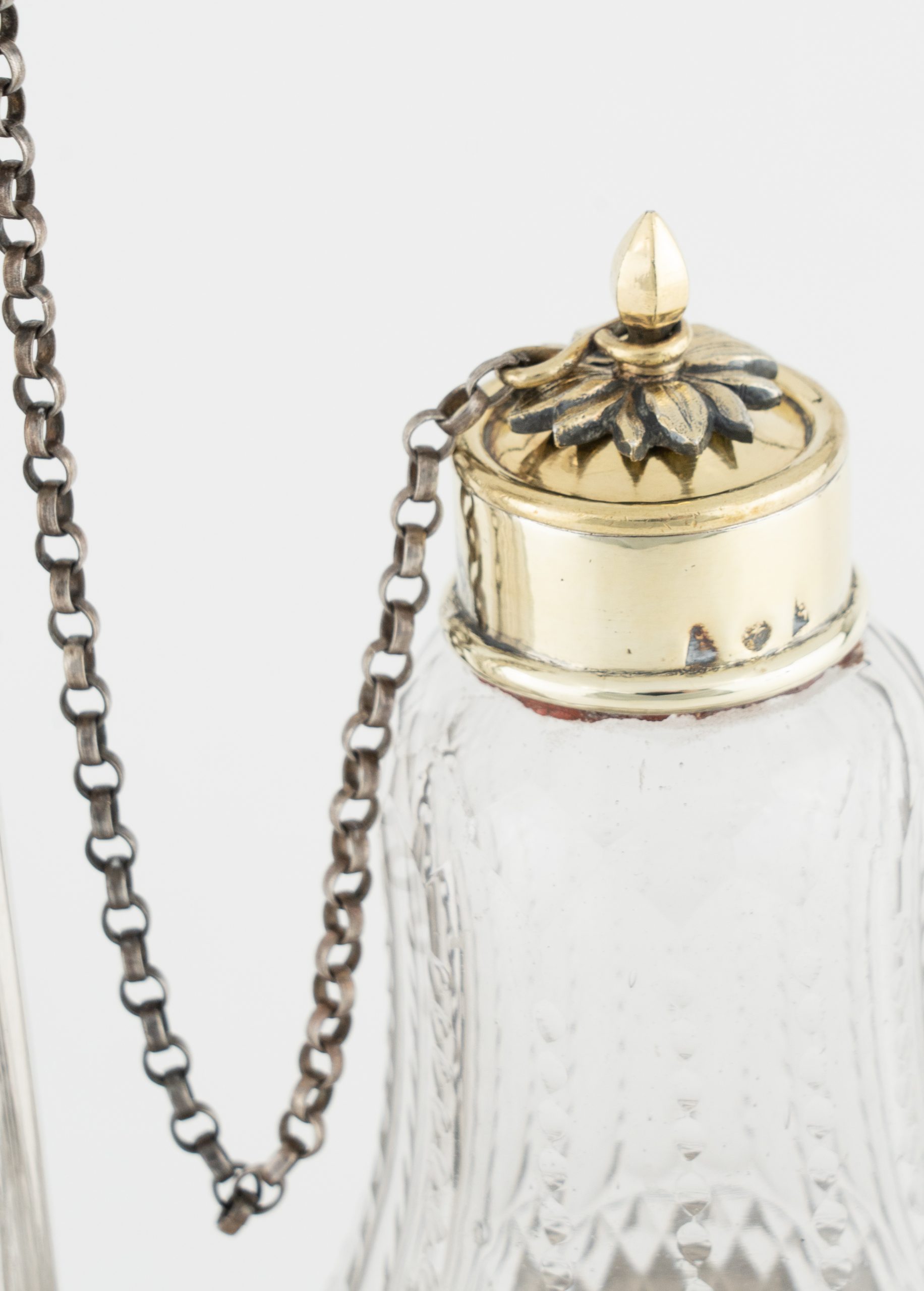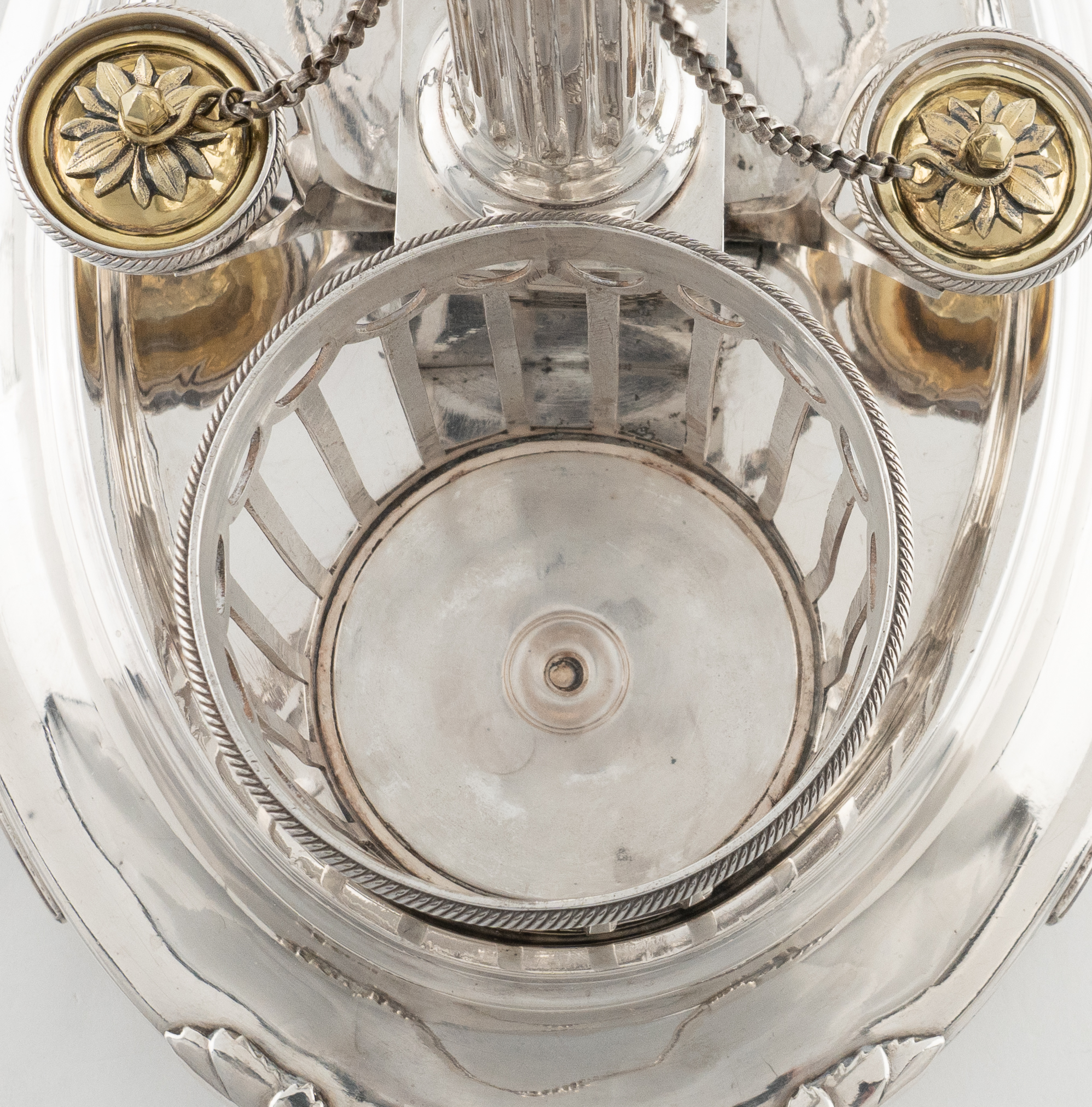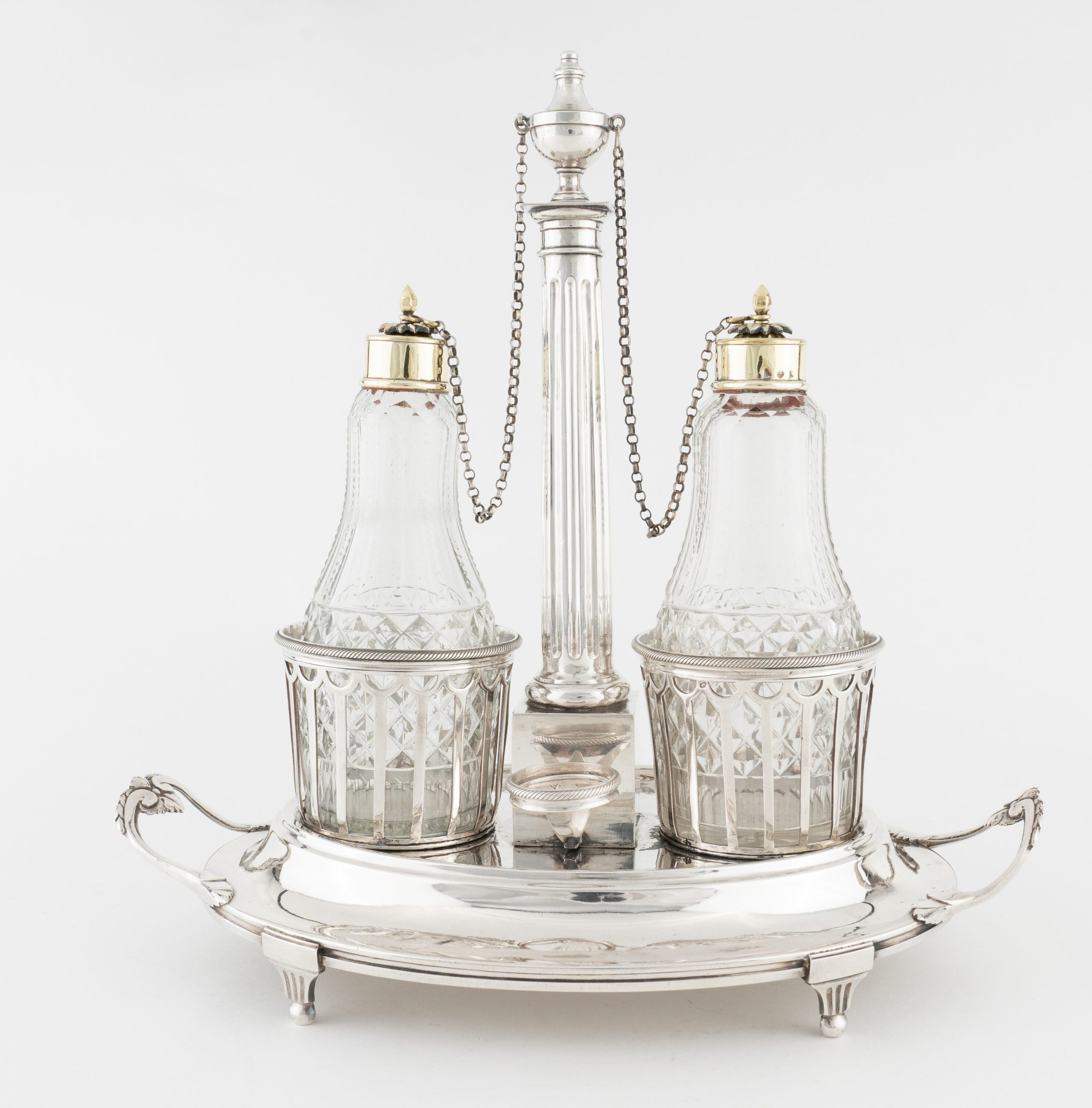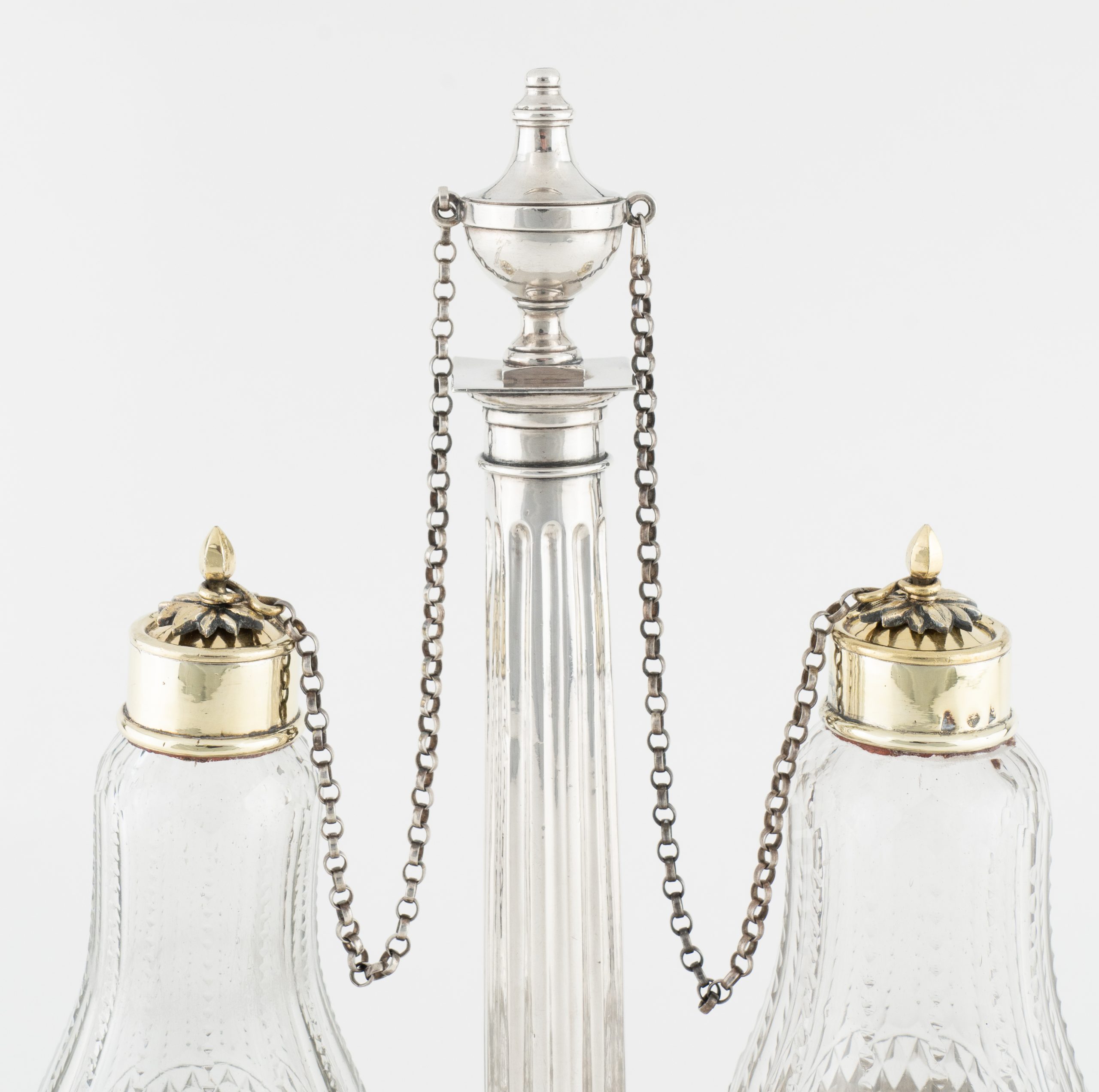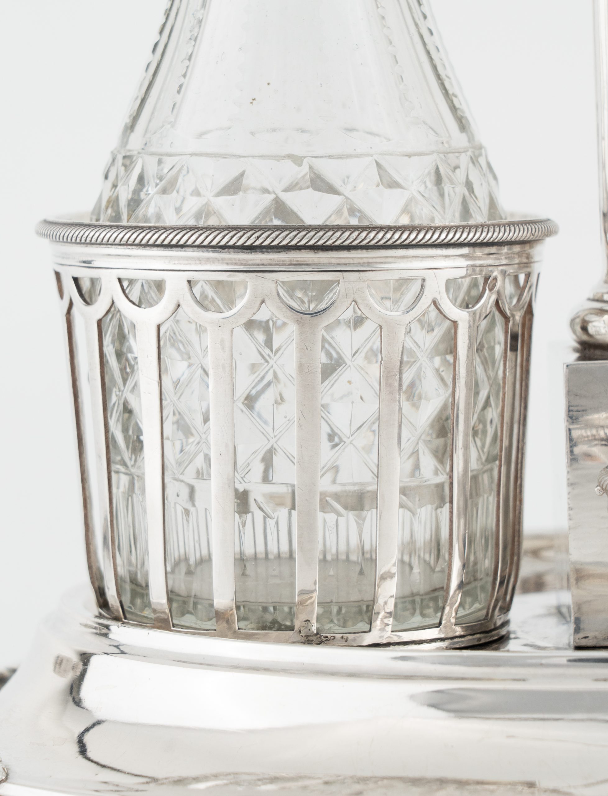 Mittig eine klassizistische Säule, die Glashalter durchbrochen gearbeitet. Seitlich am Postament der Säule zwei Halterungen für die Stöpsel. Flaschen in geschliffenem Kristallglas mit Silbermontierung und Stöpsel in Silbervergoldet.