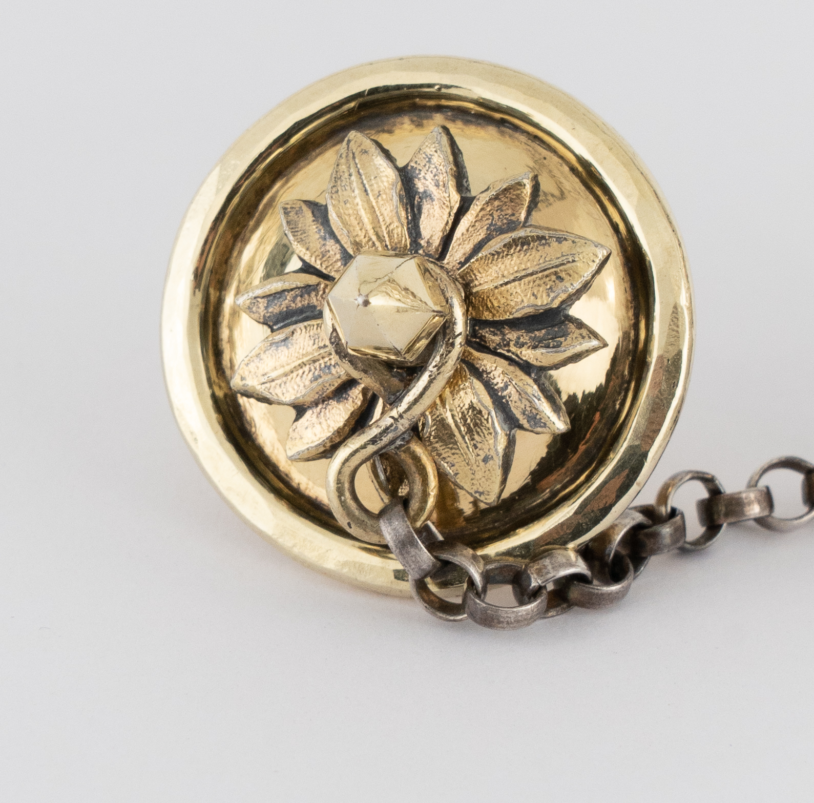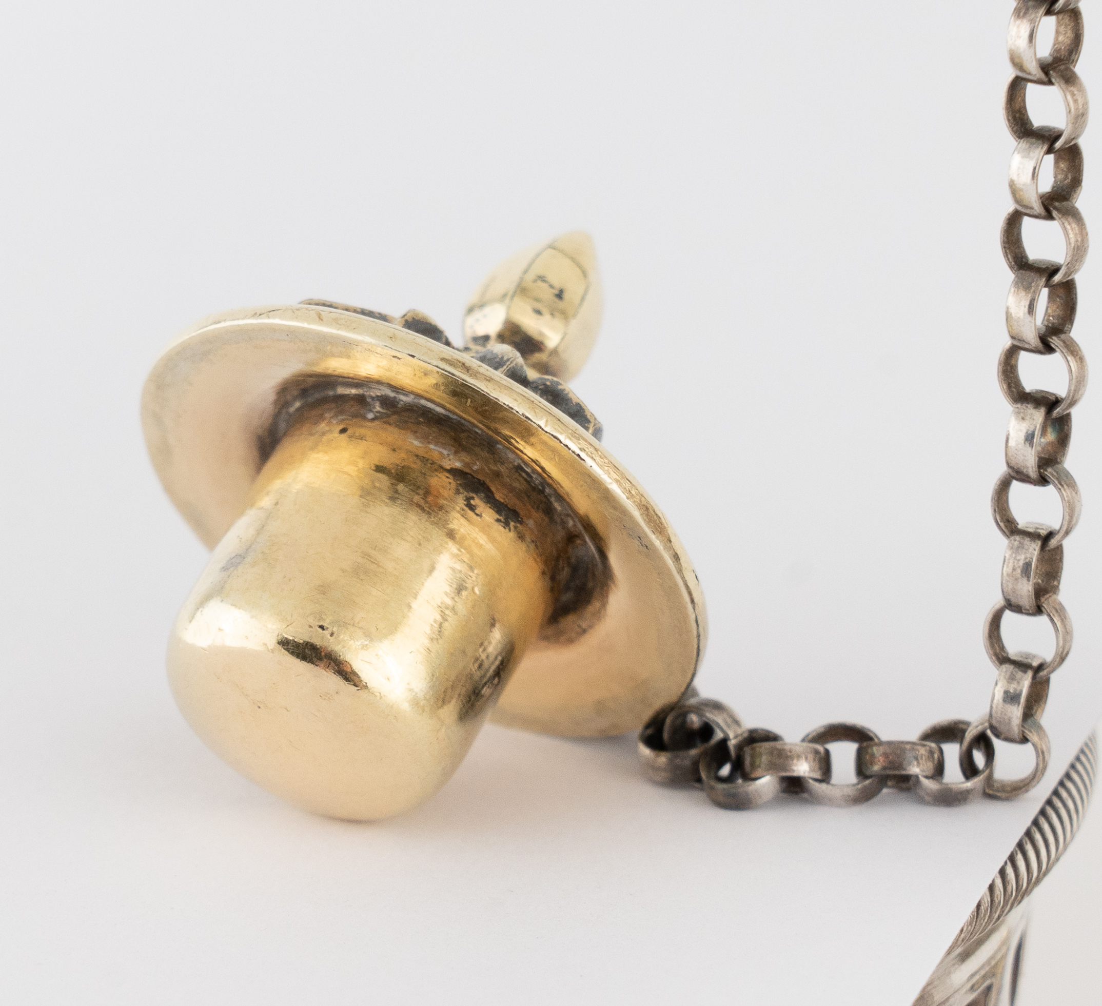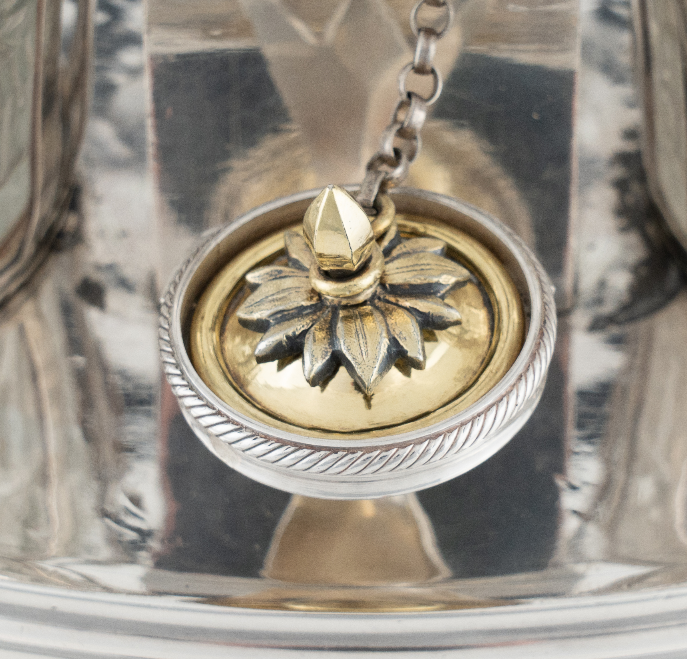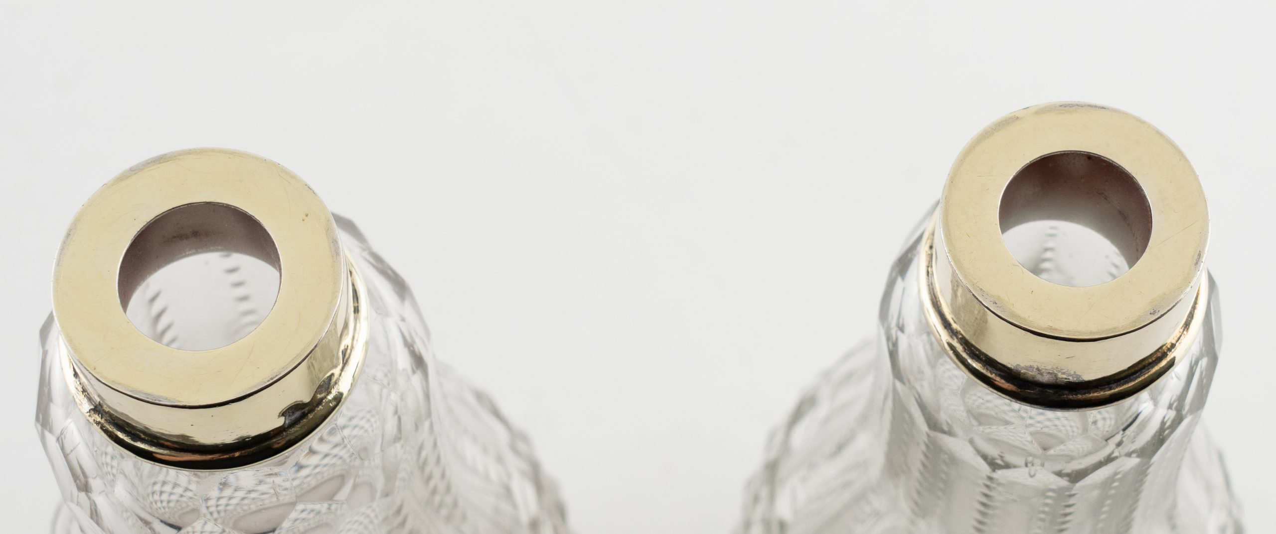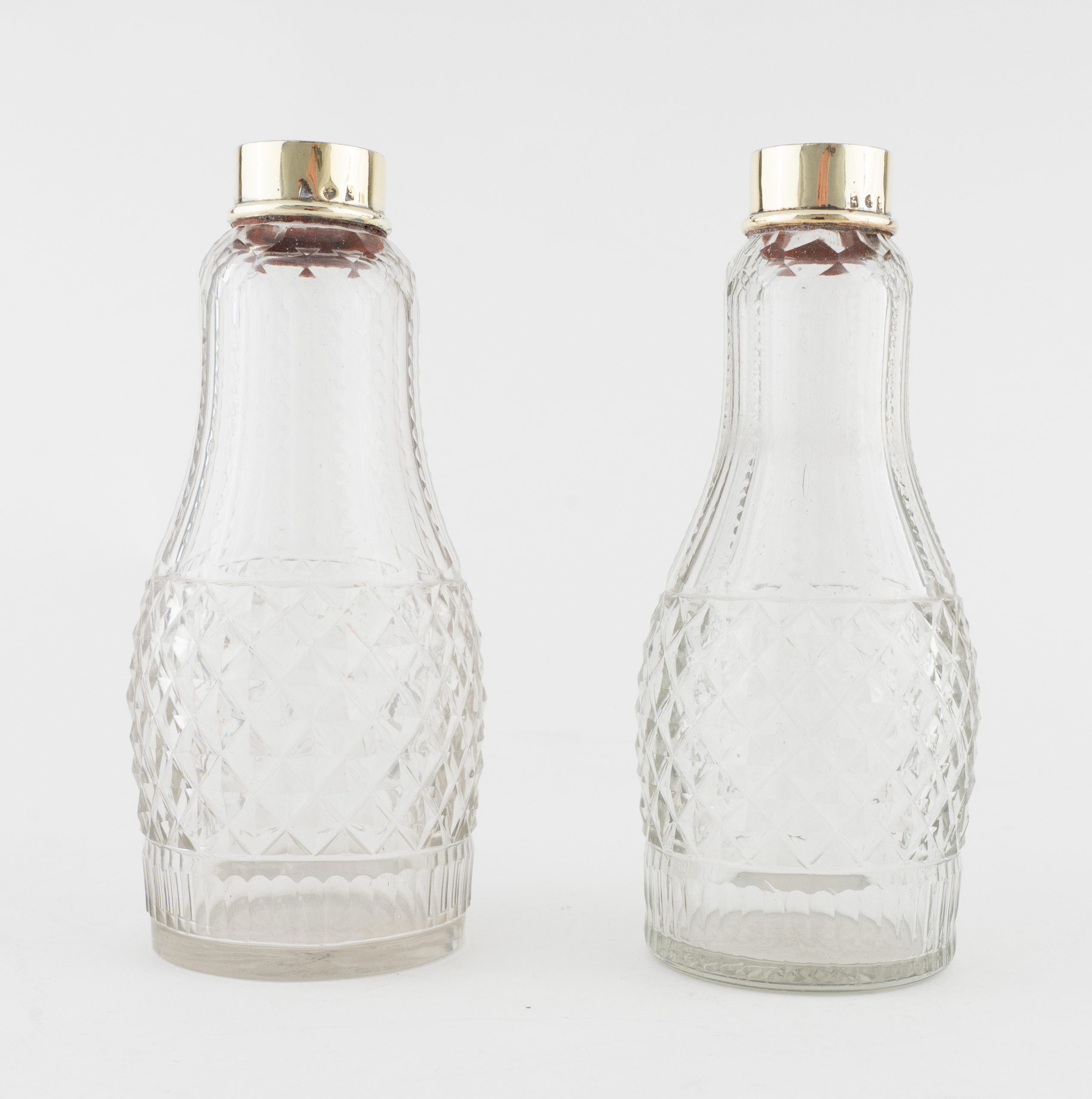 Mittig eine klassizistische Säule, die Glashalter durchbrochen gearbeitet. Seitlich am Postament der Säule zwei Halterungen für die Stöpsel. Flaschen in geschliffenem Kristallglas mit Silbermontierung und Stöpsel in Silbervergoldet.