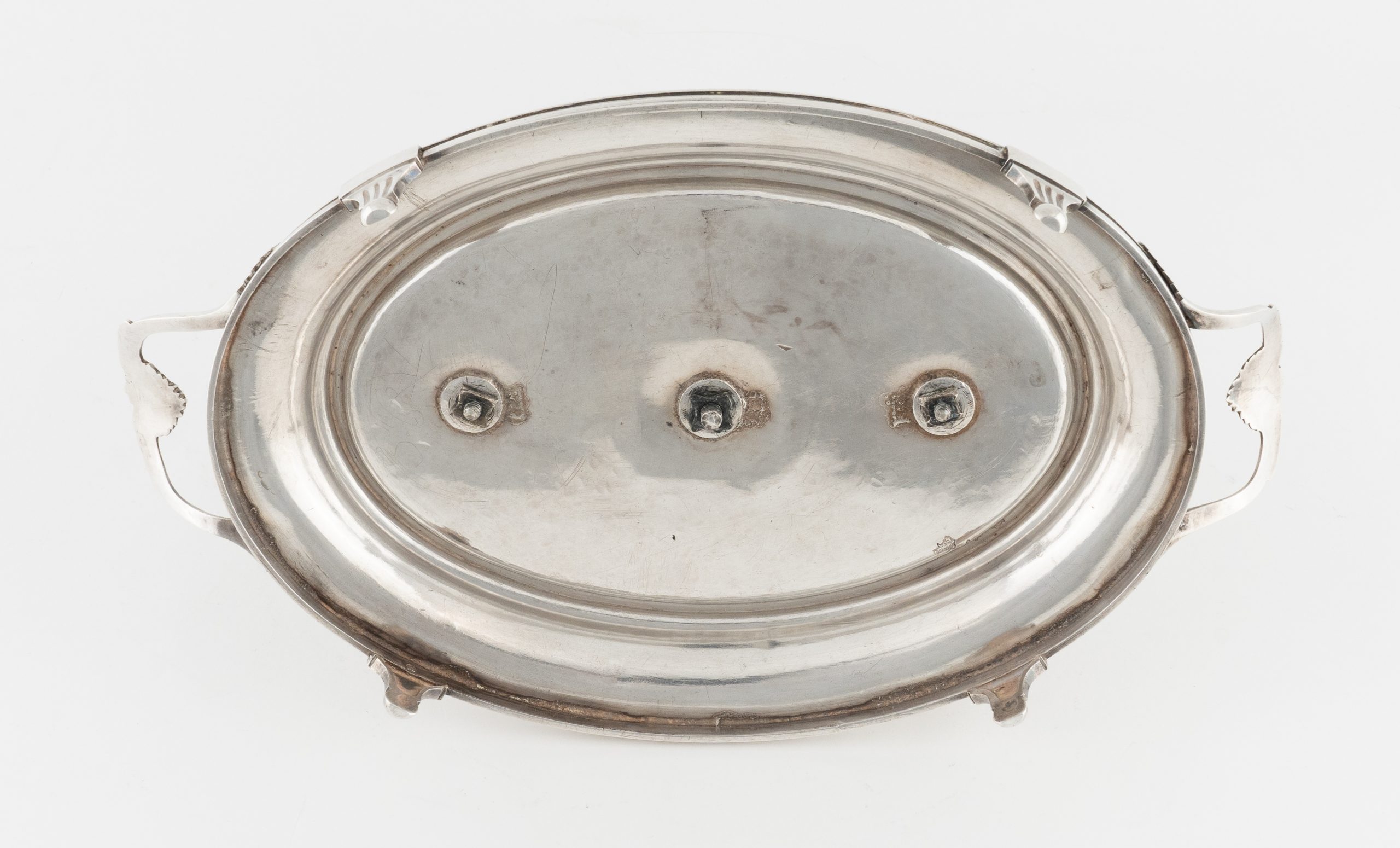 Ovales Plateau auf vier Füßen mit 2 Henkeln.