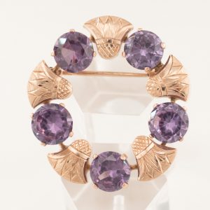 Eine Brosche in 14 Karat Gelbgold mit 5 Amethysten