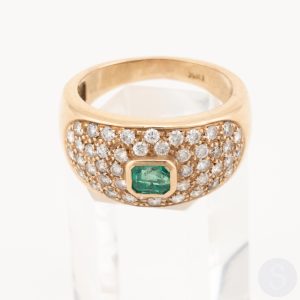 Ein Ring in 18 Karat Gelbgold mit einem Smaragd und 46 Brillanten